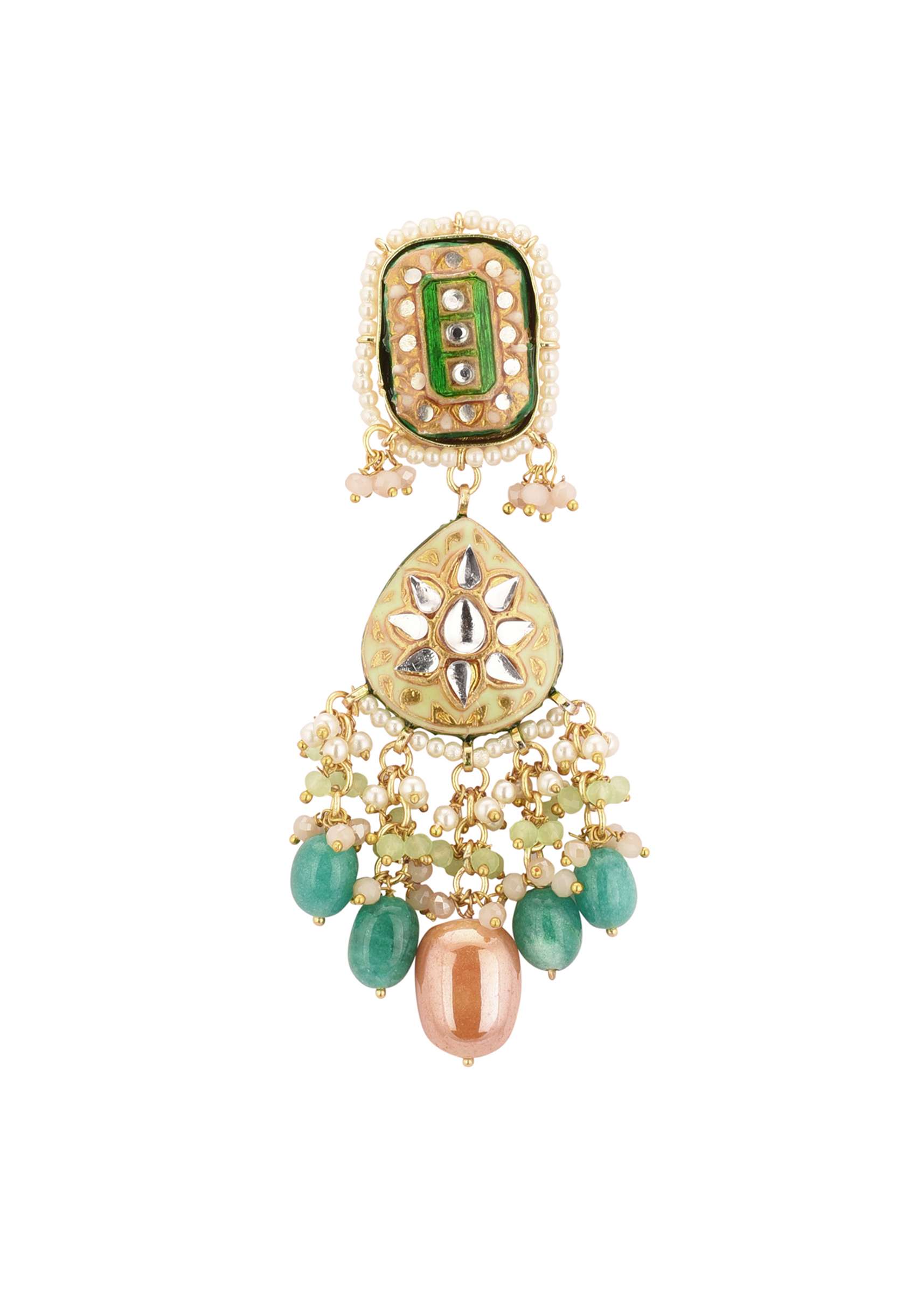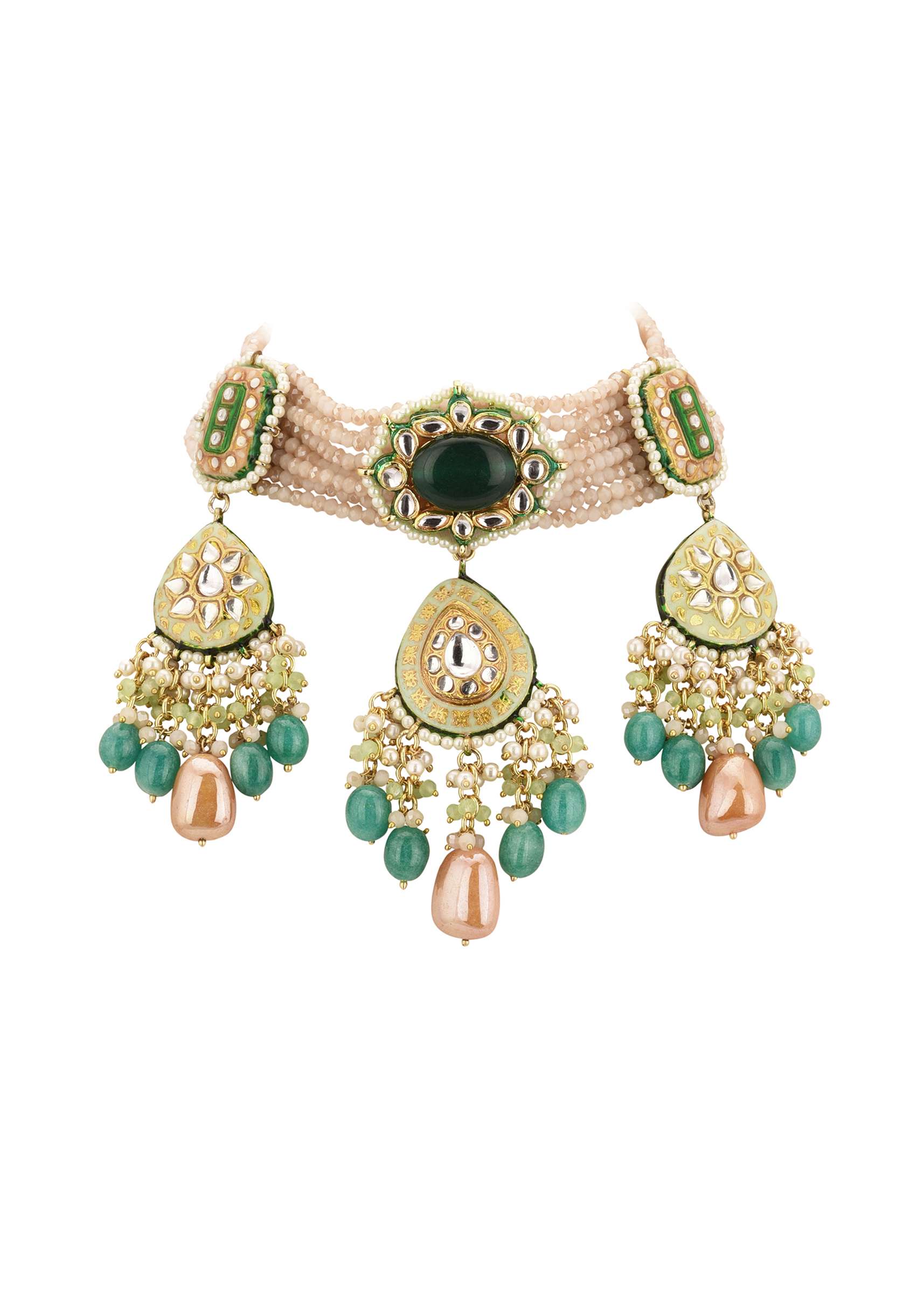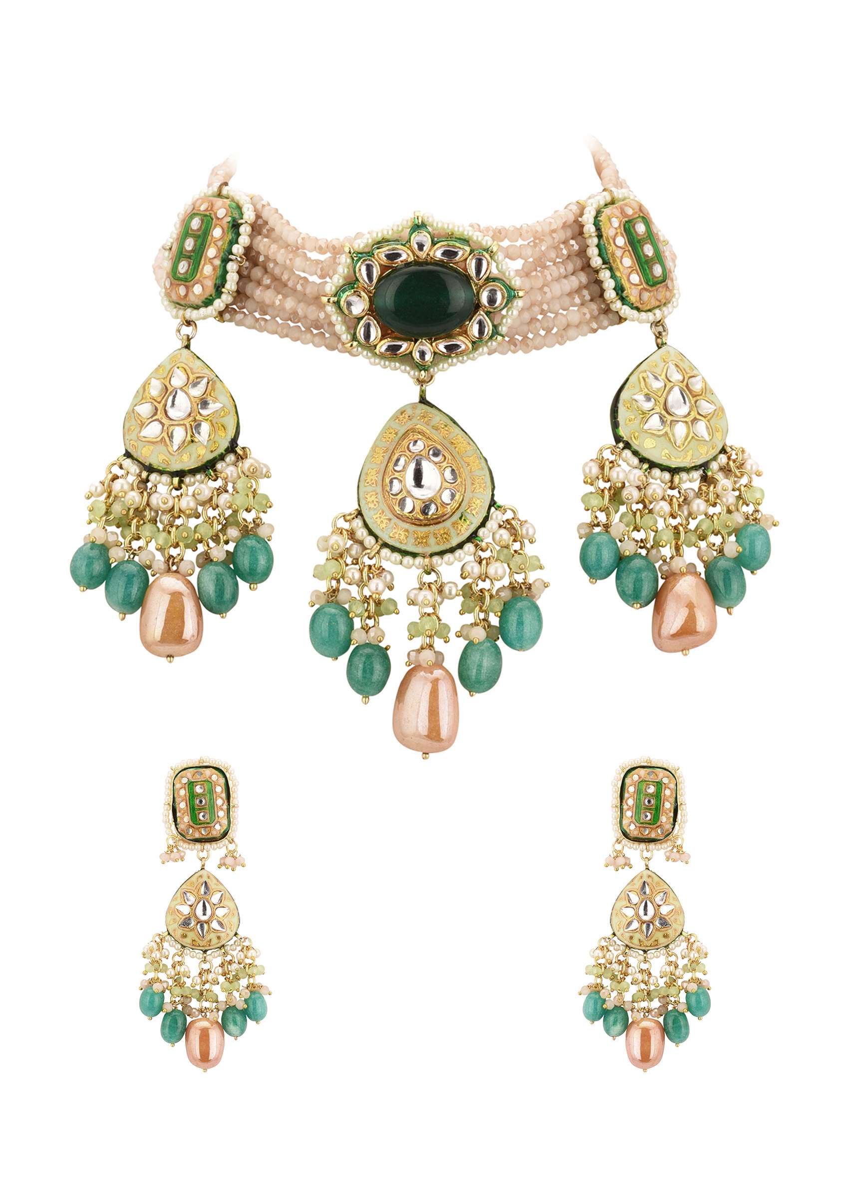 Introducing our multicolor gold-finish kundan choker necklace and earring set in mixed metal.This set features detailed kundan work, rich meenakari work, and sparkling drop-stones that create a mesmerizing design. EVENT - Perfect for weddings, engagements, or parties.Avoid contact with water, chemicals, harsh liquids, perfumes, etc.Do not wear this piece of jewelry while showering, gymming, swimming, etc.Hard contact must be avoided completely.Please keep the product away from moisture and humidity when not in use.Baroque pearls and Natural stones can range from minor aberrations to distinctly ovoid, curved, pinched, or lumpy shapes.Slight variations in design may vary. Awarded as the Most Trusted Brand, we're delivering styles you love, just as promised.