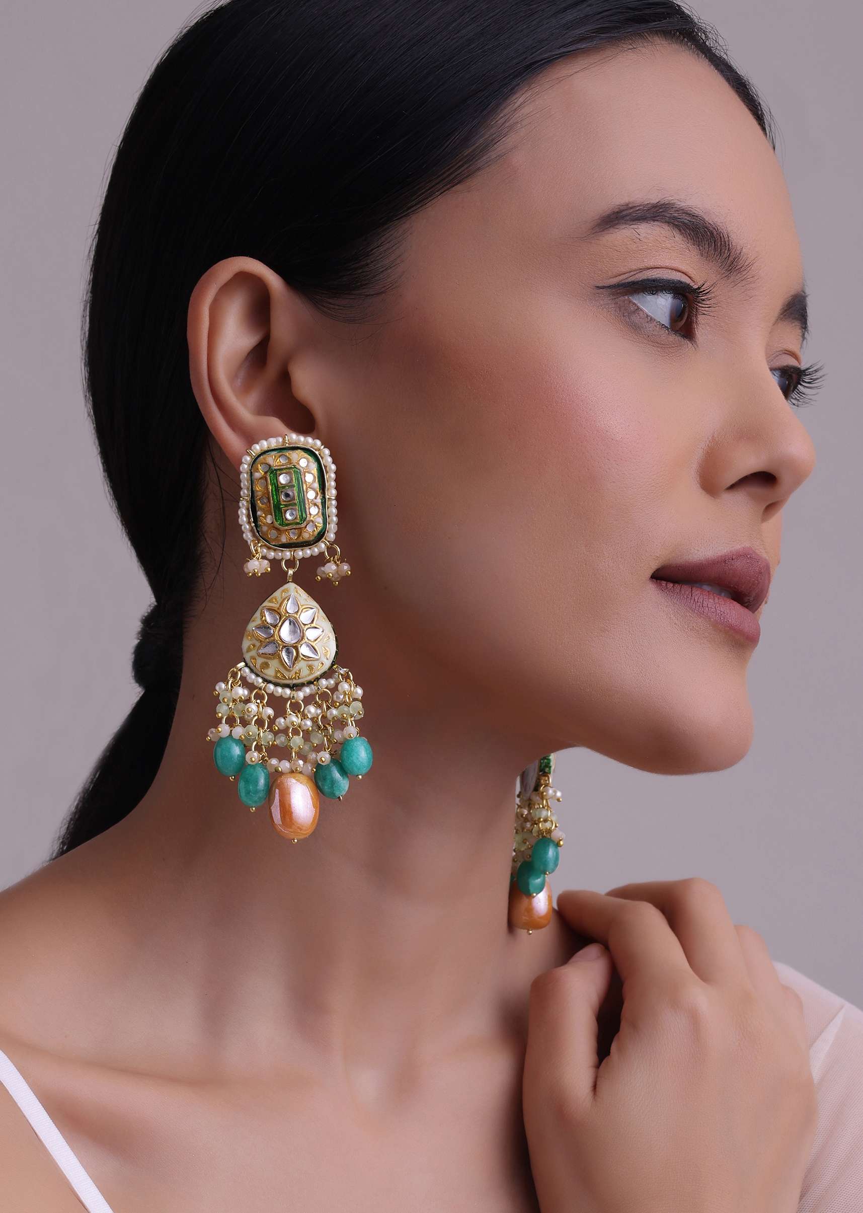 A solid color saree or a traditional salwar kameez would make the perfect backdrop for this stunning piece of jewelry.