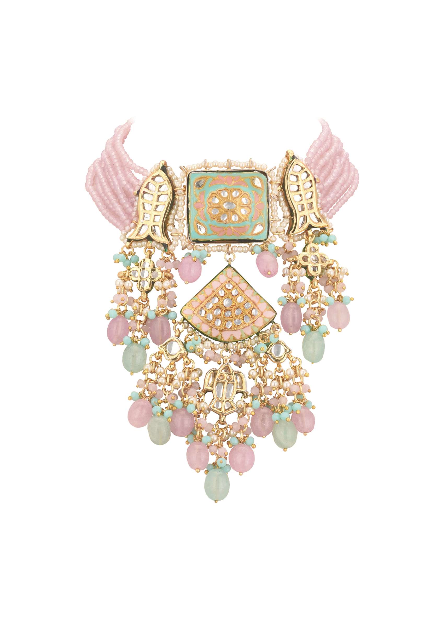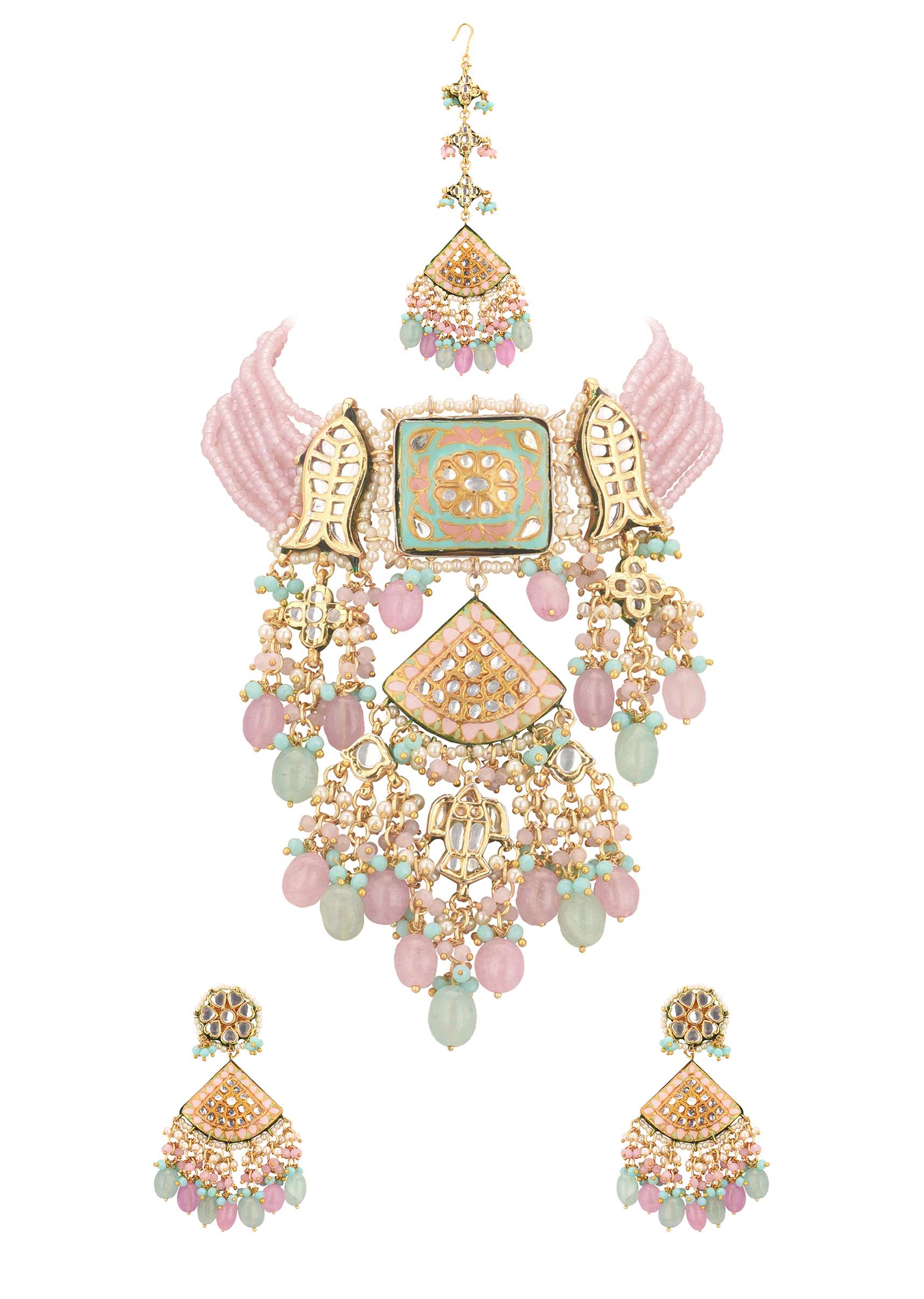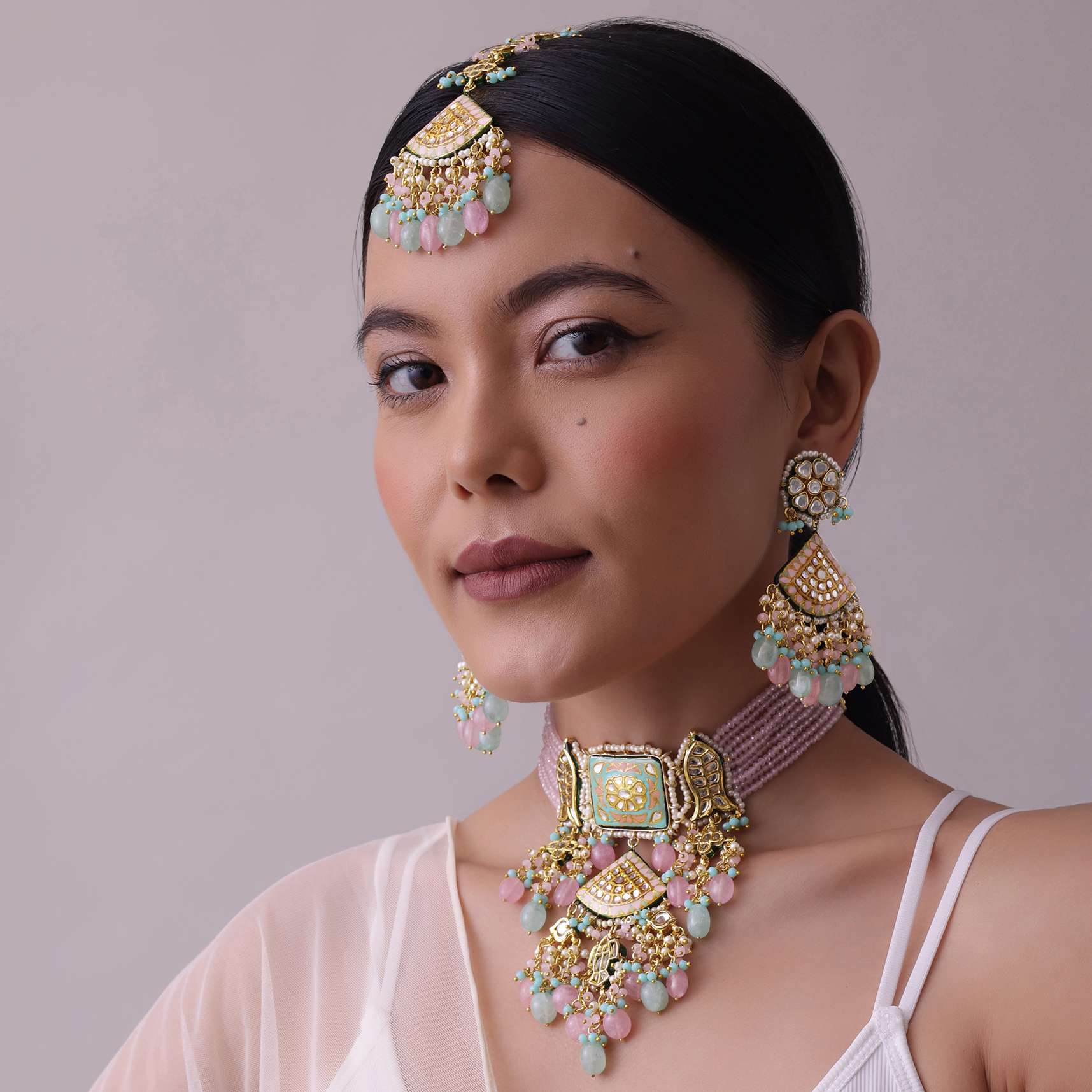 Introducing our gold-finish kundan choker necklace and earring set, an intricate piece of jewelry that will add a touch of glamour to any outfit. The choker necklace and earrings feature a beautiful blend of traditional kundan work, colorful meenakari work, and shimmering stones, creating a truly captivating and unique design.EVENT - Perfect for any formal occasion, such as weddings or parties. Avoid contact with water, chemicals, harsh liquids, perfumes, etc.Do not wear this piece of jewelry while showering, gymming, swimming, etc.Hard contact must be avoided completely.Please keep the product away from moisture and humidity when not in use.Baroque pearls and Natural stones can range from minor aberrations to distinctly ovoid, curved, pinched, or lumpy shapes.Slight variations in design may vary. Awarded as the Most Trusted Brand, we're delivering styles you love, just as promised.