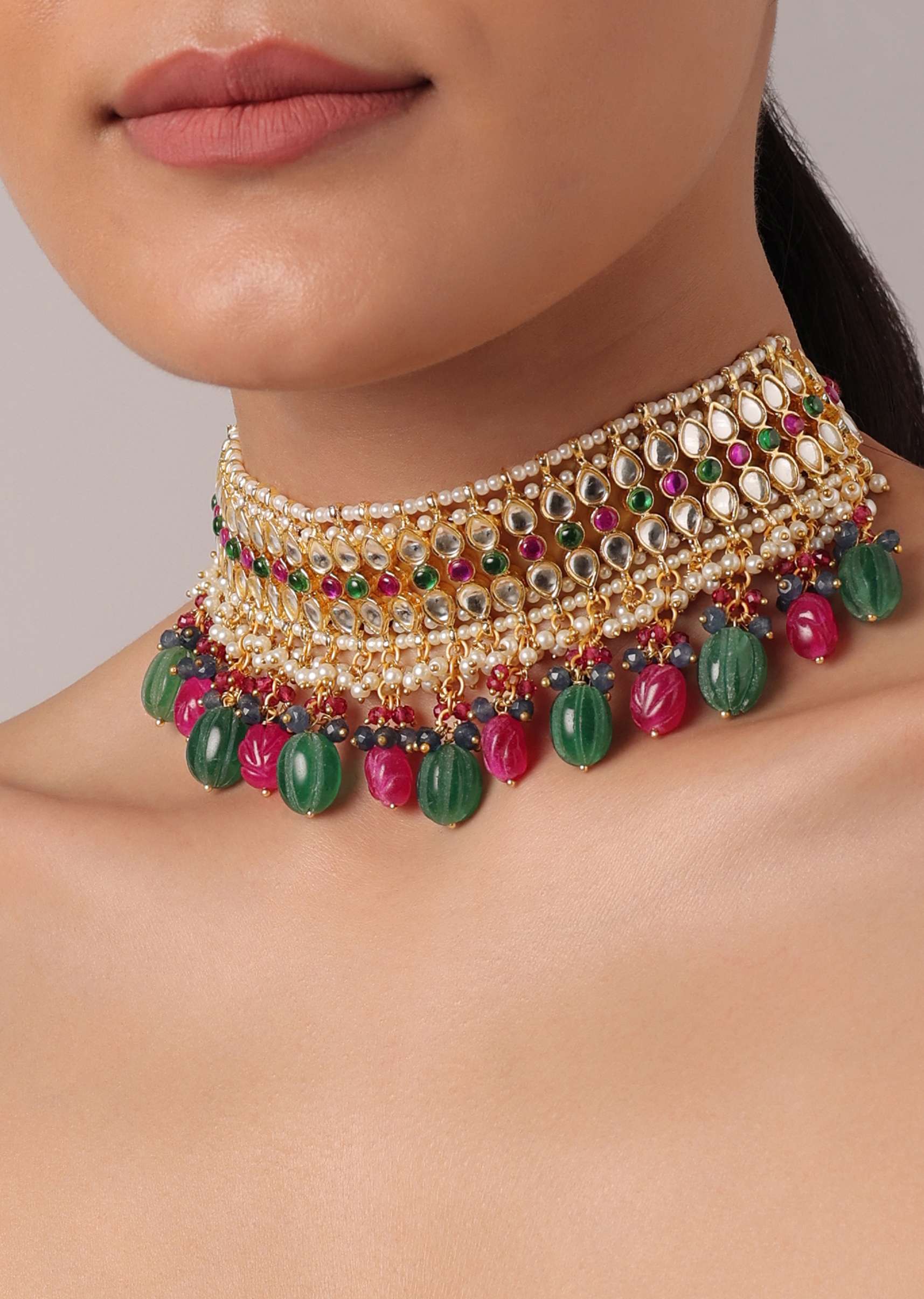 An ideal match for grandeur wedding celebrations this ethereal choker set exudes grace and charm. Adorned with delicate cut kundan it is beautified with multi hued stone drops. Crafted in a stylish design it flaunts stunning artistry. Paired with circular motif danglers don this stunner for an effortless royal look. Keep away from moisture perfume alcohol and harsh chemicals.Spot clean only.Keep away from sharp objects. Awarded as the Most Trusted Brand, we're delivering styles you love, just as promised.
