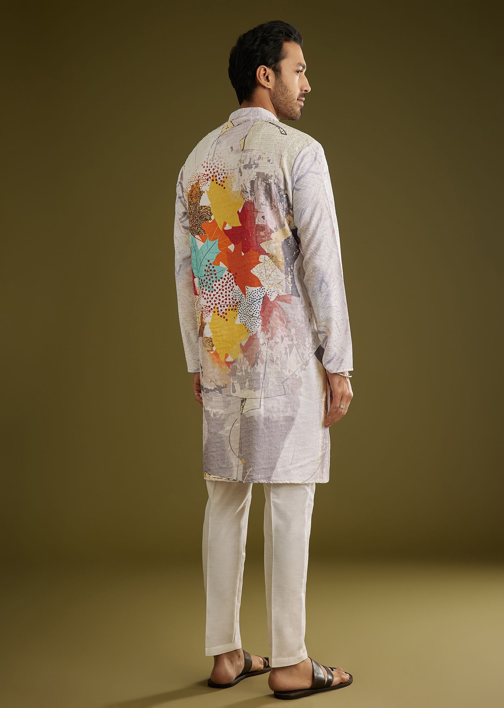 Multicolor Linen Zipper Kurta Set With Abstract Leaf Prints