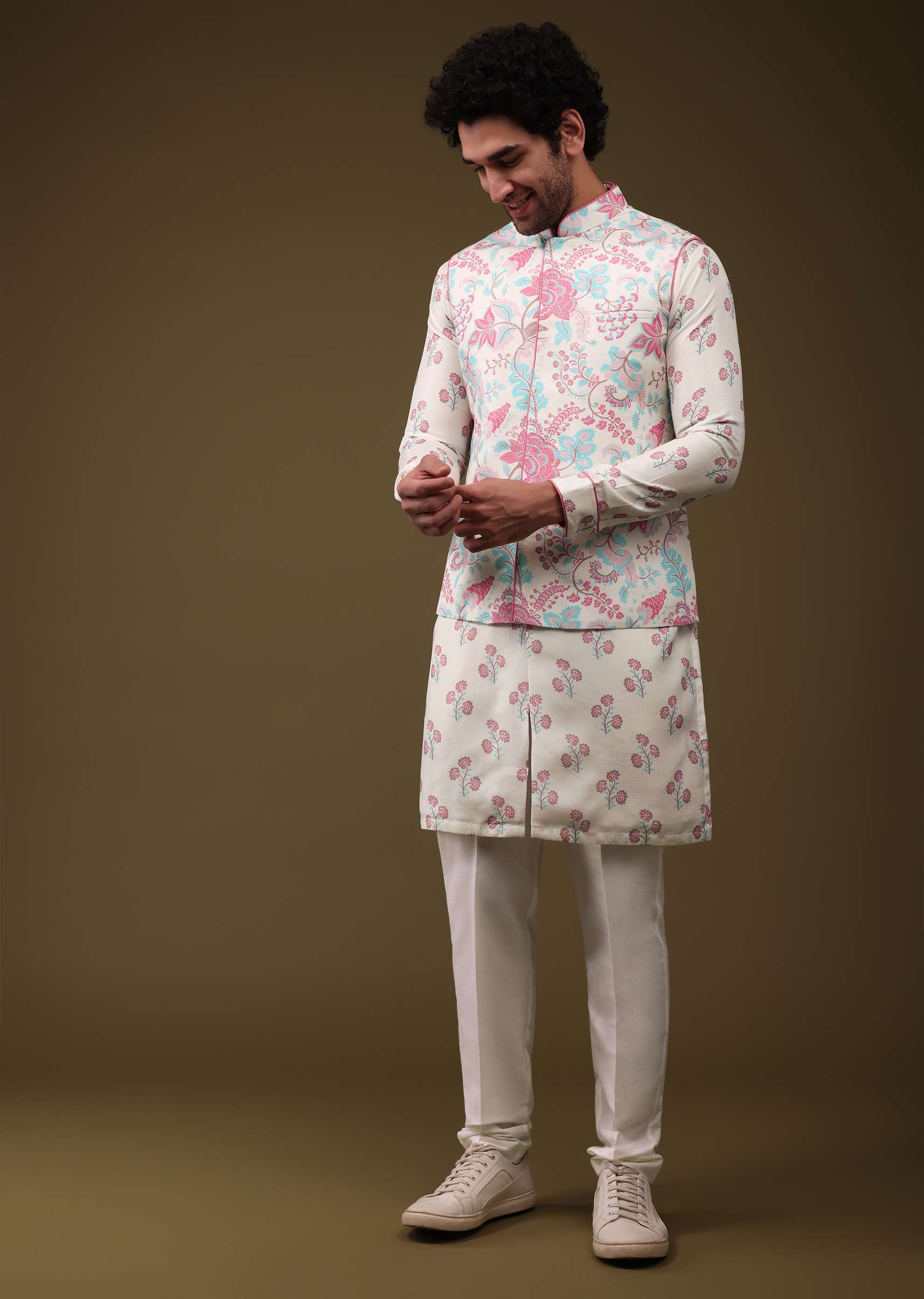 With the addition of gold accessories, the gold tones in the floral print of this jacket kurta combination can be accentuated. The look can be improved with the addition of a gold watch, pair of cufflinks, or brooch.