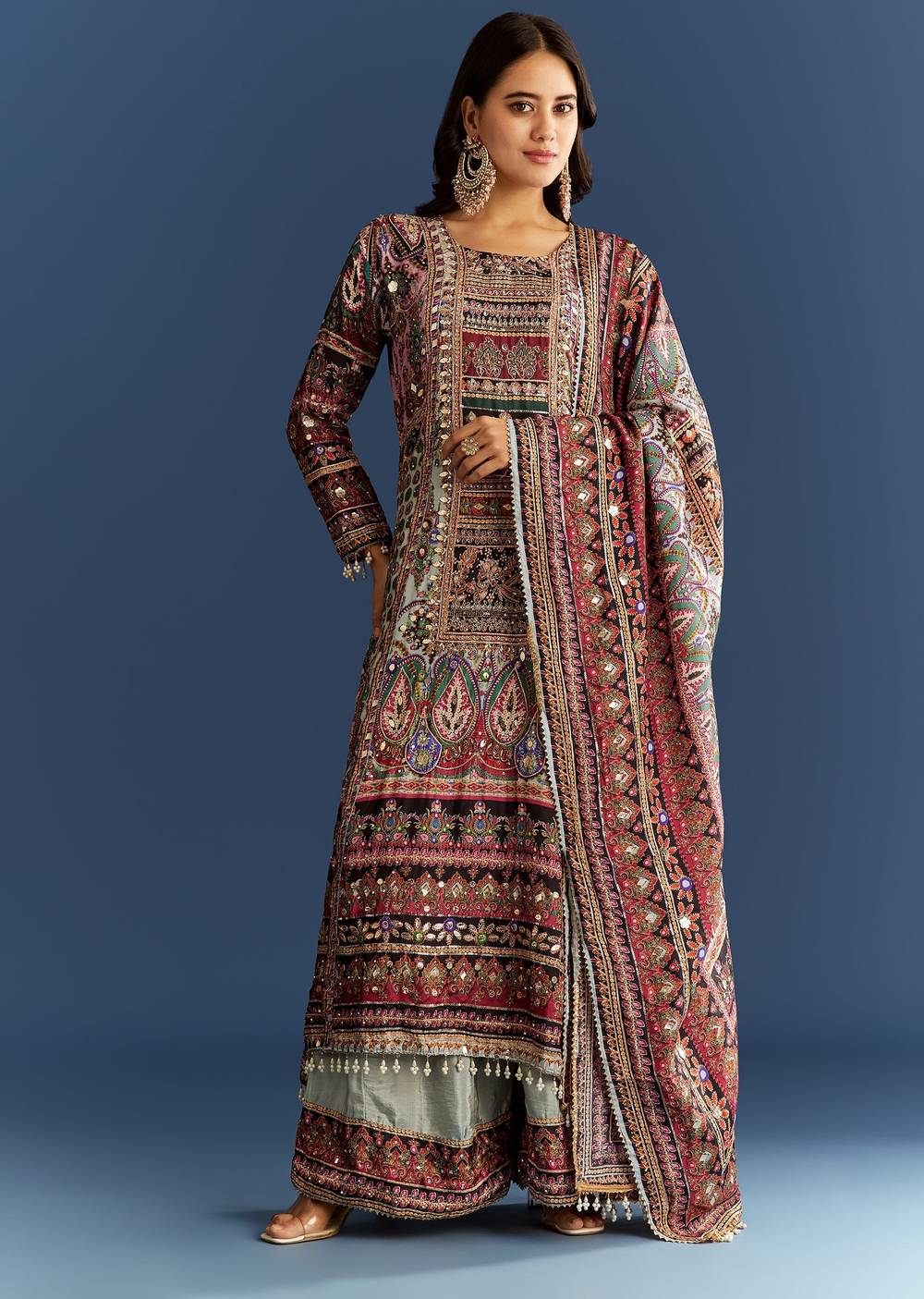 Vibrant and eye-catching, this multicolor kurta set in tabby silk features patch, stone, and zari work paired with a playful printed dupatta.