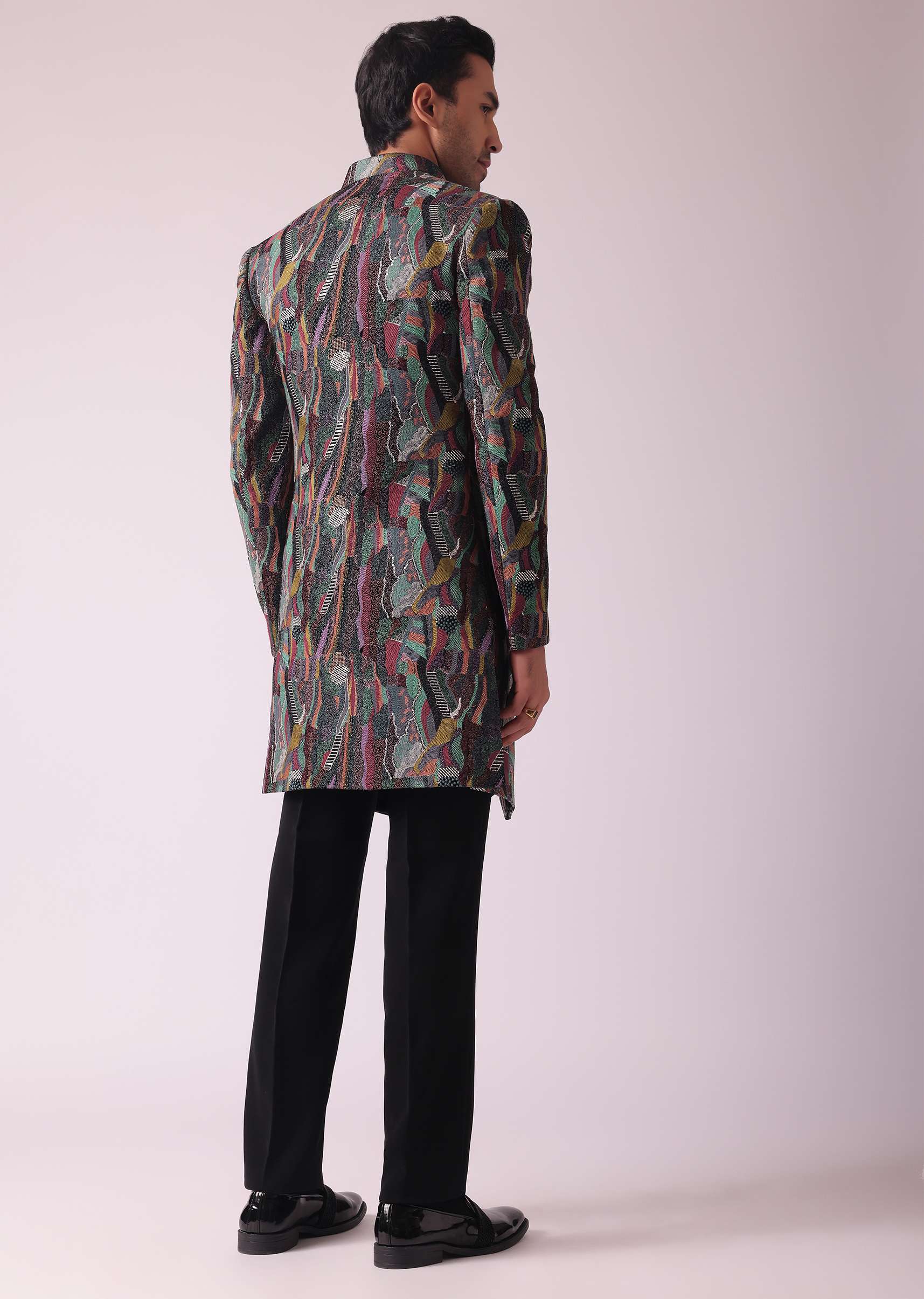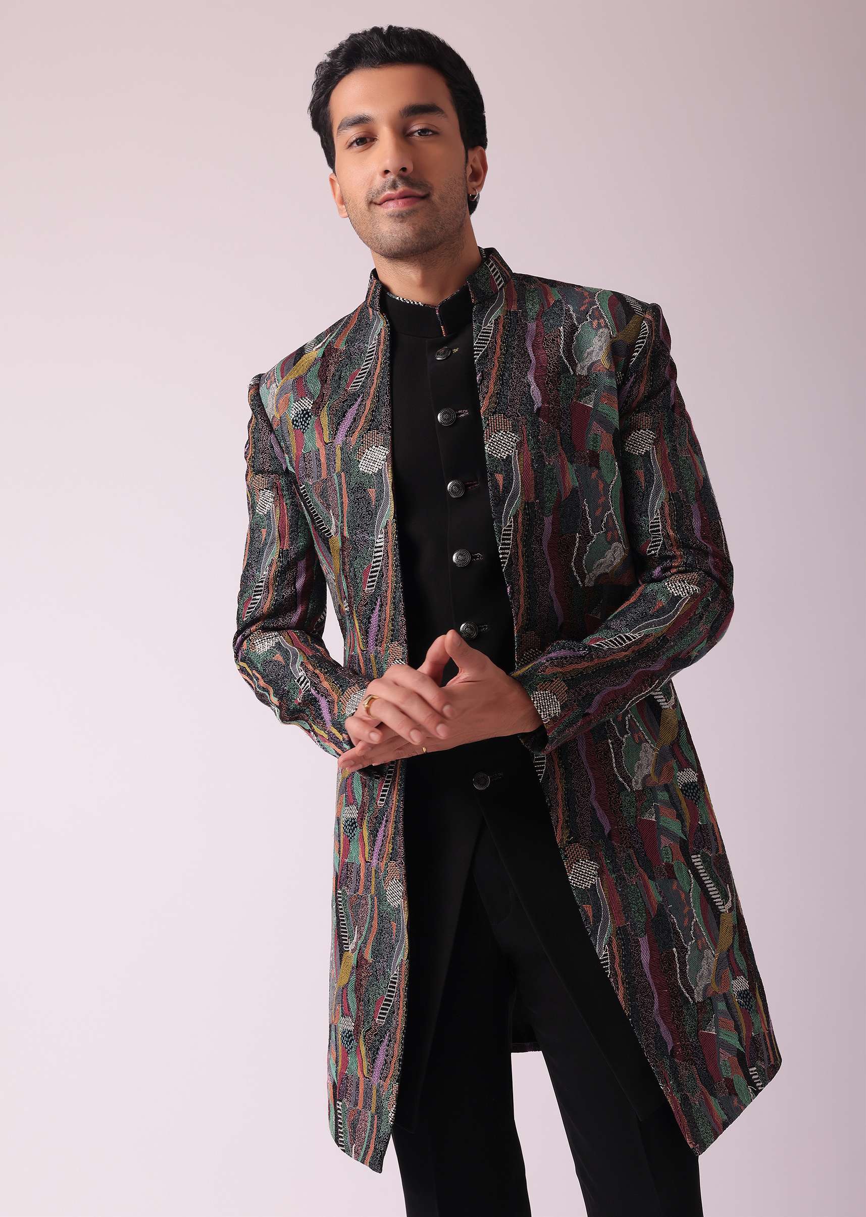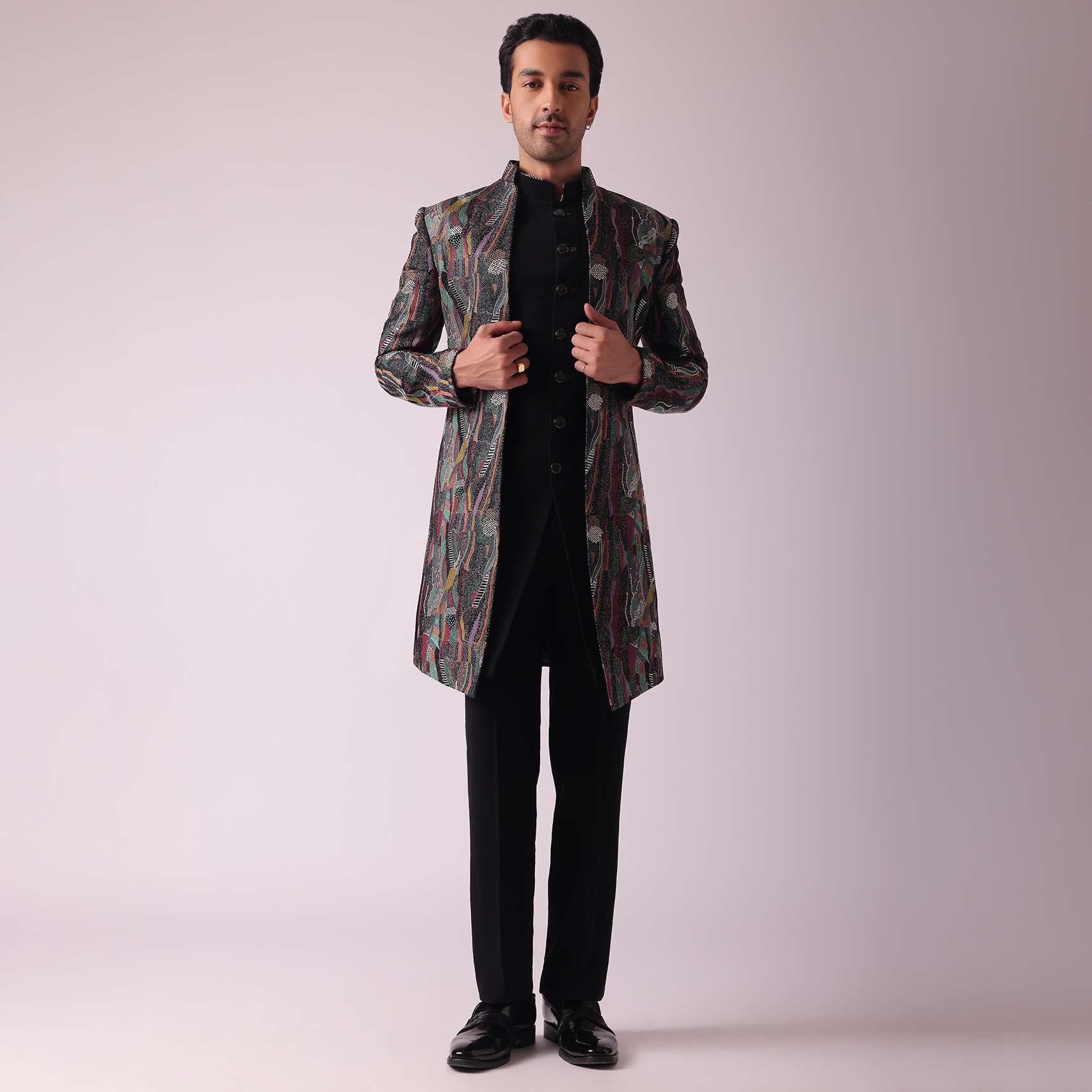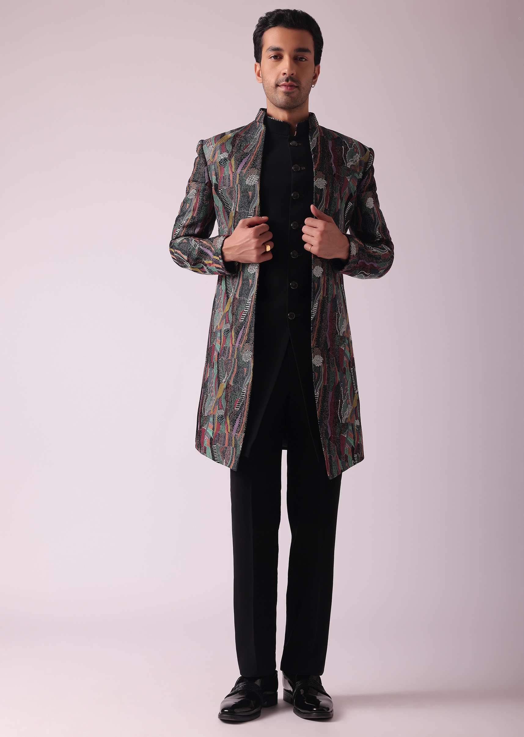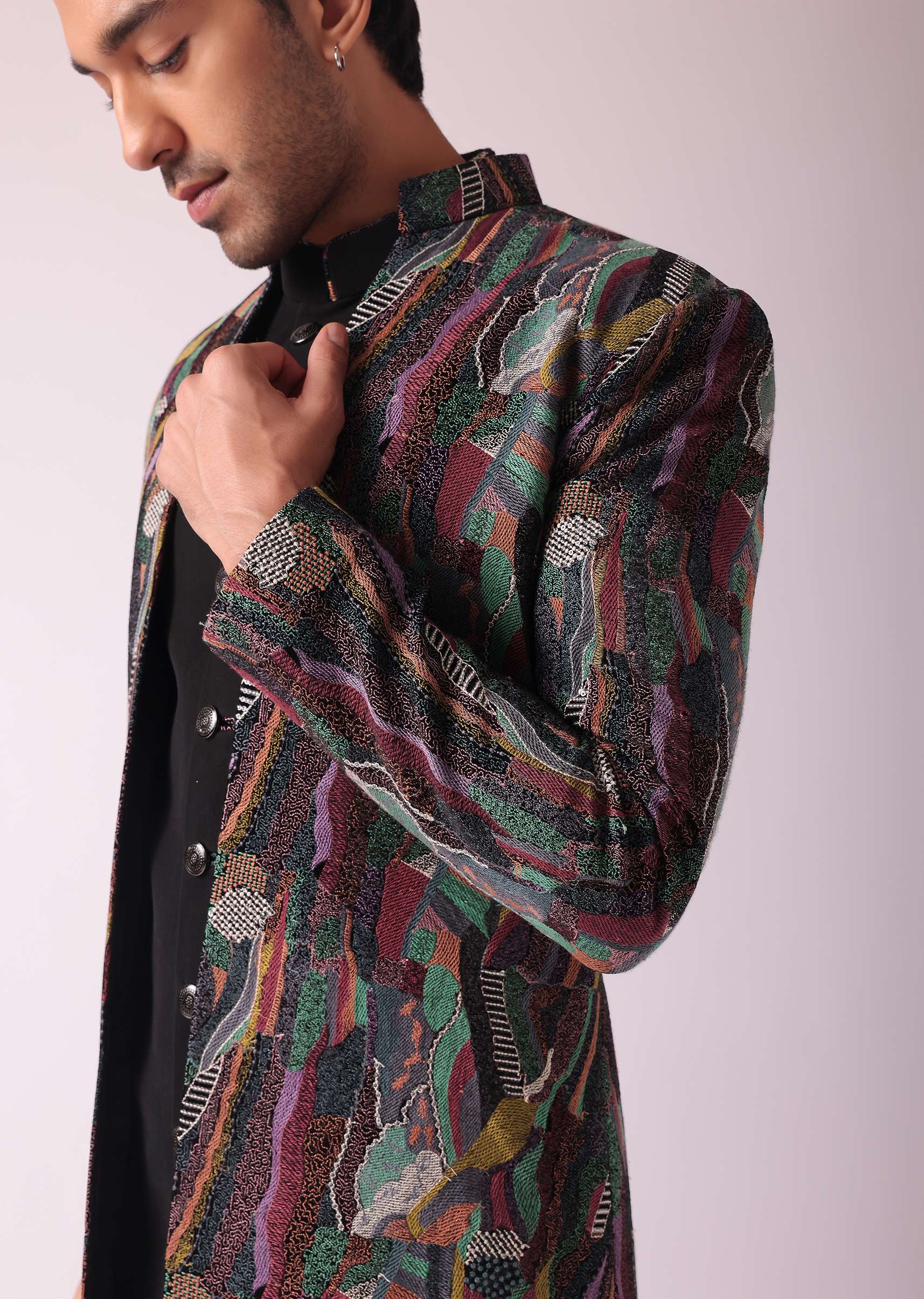Step into the realm of bold sophistication with our multicolor textured indowestern in sumptuous velvet. The machine embroidery on the indowestern adds an exquisite touch while it is expertly paired with a black imported jacket in premium suiting fabric. EVENT - The set is completed with trousers making it an ideal choice for events like sangeet and receptions.Change folds regularly. Awarded as the Most Trusted Brand, we're delivering styles you love, just as promised.