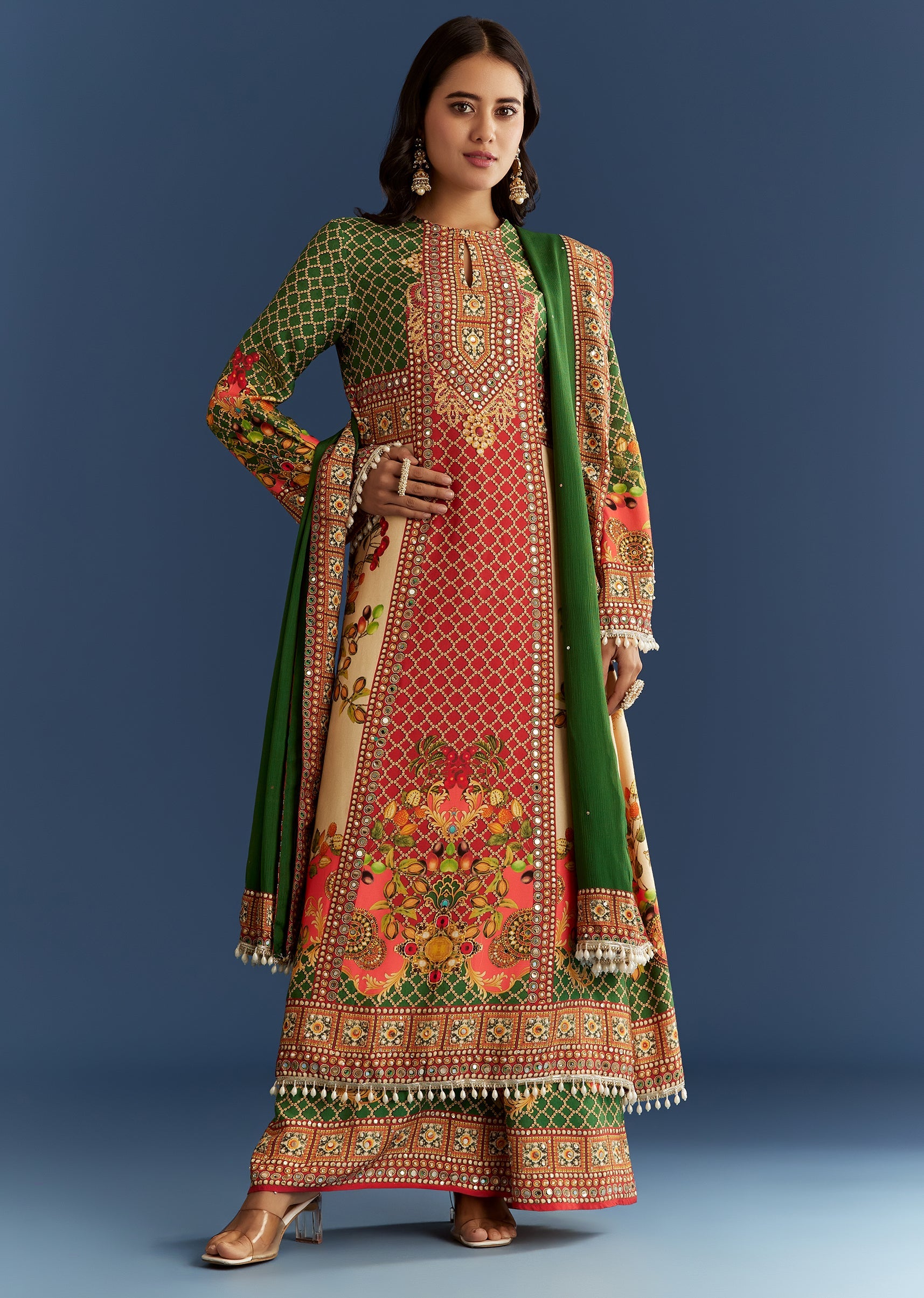 Multicolour Cotton Muslin Printed Kurta With A Line Cut And Printed Palazzo