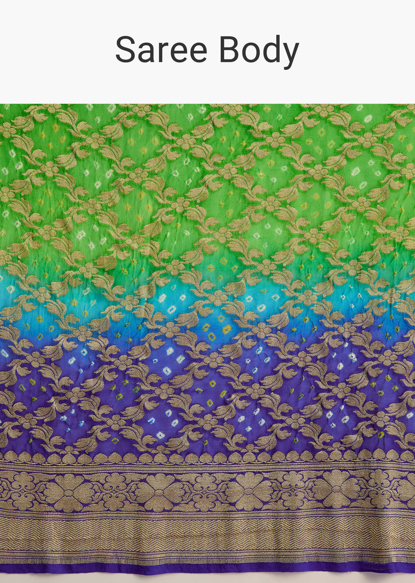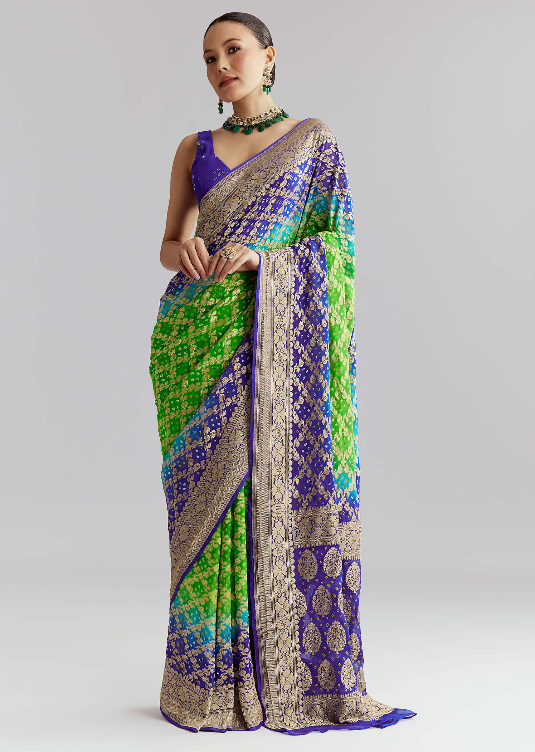 For colour that moves, this multicolour khadi georgette woven saree blends blue and green shades with a delicate touch of bandhani. A woven jaal sweeps the body, the border frames... More Product Details