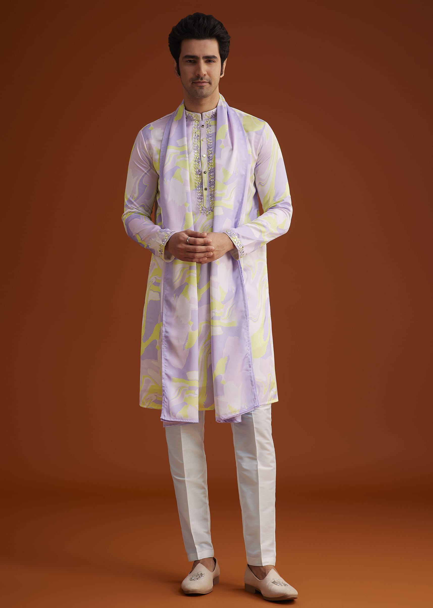 Pair this kurta set with ivory churidar pants and neutral-toned footwear for a polished look. A sleek wristwatch will complete the ensemble beautifully.