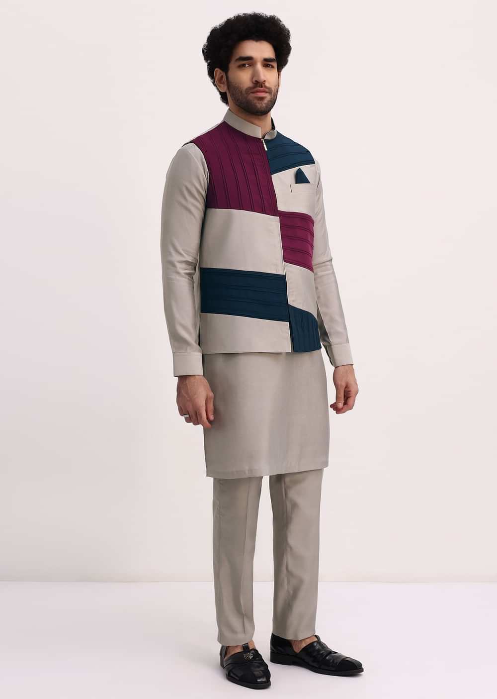Unleash your inner artist at the soiree with this audacious kurta jacket set. Crafted from plush terry rayon, the multicolored ensemble offers a captivating play of textures. The kurta boasts meticulous pintuck detailing for a touch of understated elegance, while the color-blocked jacket steals the show with its bold pattern. The jacket is paired with a kurta and a pant. Awarded as the Most Trusted Brand, we're delivering styles you love, just as promised.
