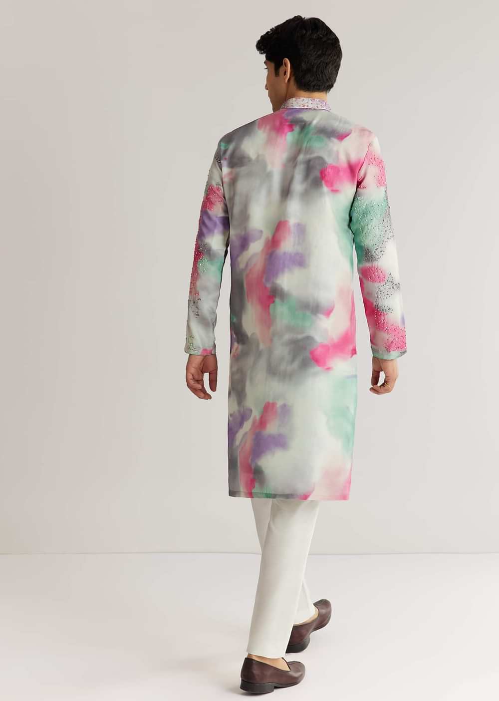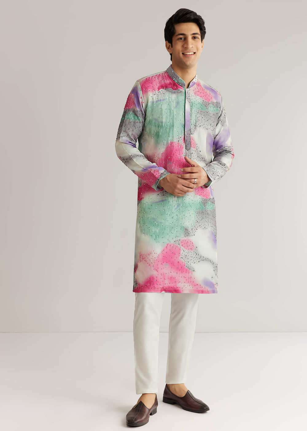 Multicolour Silk Abstract Printed Kurta Set With Sequins