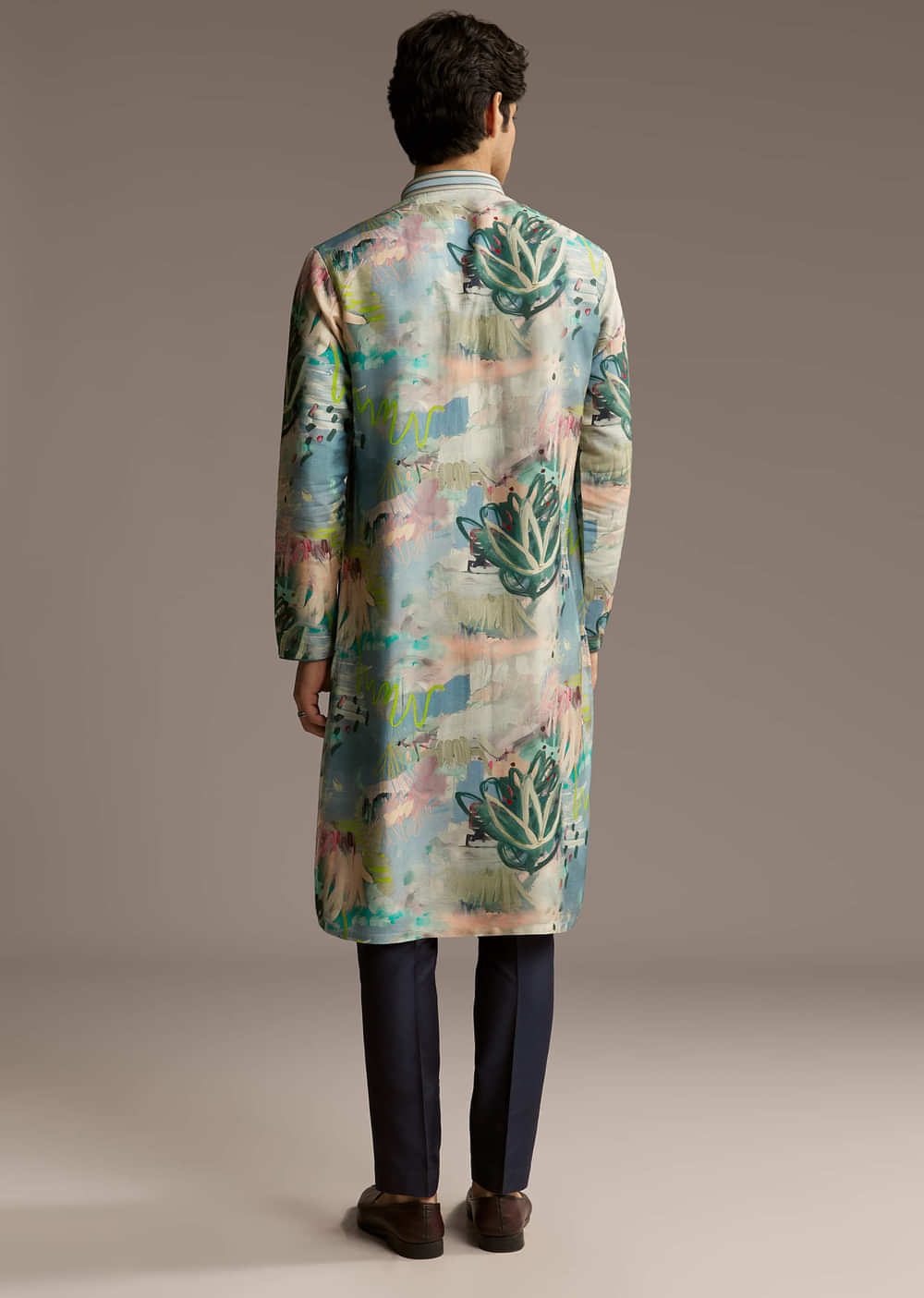 Multicolour silk always brings energy, and this kurta set for men is no exception. The artistic brushstroke print detail adds dimension, making it lively without being over the top. Awarded as the Most Trusted Brand, we're delivering styles you love, just as promised.