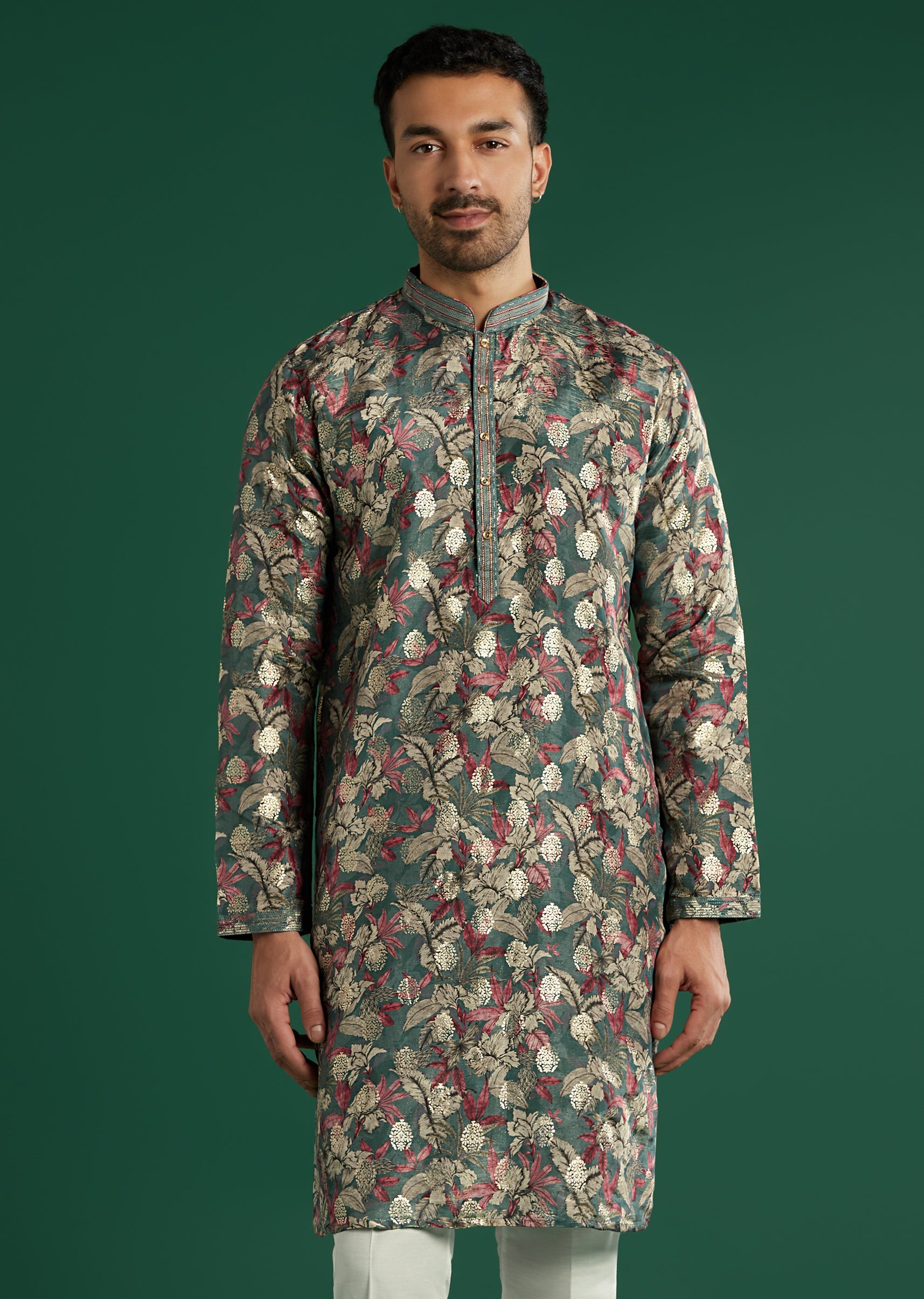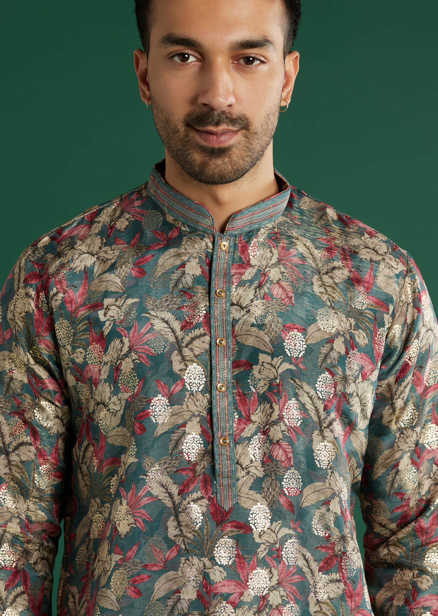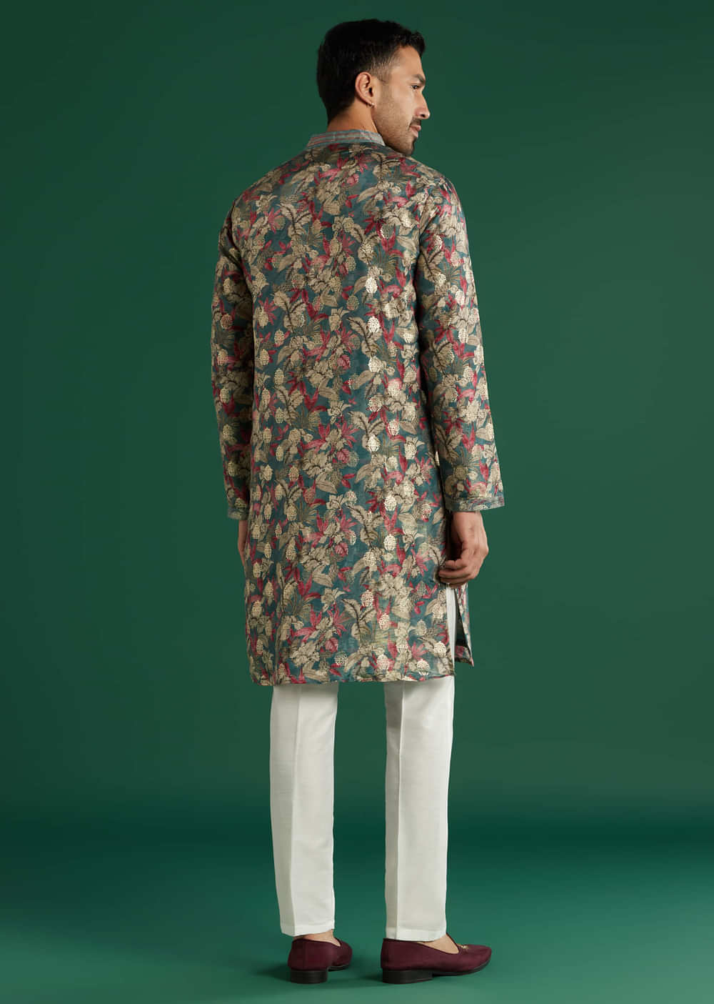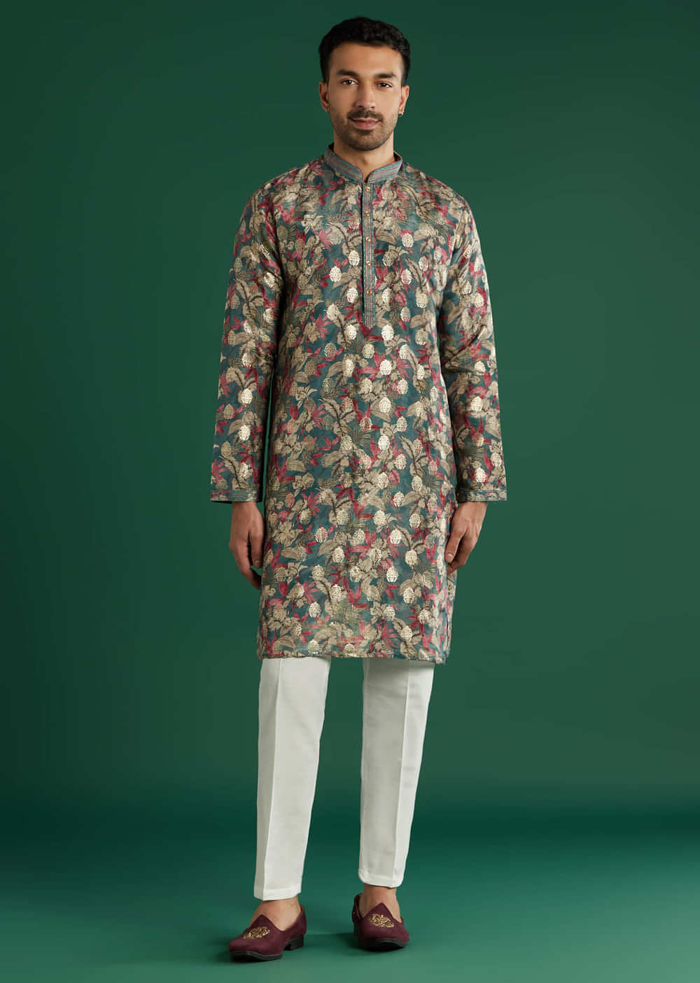 Multicolour Silk Kurta Set For Men With Floral Motif Print