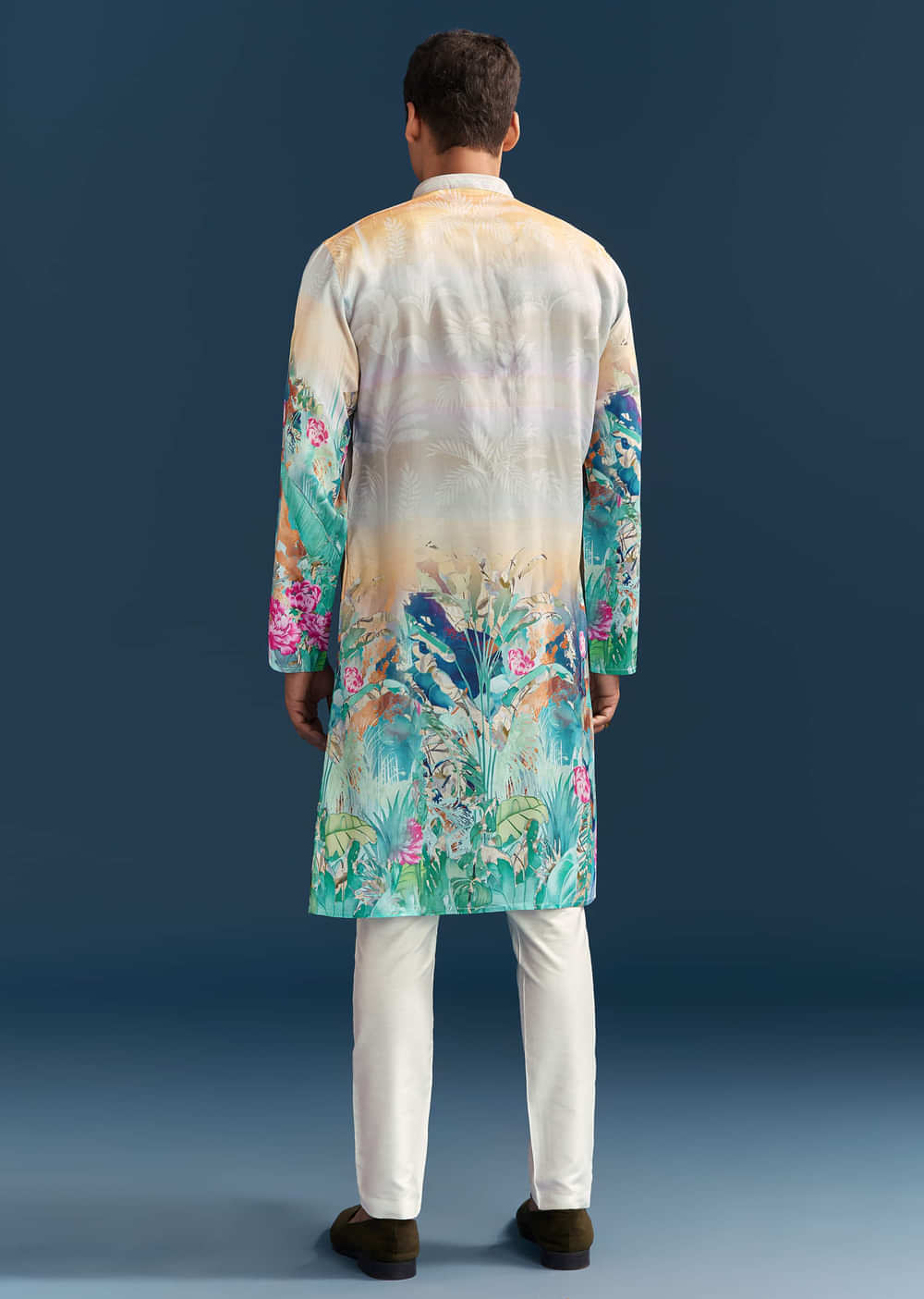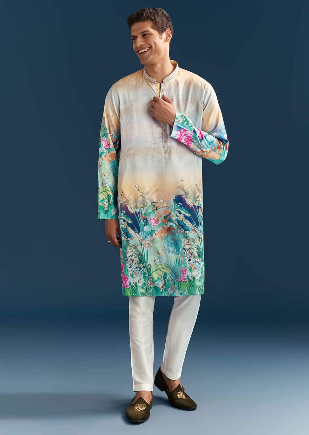 This multicolour silk ombre printed men's kurta set flows in rich gradients, echoing celebration with every hue. Designed for the man who’s not afraid to wear the mood of the... More Product Details