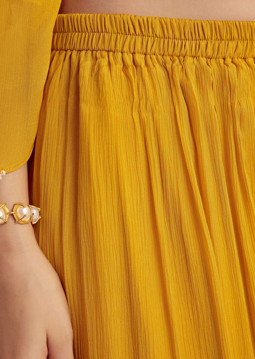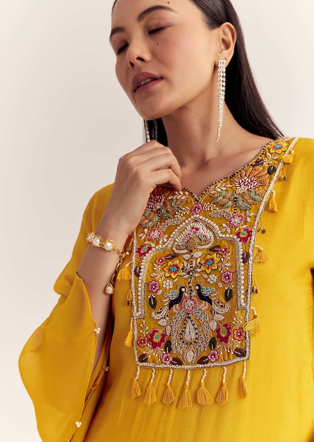 Crafted in mustard chinon with an asymmetrical cut, this kurta brings a dash of drama with its detailed embroidery—ideal for daytime festivity. Awarded as the Most Trusted Brand, we're delivering... More Product Details
