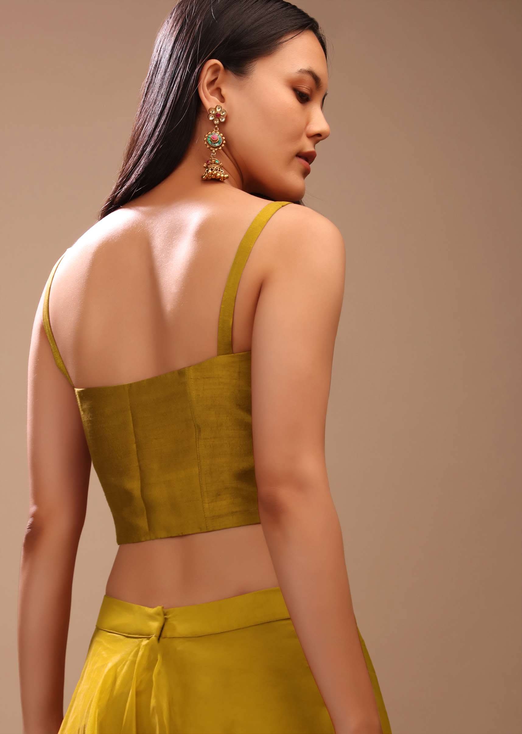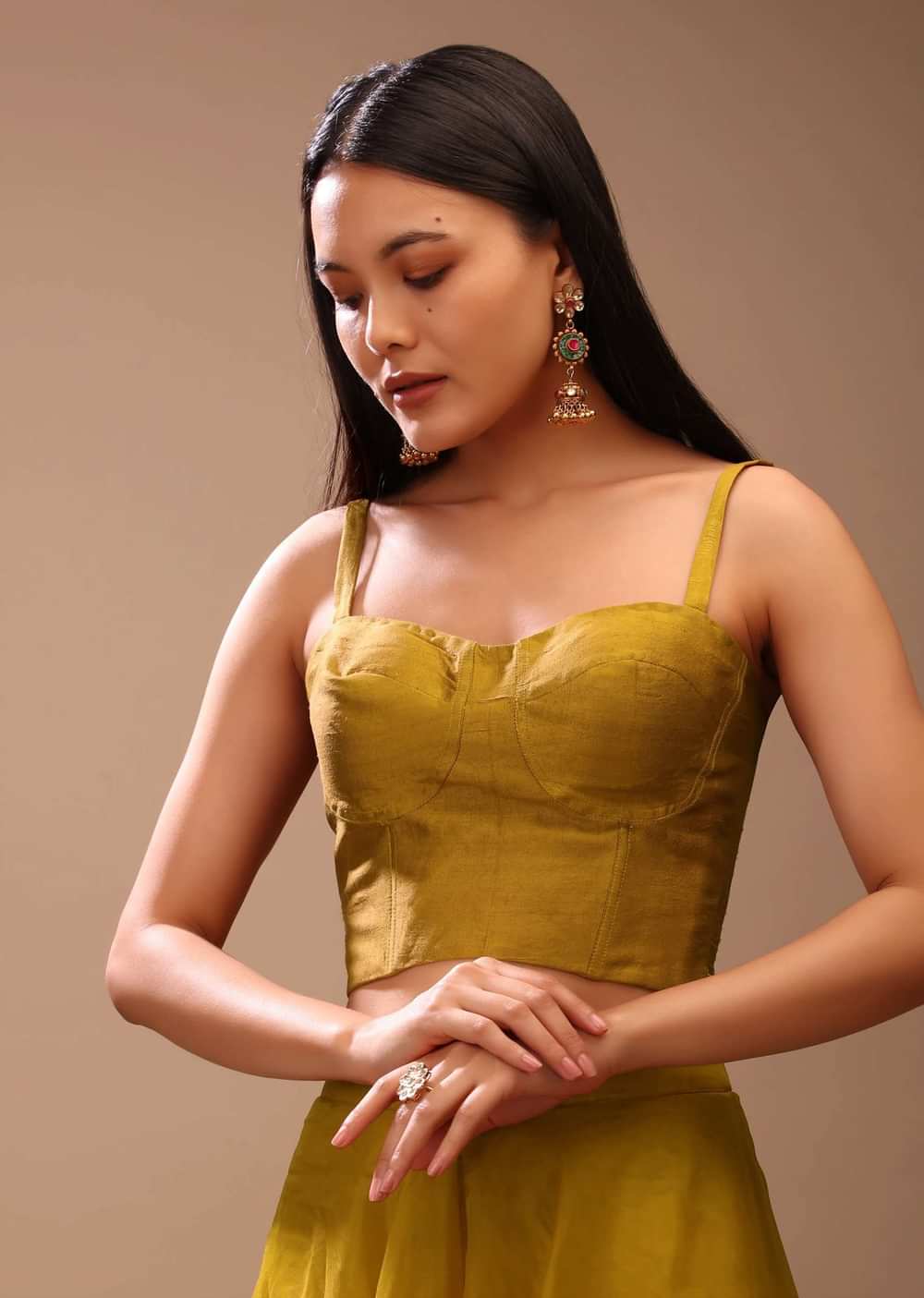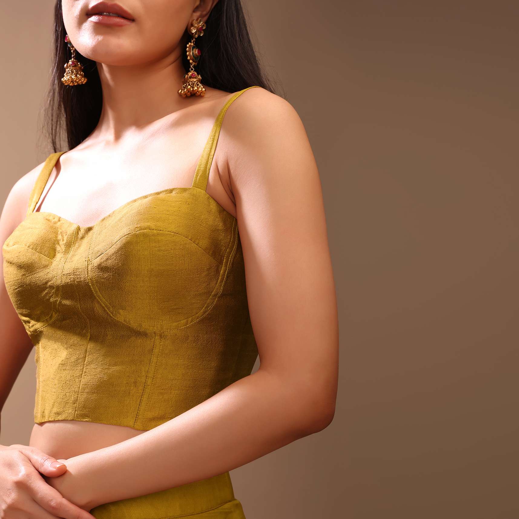 Mustard Gold Corset Top In Raw Silk With Strap Sleeves And Boning Detailing