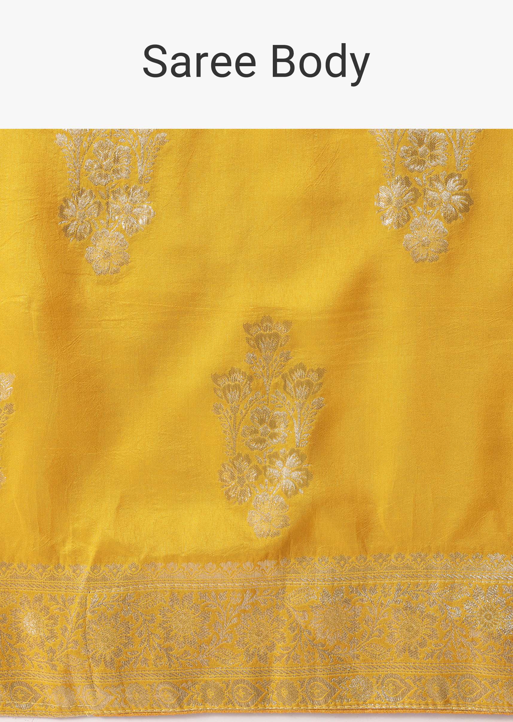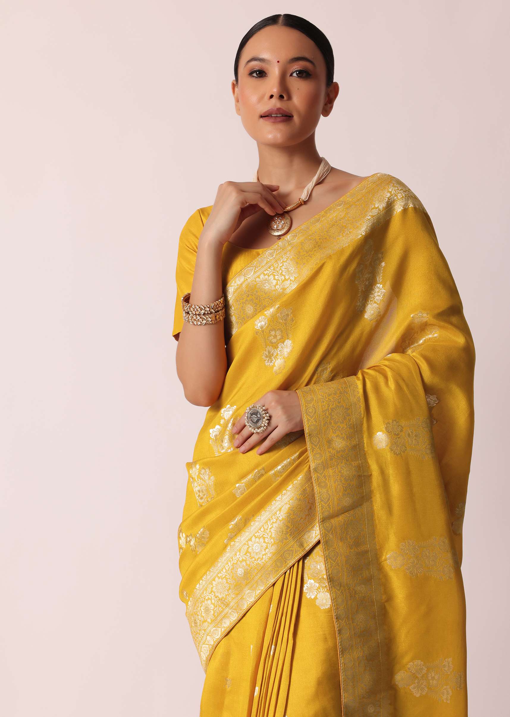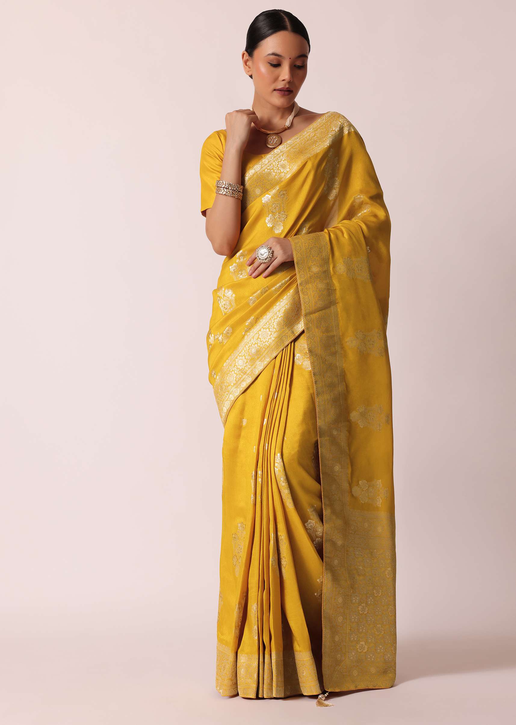 Mustard Yellow Banarasi Silk Saree With Zari Floral Motifs And Unstitched Blouse Piece