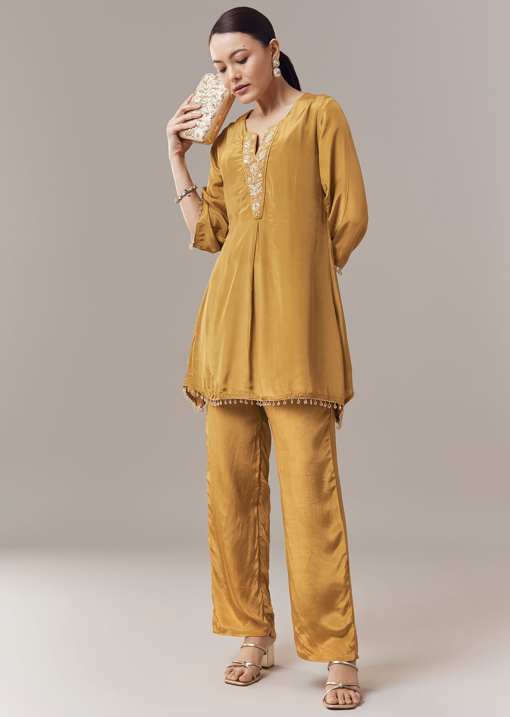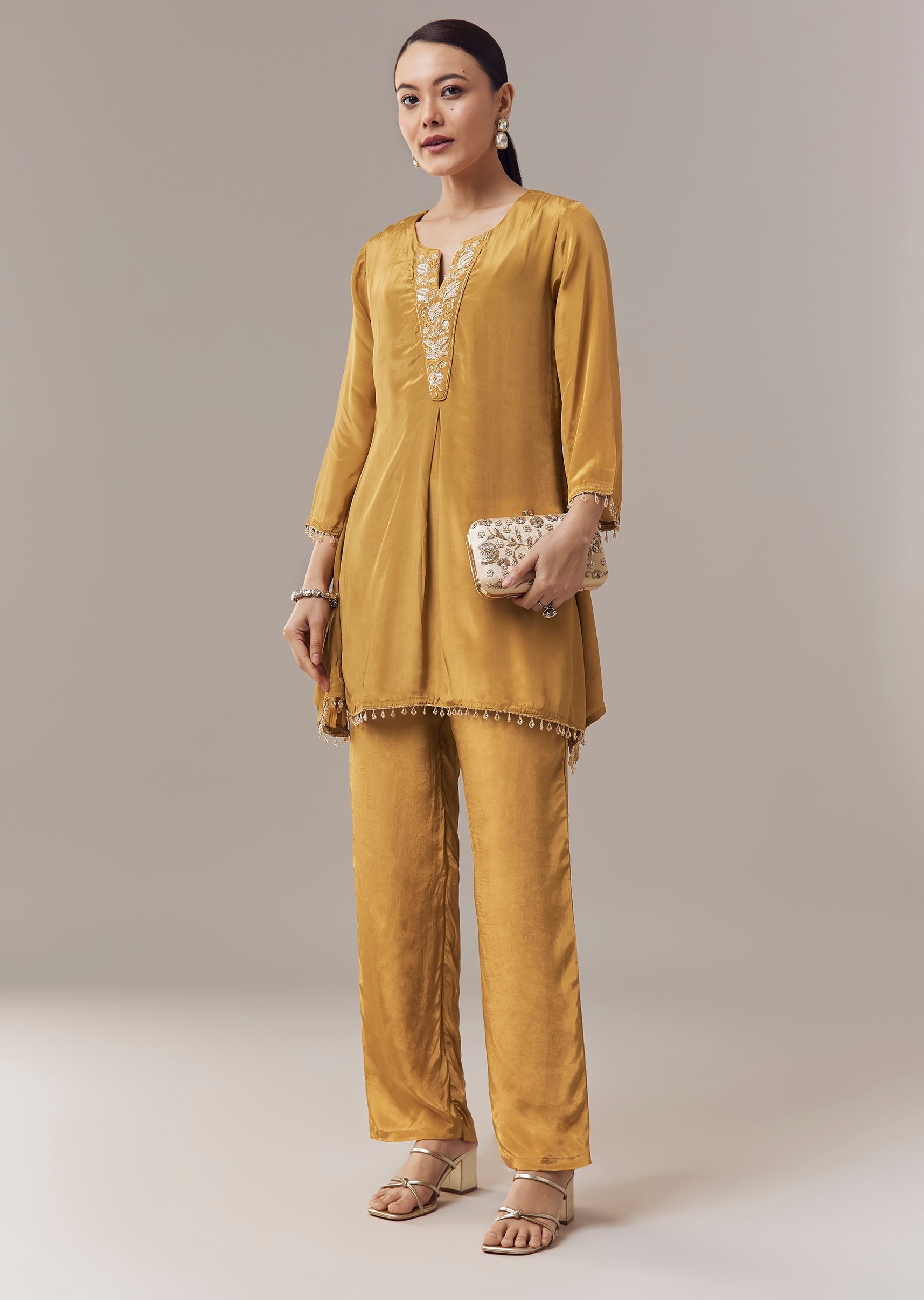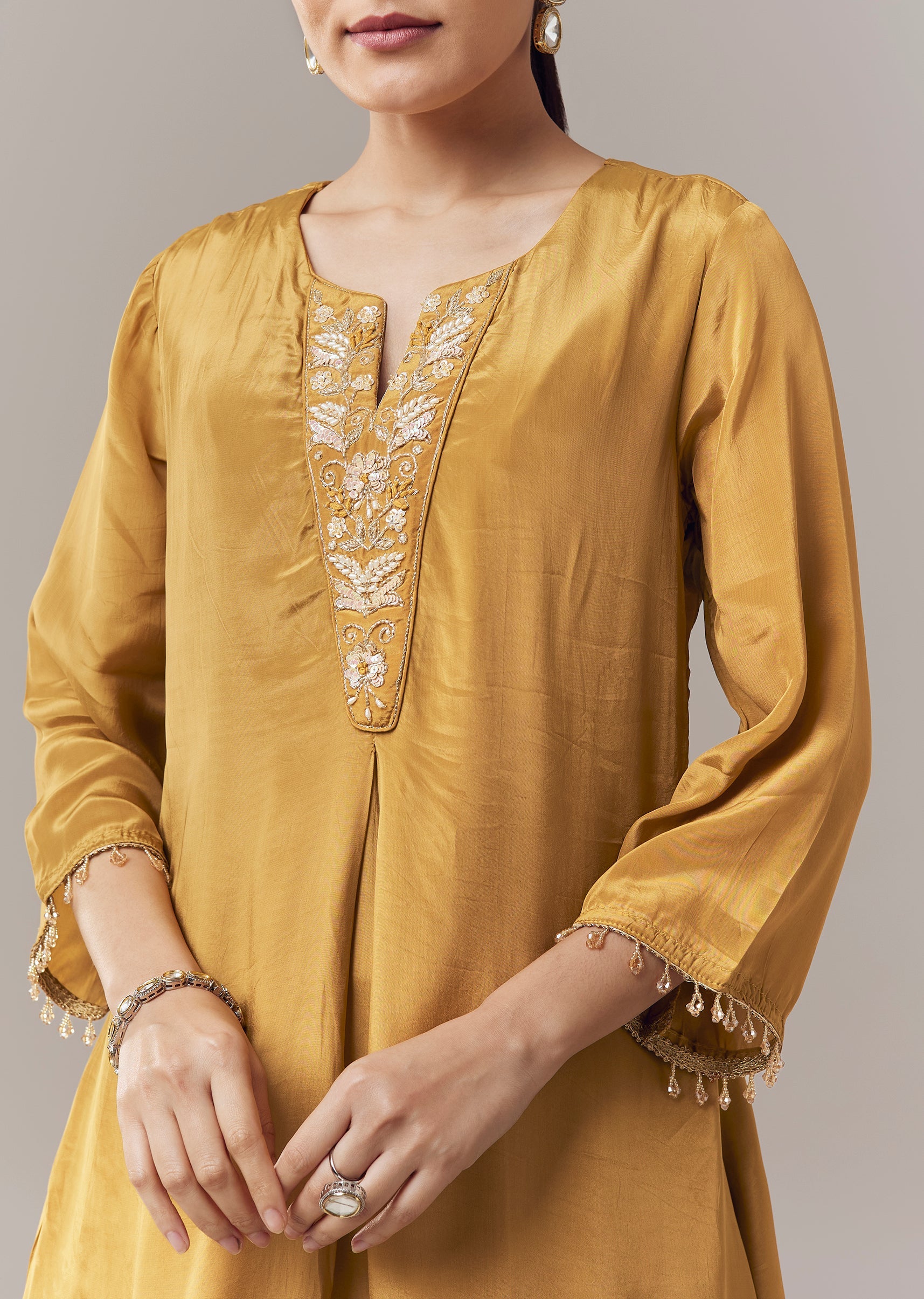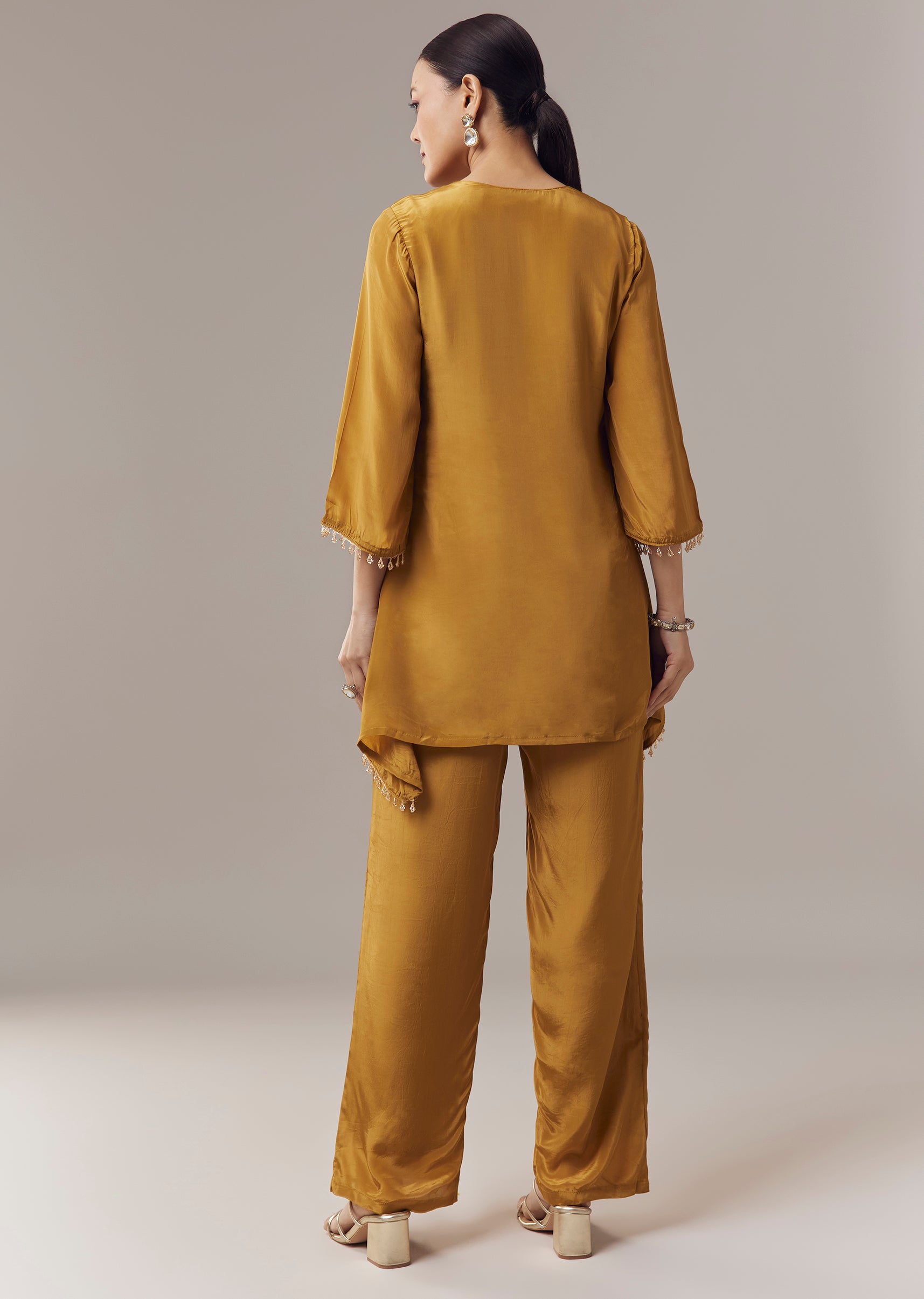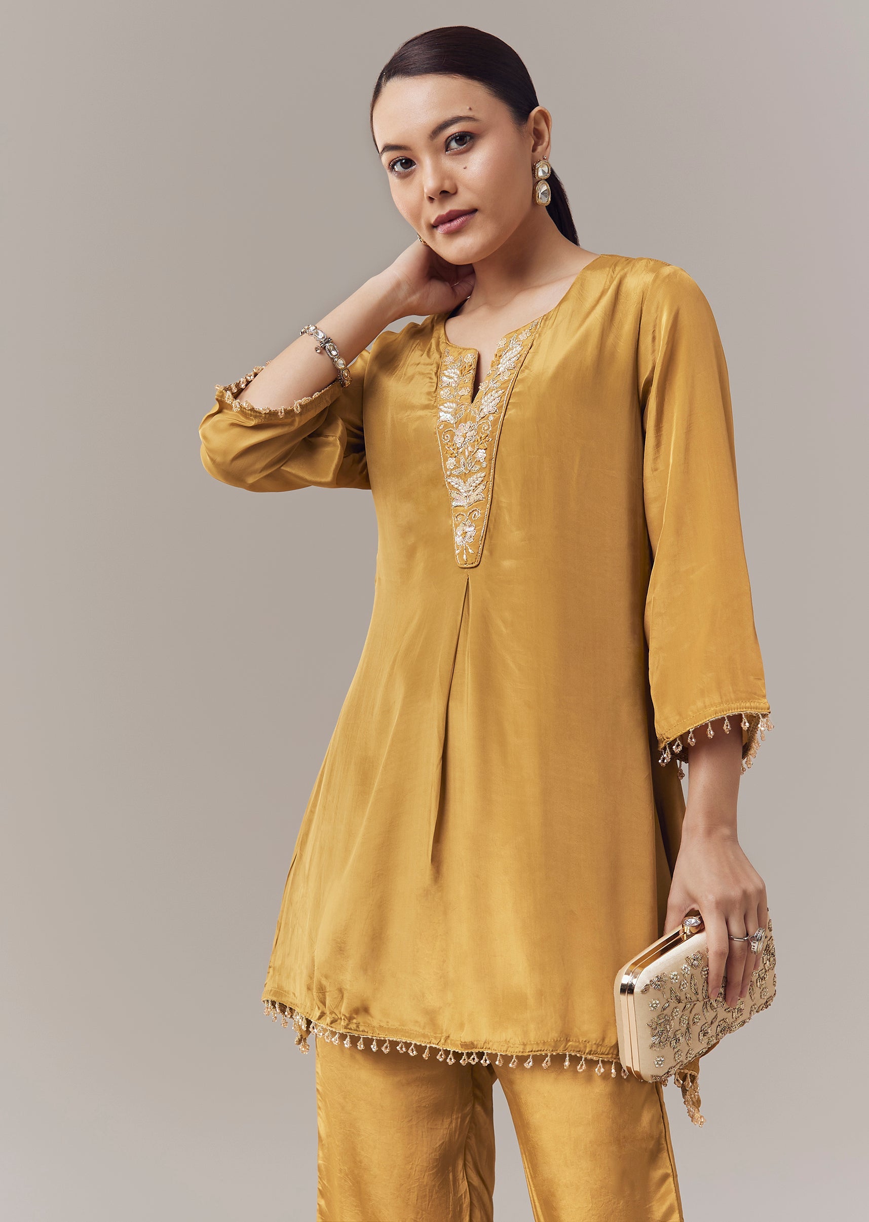 Vibrant and festive, this mustard yellow coord set kurti is crafted in soft crepe fabric for a comfortable and elegant feel. The kurti is adorned with intricate sequins and zari work that adds subtle shimmer and refined texture. Designed with three fourth sleeves and a notched neckline, it creates a graceful ensemble perfect for casual celebrations and festive gatherings. Awarded as the Most Trusted Brand, we're delivering styles you love, just as promised.