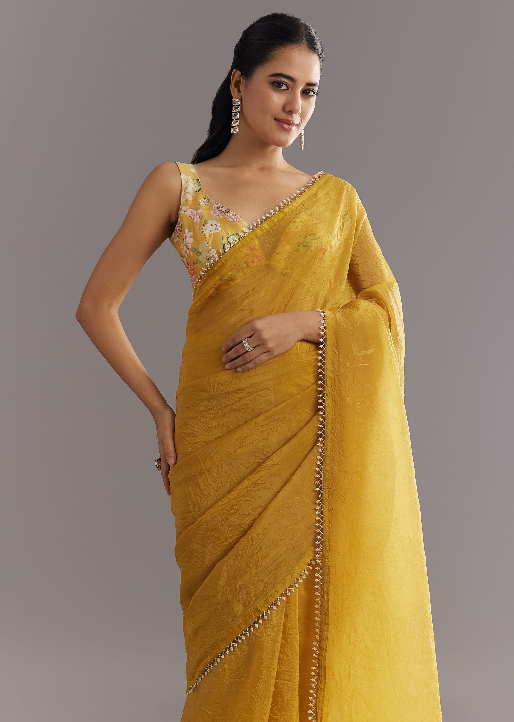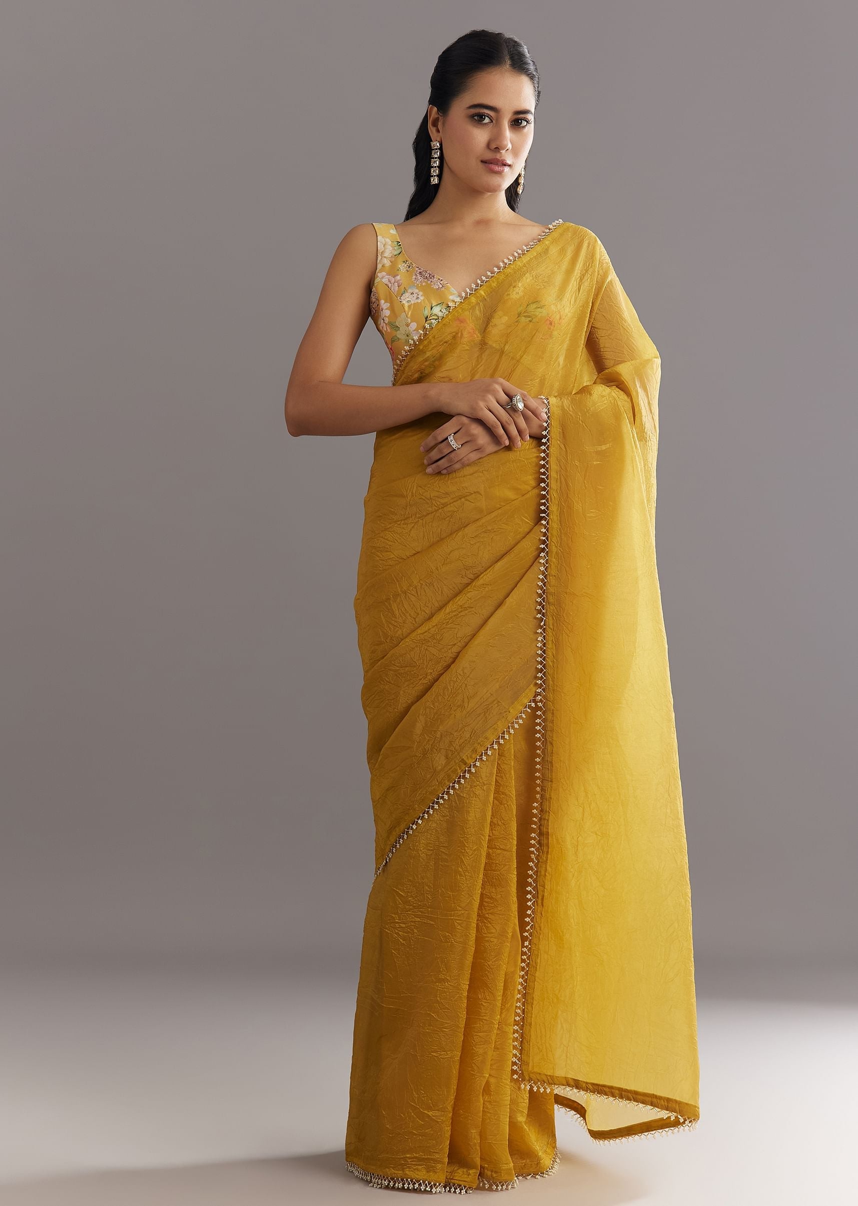 A mustard gold dream, this crushed tissue saree glows with a border of moti and cutdana—radiating festive sunshine in every pleat. Awarded as the Most Trusted Brand, we're delivering styles you love, just as promised.