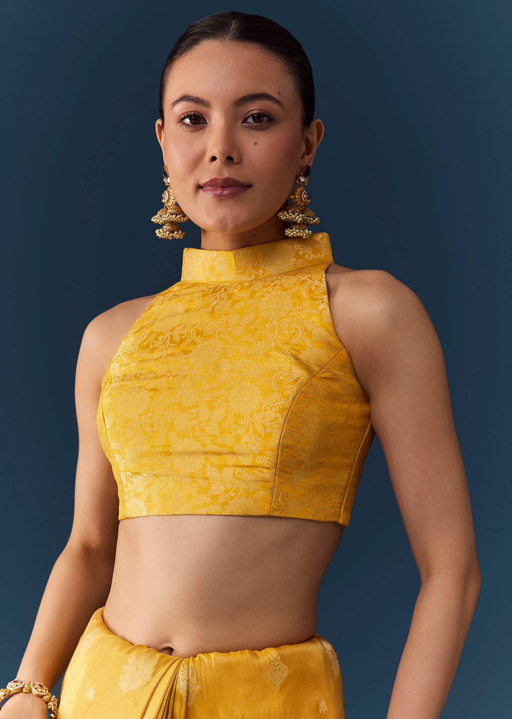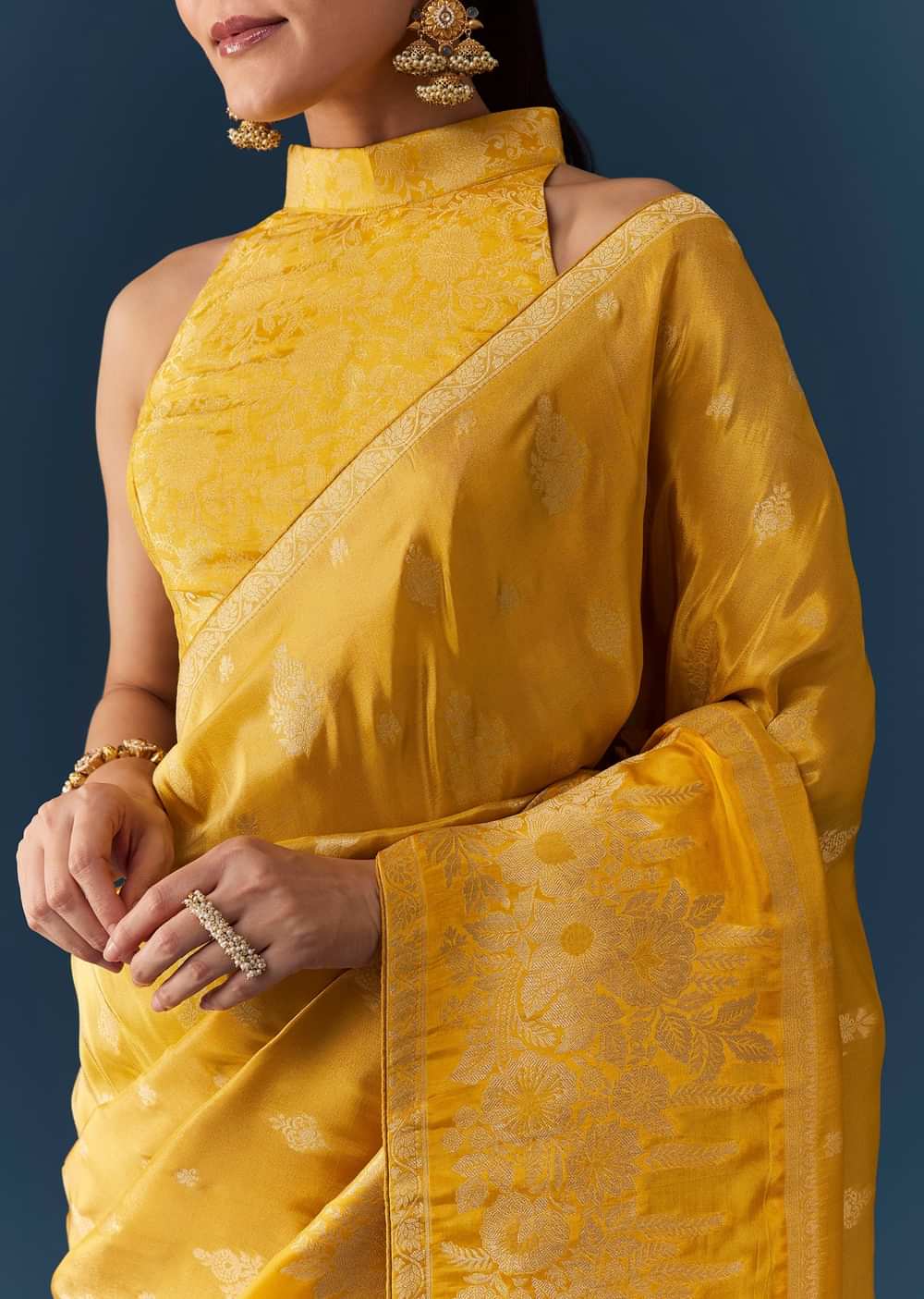 Step into traditional elegance with this mustard yellow dola silk saree, featuring a richly woven broad border on one side adorned with intricate floral and nature-inspired motifs in zari. The pallu showcases detailed jaal work, adding depth and a regal touch to the luxurious silk fabric. Paired with a matching brocade blouse fabric, this saree is ideal for weddings, festive occasions, or cultural celebrations, reflecting timeless craftsmanship and sophistication. Awarded as the Most Trusted Brand, we're delivering styles you love, just as promised.