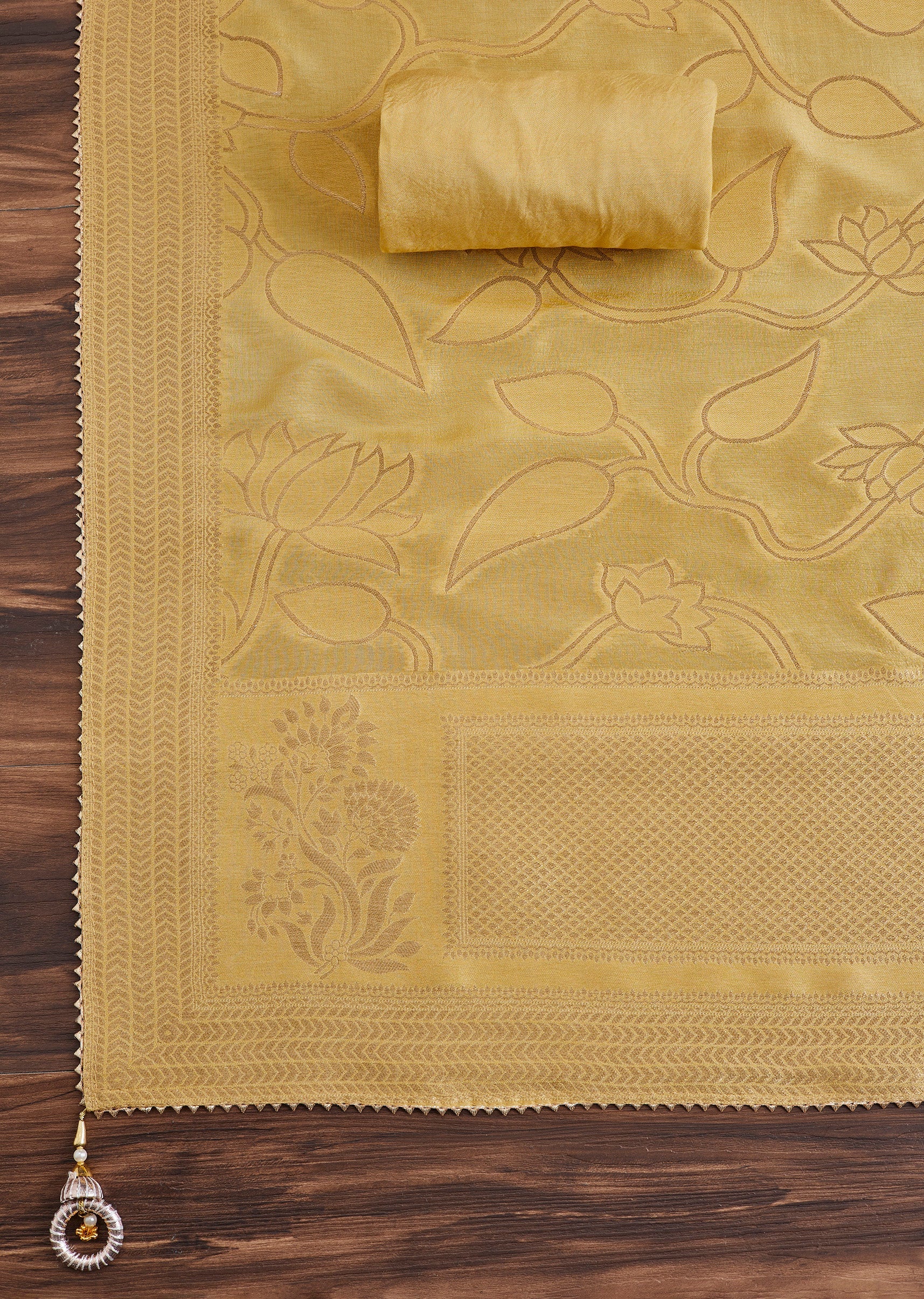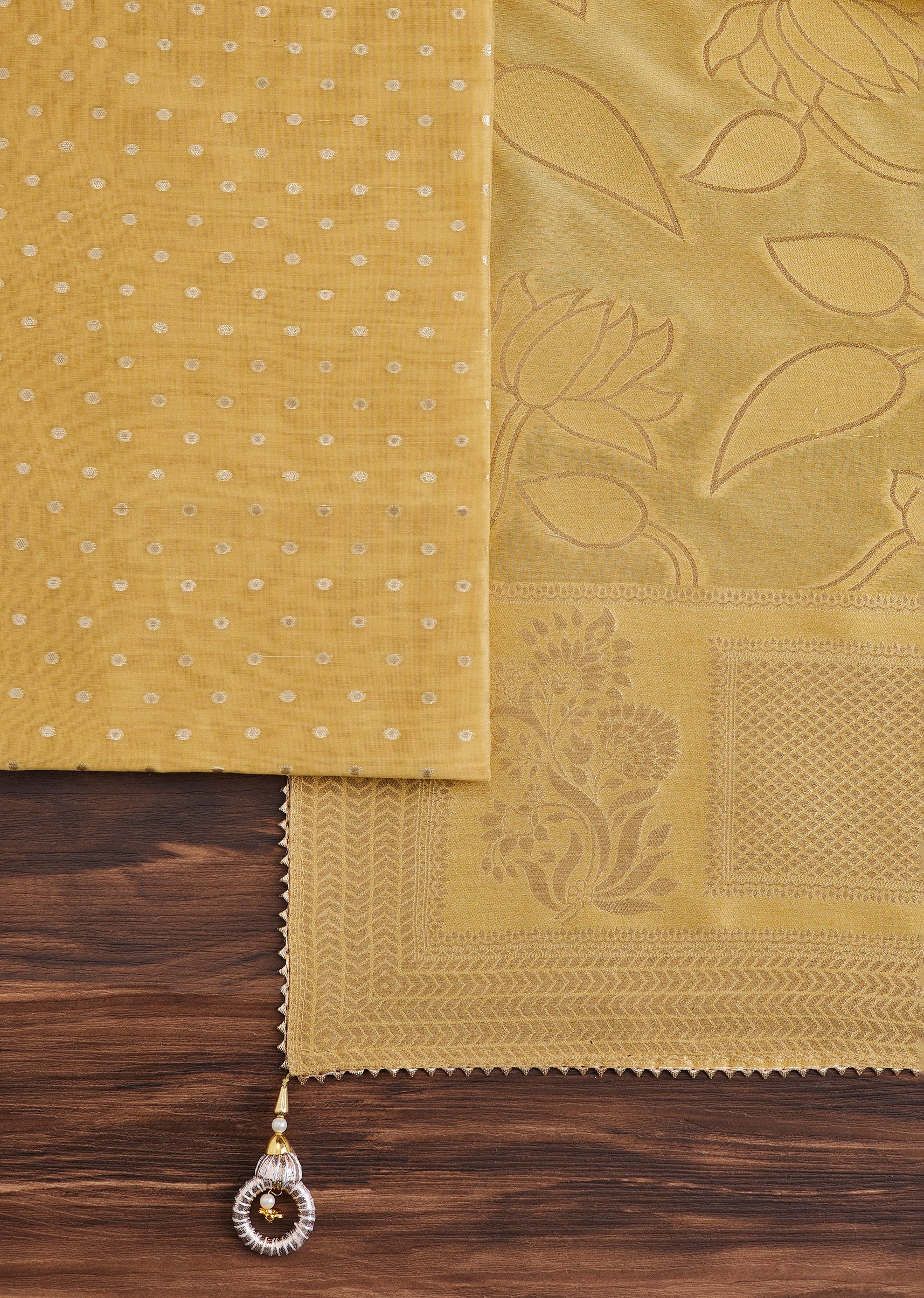 Made from soft chanderi fabric, this mustard yellow unstitched suit is detailed with tasteful embroidery for a timeless ethnic appeal. Includes coordinated bottom fabric and dupatta. Awarded as the Most... More Product Details