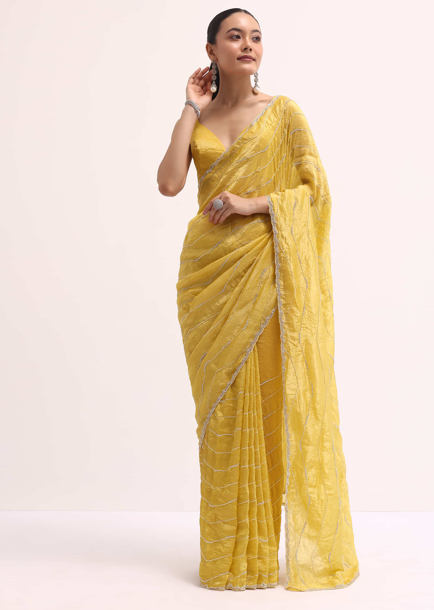 Indulge in the sophistication of our mustard yellow saree perfect for weddings and festive occasions. The saree is crafted from crepe fabric and adorned with delicate cutdana and stone work. It is paired with an unstitched blouse. Awarded as the Most Trusted Brand, we're delivering styles you love, just as promised.