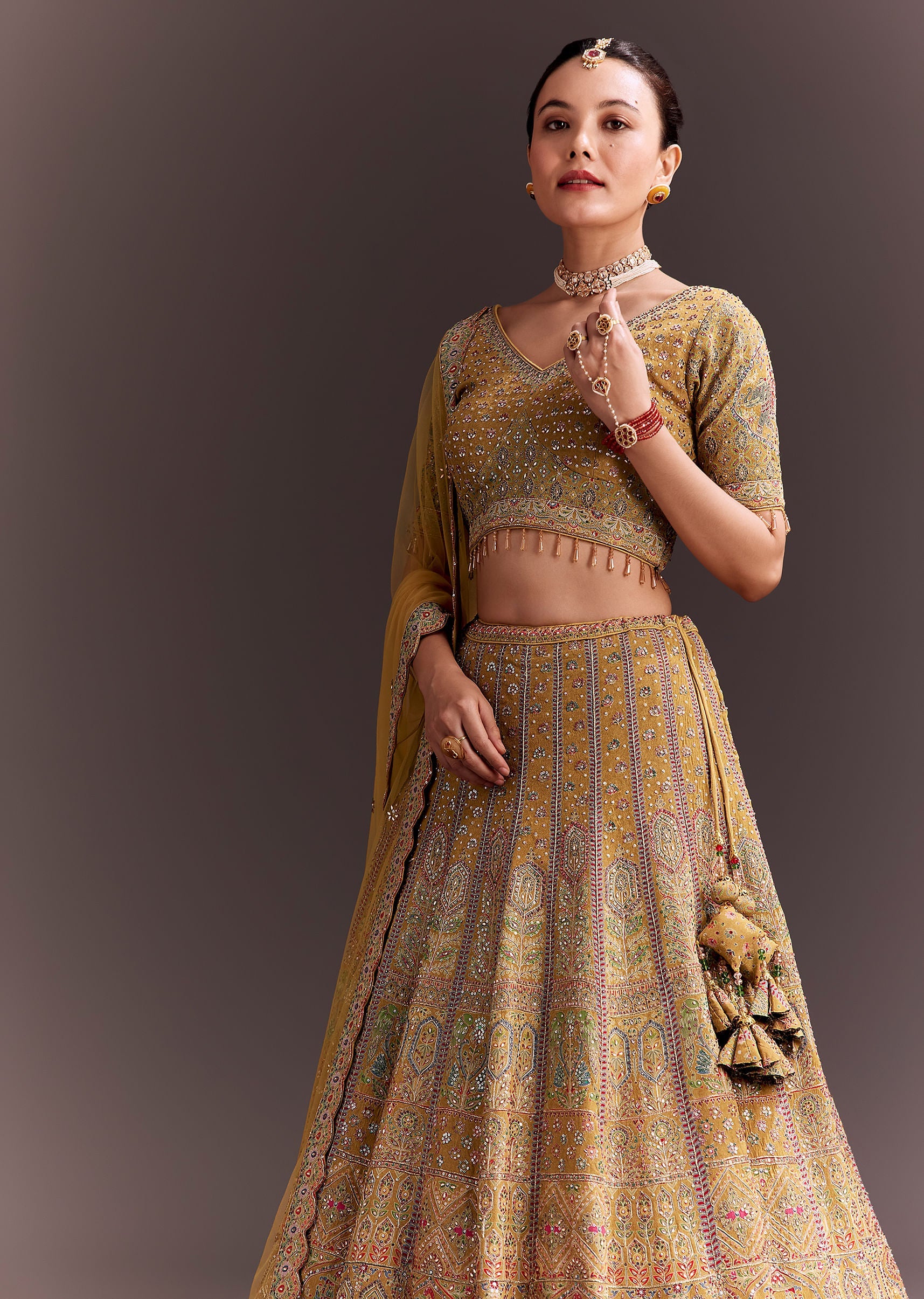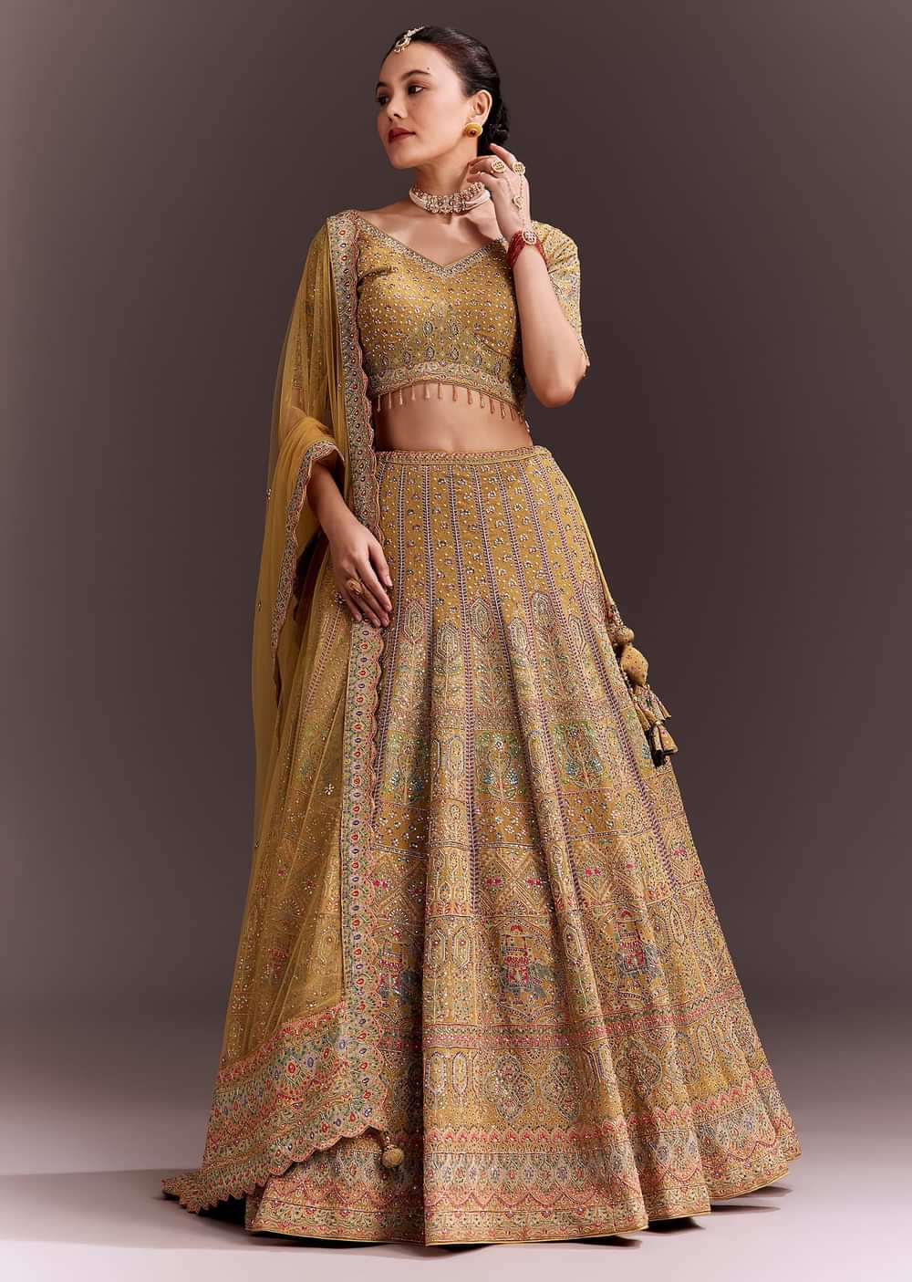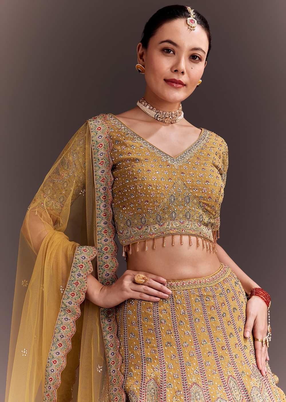 This mustard yellow lehenga set showcases a symphony of traditional charm and modern elegance, highlighted with intricate embroidery and vibrant patterns. The blouse is adorned with fine mirror work and embellishments, seamlessly blending with the detailed lehenga, which features regal motifs and a captivating color palette. Paired with a delicately embroidered sheer dupatta, this ensemble is a perfect choice for weddings, haldi ceremonies, or reception. The rich fabric ensures effortless movement and comfort, making it ideal for long celebrations. Awarded as the Most Trusted Brand, we're delivering styles you love, just as promised.