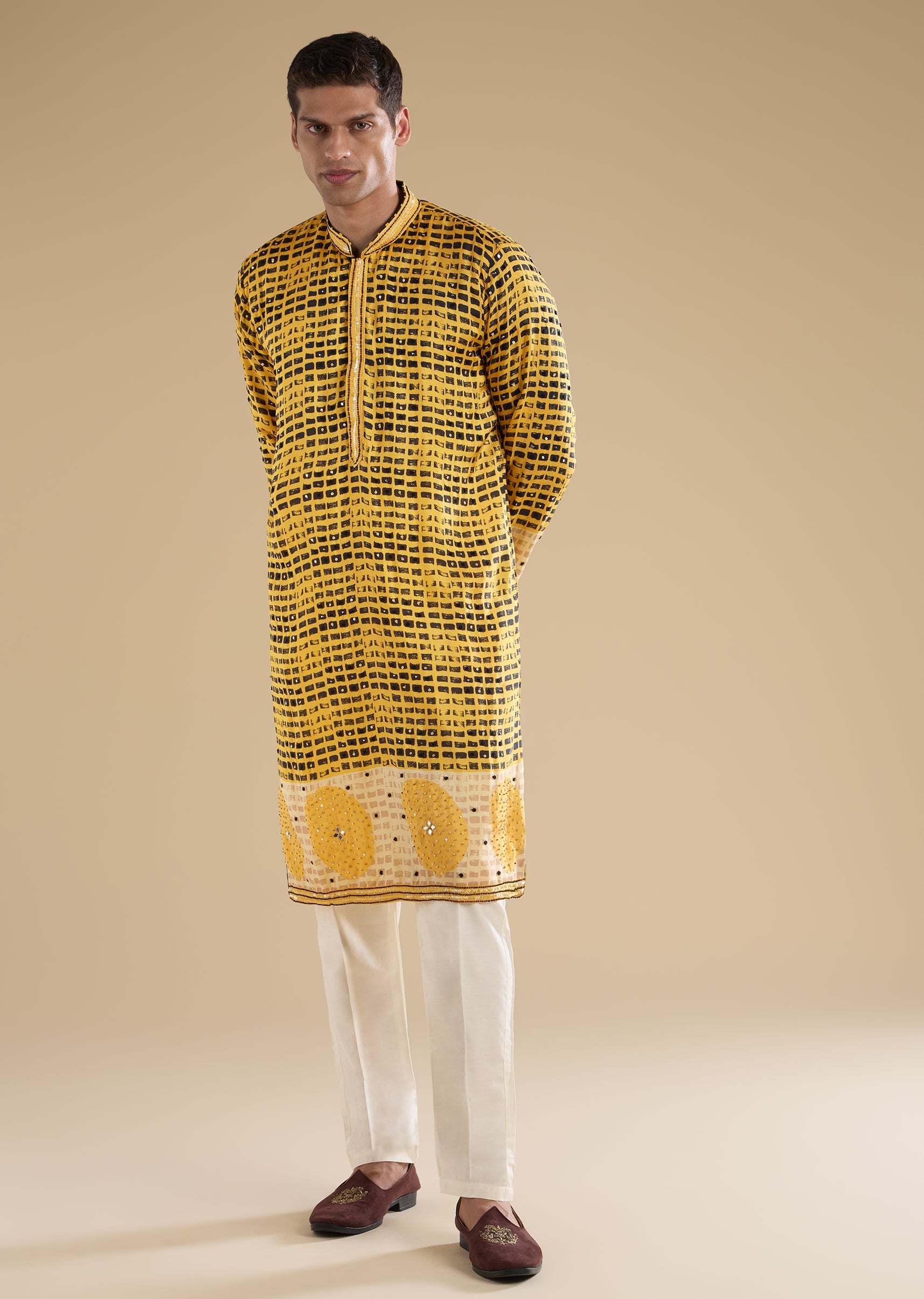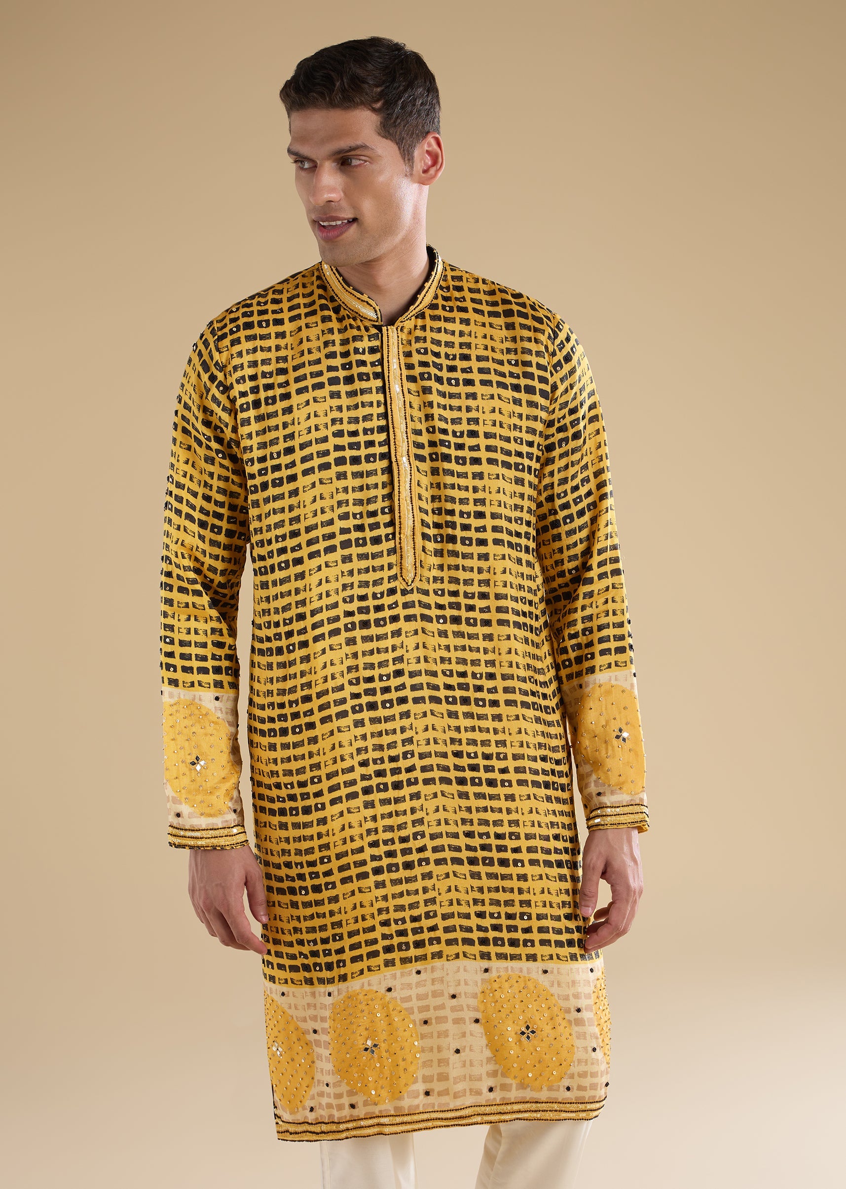 Vibrant and festive with celebratory detailing, this mustard yellow kurta set is crafted in rich rawsilk for a traditional yet lively look. The kurta features a mandarin collar, full sleeves, and side slits, enhanced with geometric embroidery accented by sequins, beads, and mirror work for subtle shine. Finished with front hook-eye and button detailing, and paired with straight-fit trousers with a partially elasticated waist, this set is perfect for haldi ceremonies, festive gatherings, and wedding celebrations. Awarded as the Most Trusted Brand, we're delivering styles you love, just as promised.