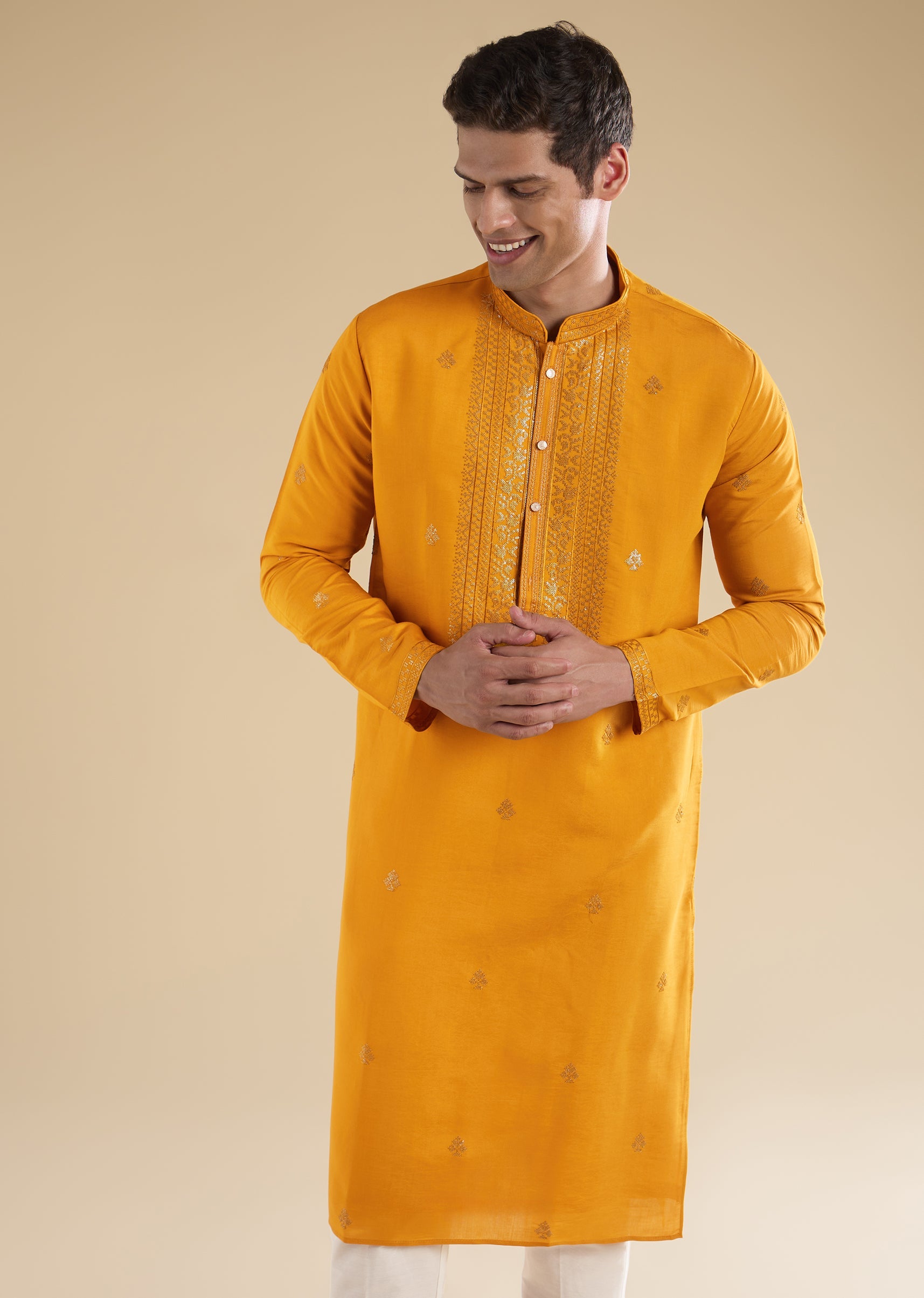 A lively mustard kurta set in art silk with resham and sequin detailing for a festive-casual look. Styled with mandarin collar, full sleeves, and front button closure, paired with straight... More Product Details