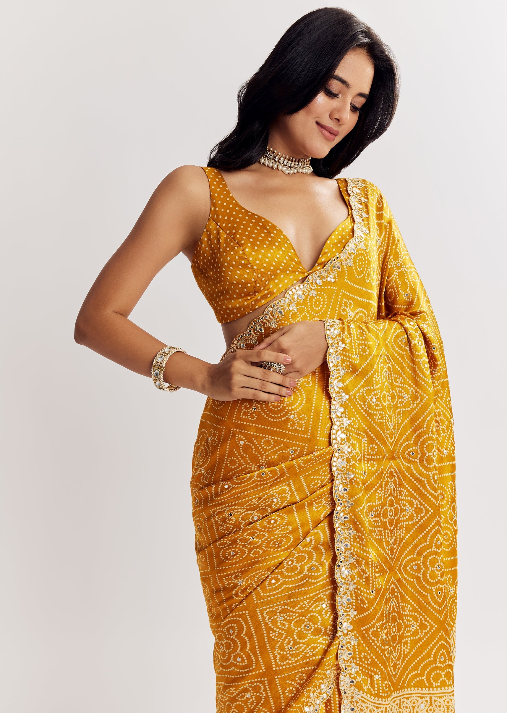 Tradition with a twist—this mustard satin saree brings Ajrakh prints alive with a scalloped border and detailed gota work embroidery. Blouse design may vary. Awarded as the Most Trusted Brand, we're delivering styles you love, just as promised.