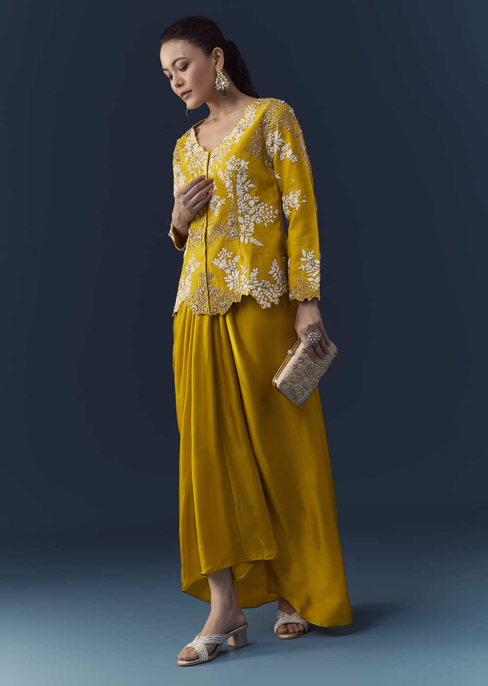 Mustard Yellow Satin Silk Top Skirt Set with Moti Work