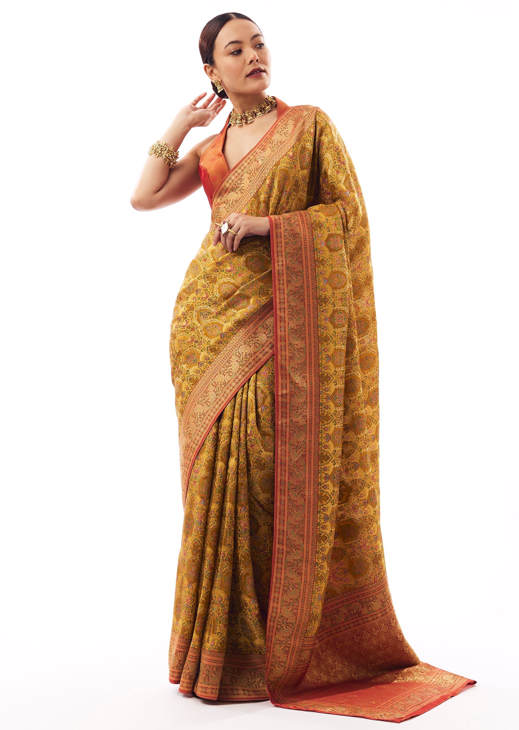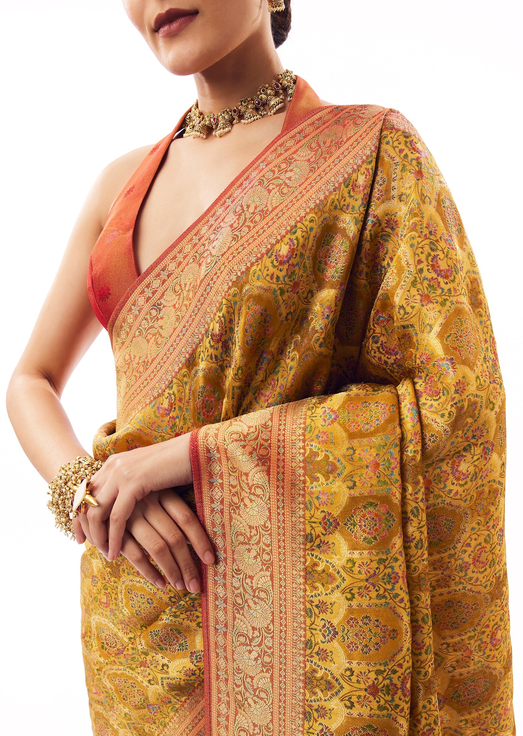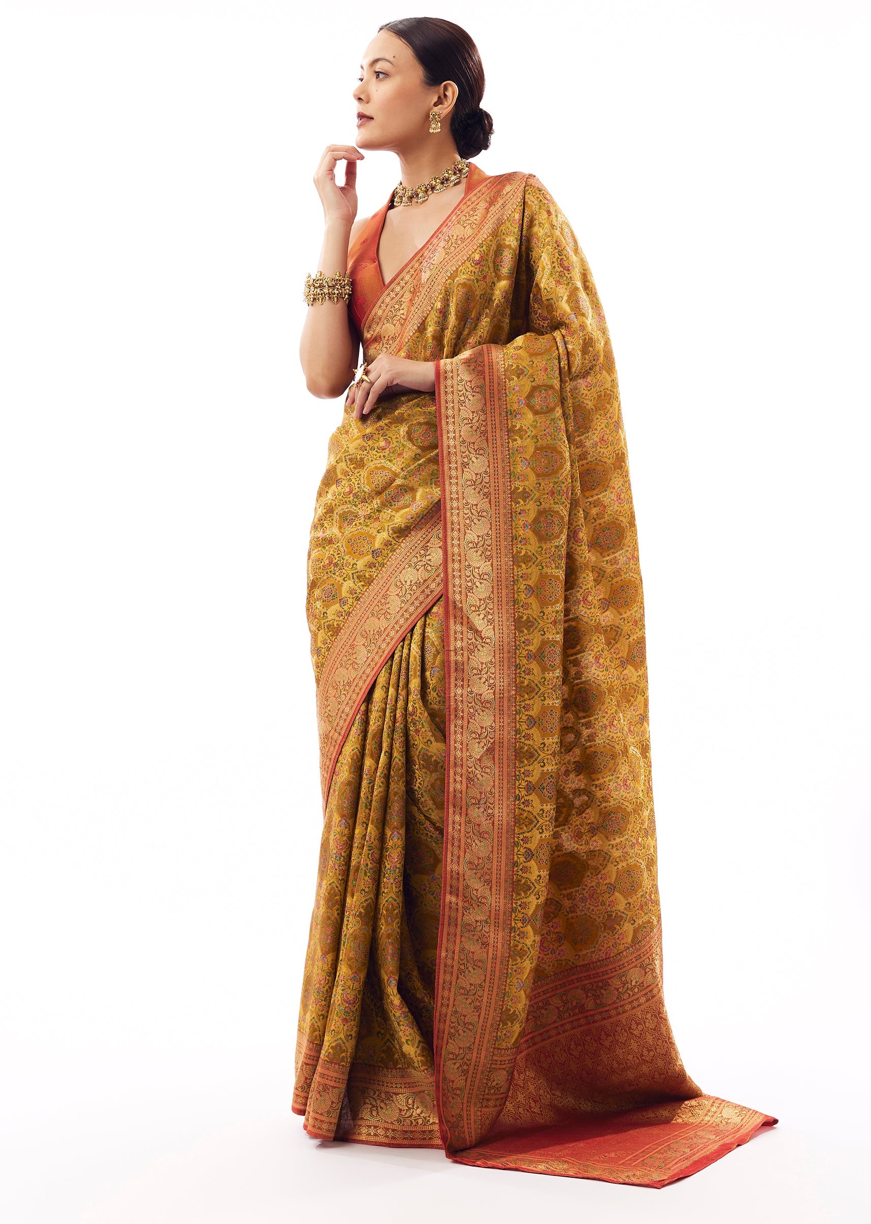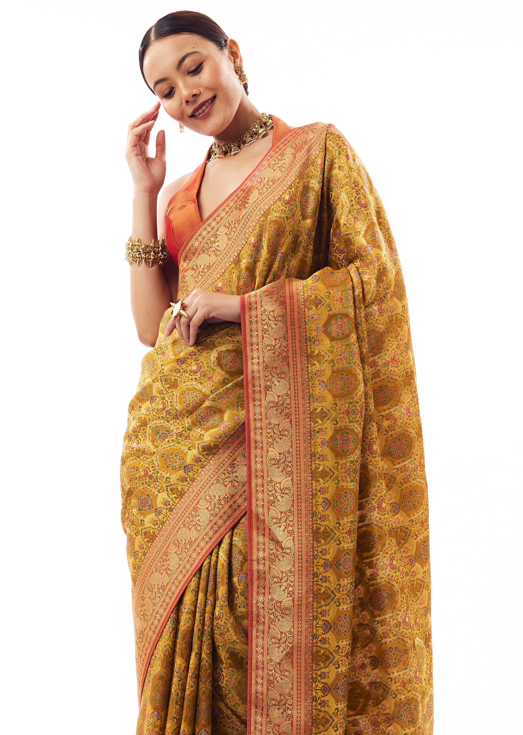 right, festive, and instantly flattering—this mustard satin silk saree is woven with delicate florals and finished with a contrast coral border and pallu for extra pop. Wear it for poojas, festive lunches, and celebrations when you want colour that photographs beautifully. Comes with unstitched blouse fabric.,Awarded as the Most Trusted Brand, we're delivering styles you love, just as promised.
