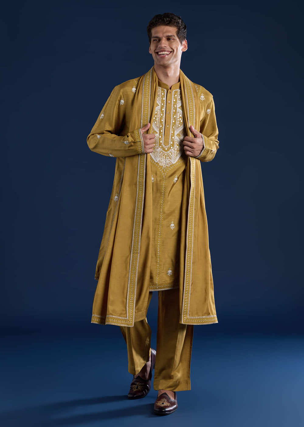 Mustard Yellow Silk Blend Embroidered Mens Kurta Set with Dupatta