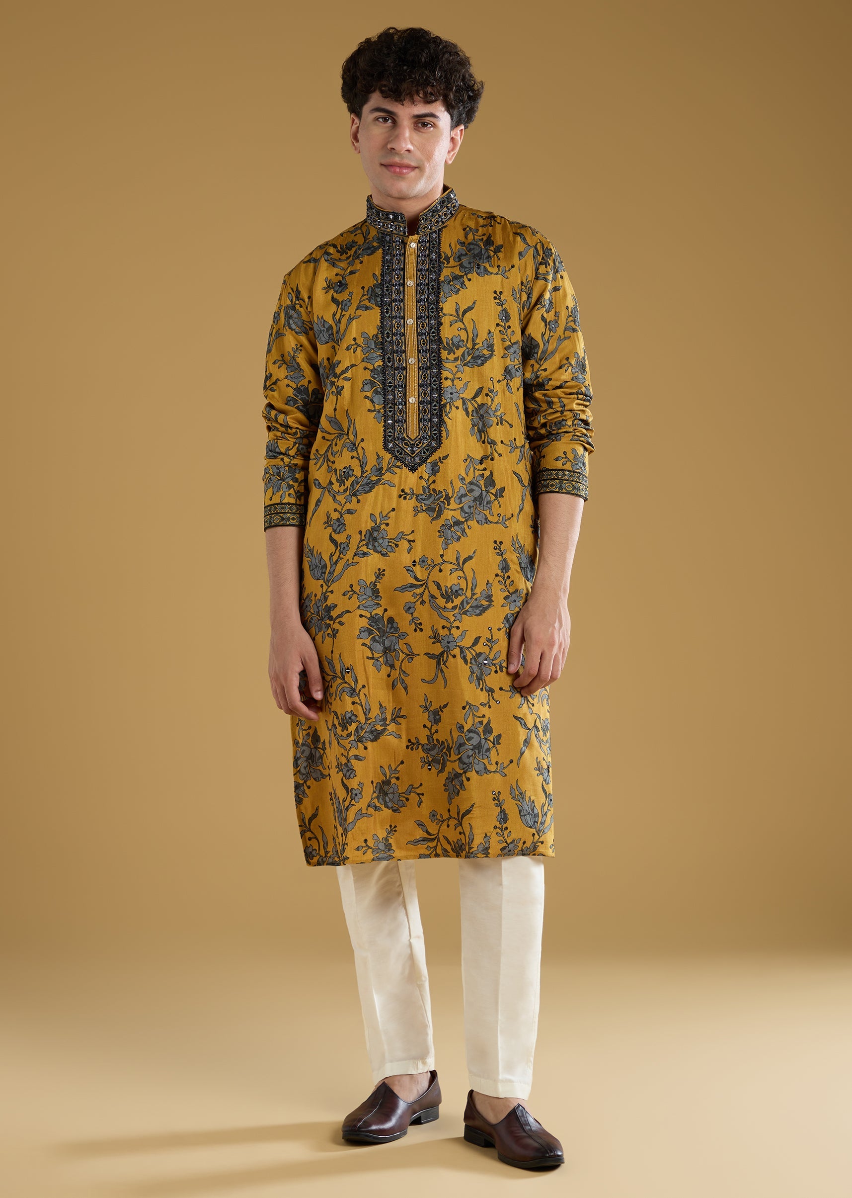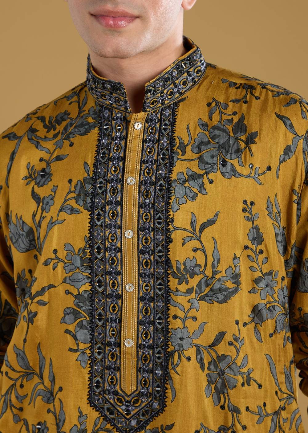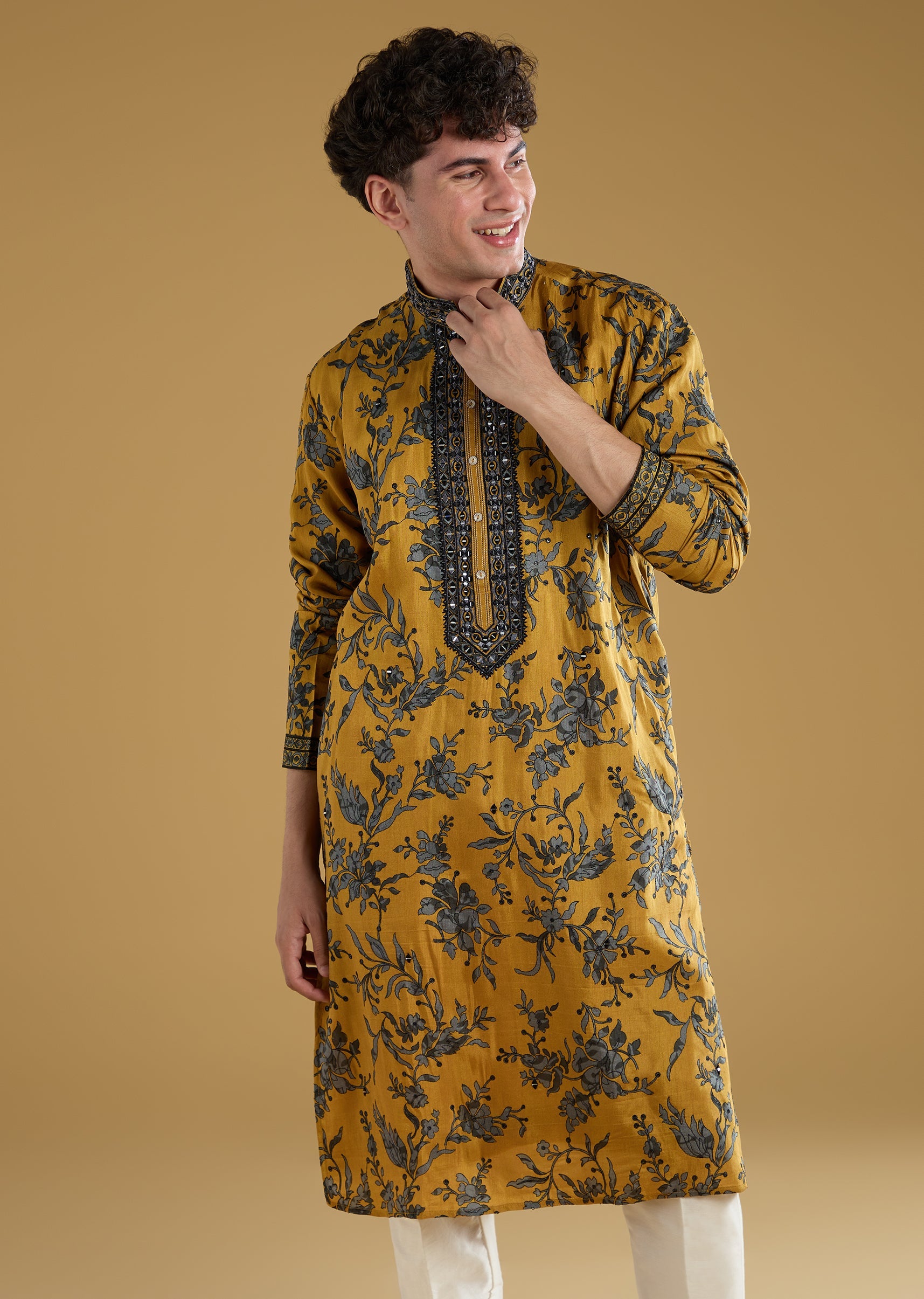 Mustard Yellow Silk Kurta Set With Thread And Mirror Work