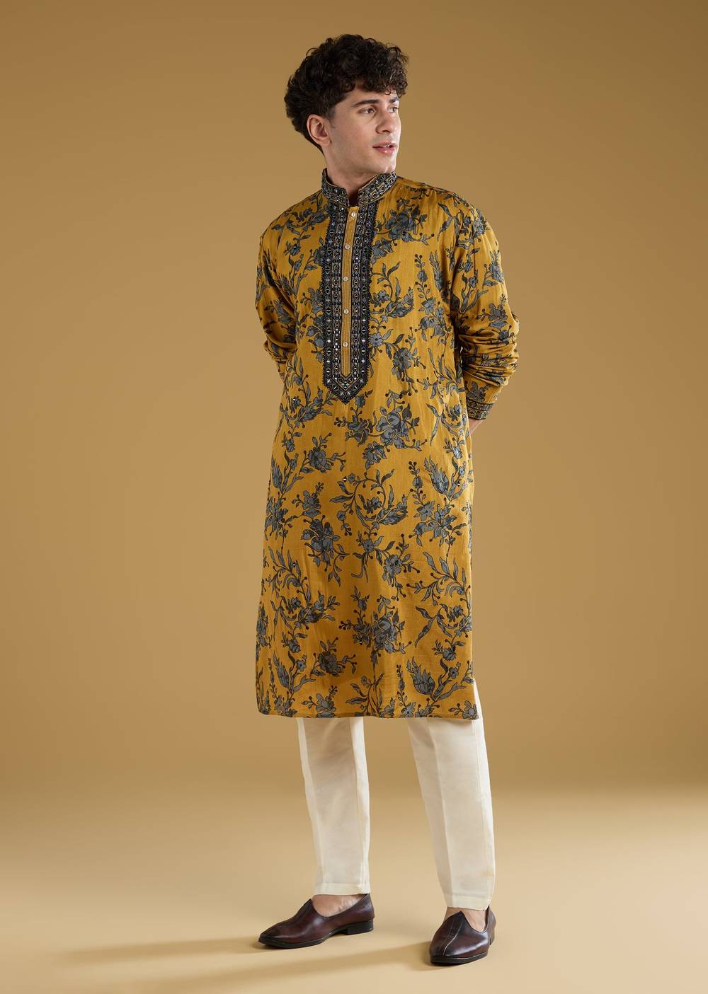 Vibrant and cheerful, this mustard yellow kurta set is perfect for haldi and mehendi celebrations as a wedding guest. Crafted in luxurious silk, it features full sleeves and a classic mandarin collar for a polished traditional look. The intricate thread and mirror work adds a festive shimmer, making it ideal for daytime rituals and colorful celebrations. This kurta ensures a stylish and lively presence for every joyous moment. Awarded as the Most Trusted Brand, we're delivering styles you love, just as promised.