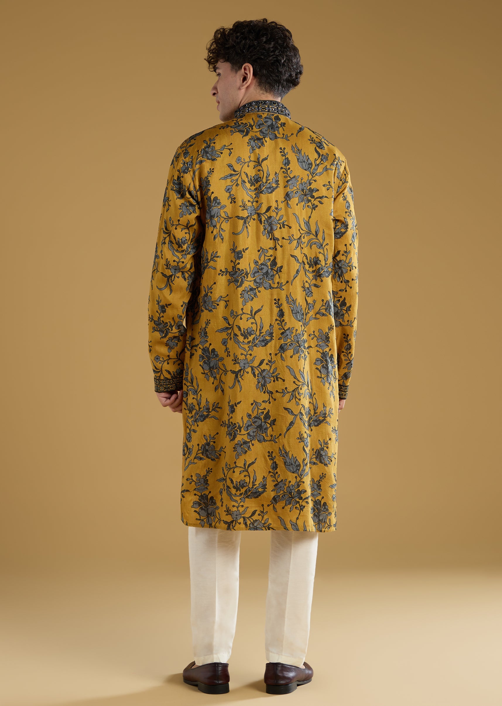 Vibrant and cheerful, this mustard yellow kurta set is perfect for haldi and mehendi celebrations as a wedding guest. Crafted in luxurious silk, it features full sleeves and a classic... More Product Details