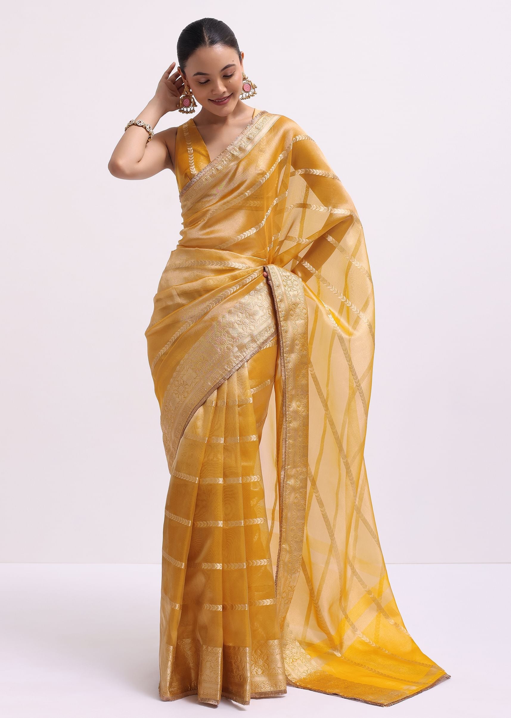 Transform your style with our stunning mustard yellow saree, a masterpiece tailored for festive opulence. Meticulously fashioned from luxurious Chanderi kora fabric, it showcases a resplendent zari-woven border pallu and intricate zari frill lace detailing. Complete with an unstitched blouse, this ensemble radiates refinement and sophistication. Awarded as the Most Trusted Brand, we're delivering styles you love, just as promised.