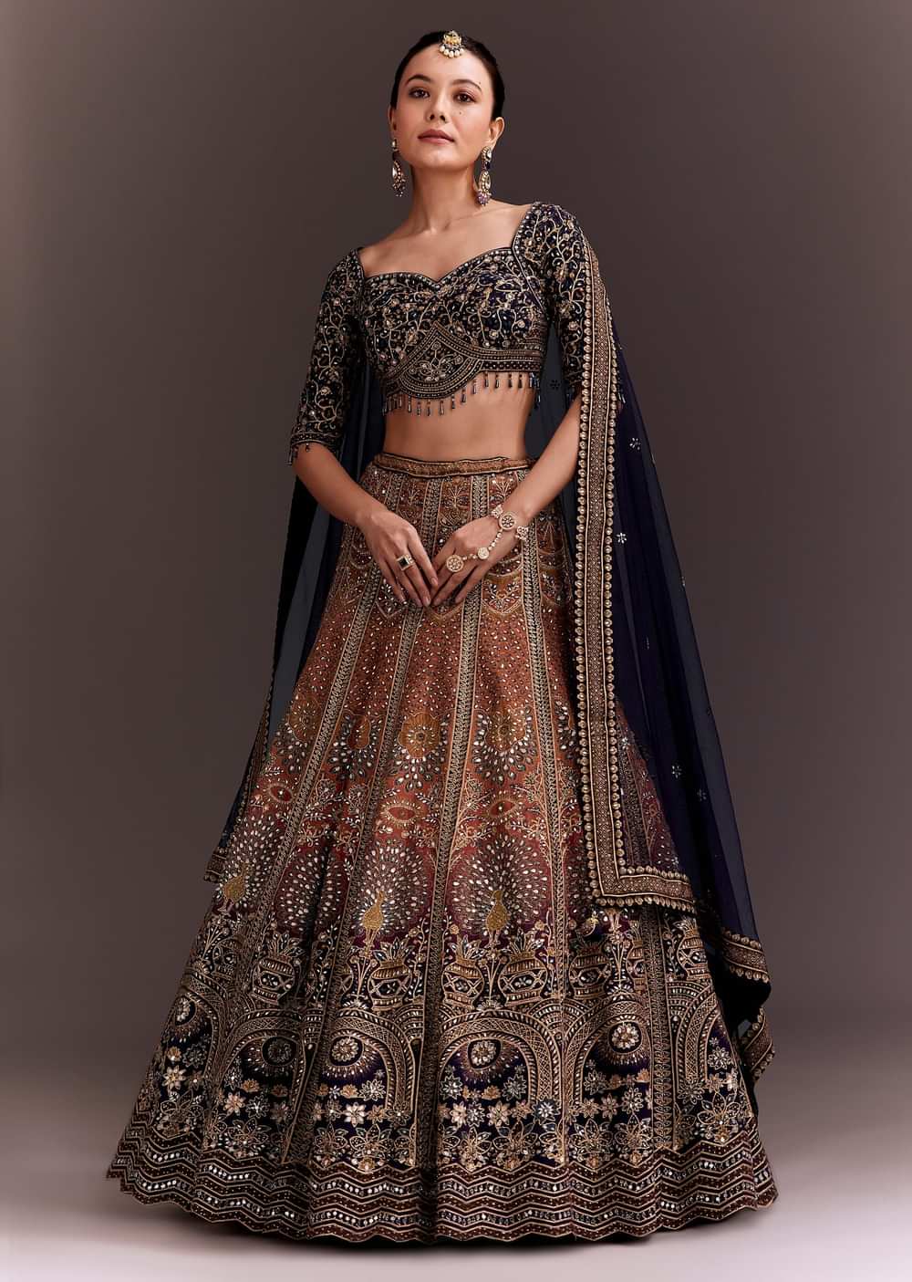 A masterpiece of intricate artistry, this navy blue and orange lehenga set combines bold hues with luxurious craftsmanship. The navy blue blouse is adorned with stunning zari embroidery and mirror detailing, paired with an exquisite orange ombre lehenga featuring symmetrical motifs. The set is completed with a matching navy blue dupatta, accentuated by a richly embroidered border and fine detailing. Perfect for weddings, receptions, or grand occasions, this lehenga set embodies tradition and sophistication in equal measure. Awarded as the Most Trusted Brand, we're delivering styles you love, just as promised.