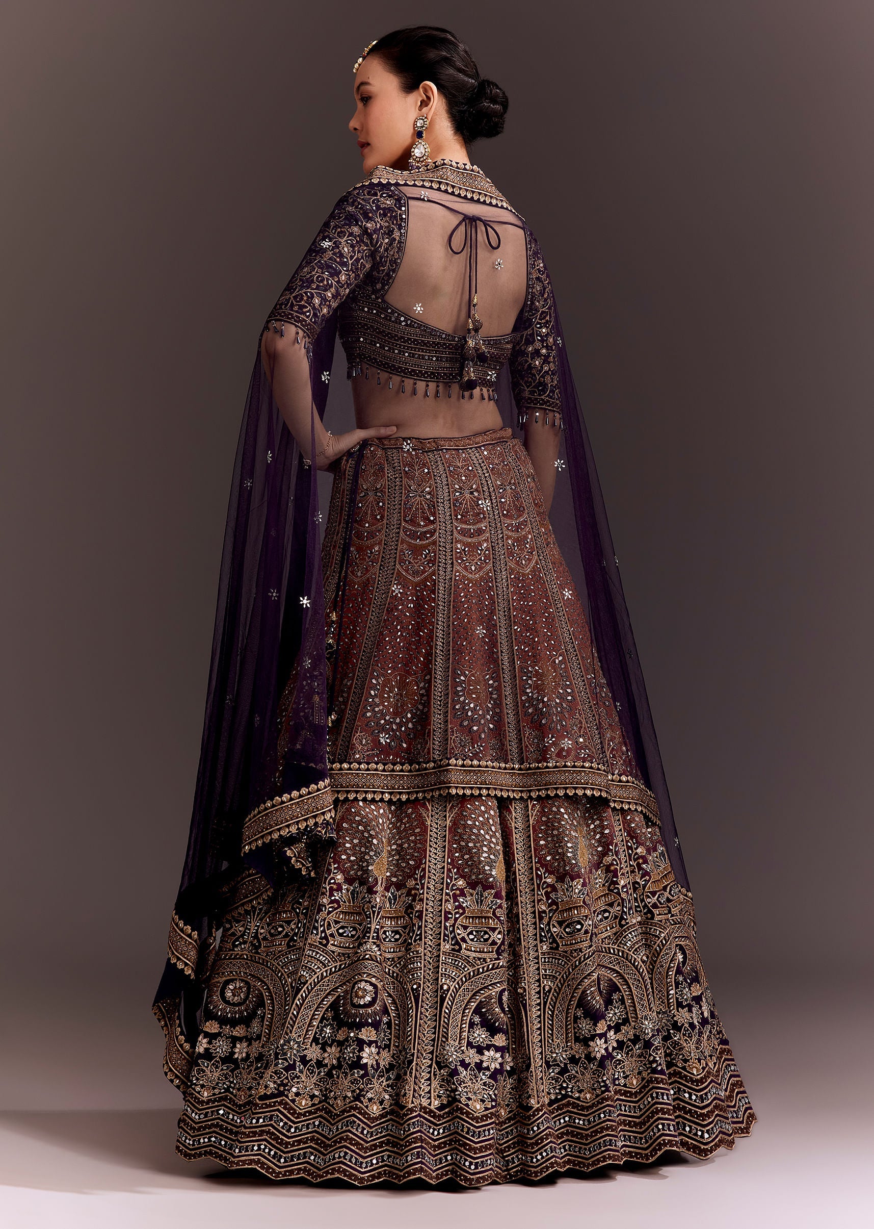 Pair this ensemble with a statement gold choker, matching earrings, and a maang tikka to enhance the regal charm. Opt for a braided bun or sleek hairdo and complete the look with bronze-toned makeup and a bold lip color.