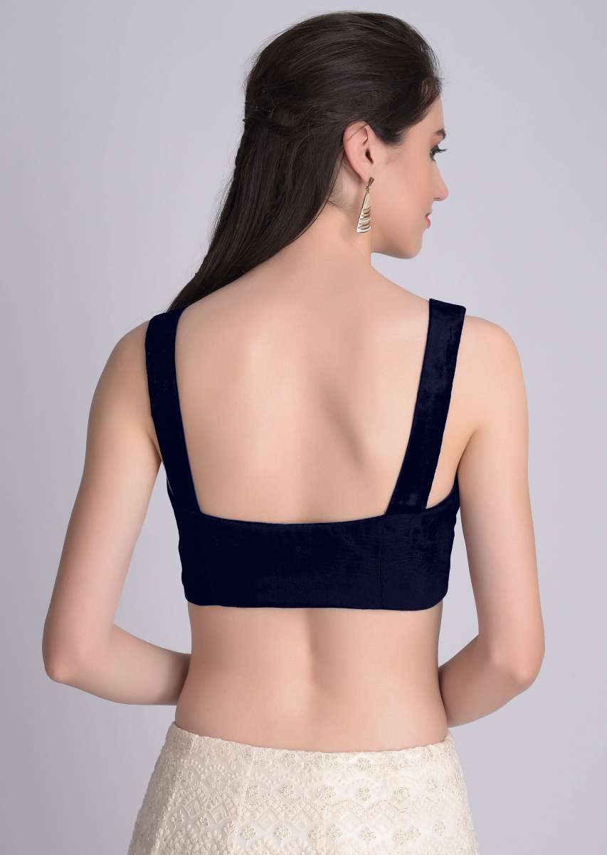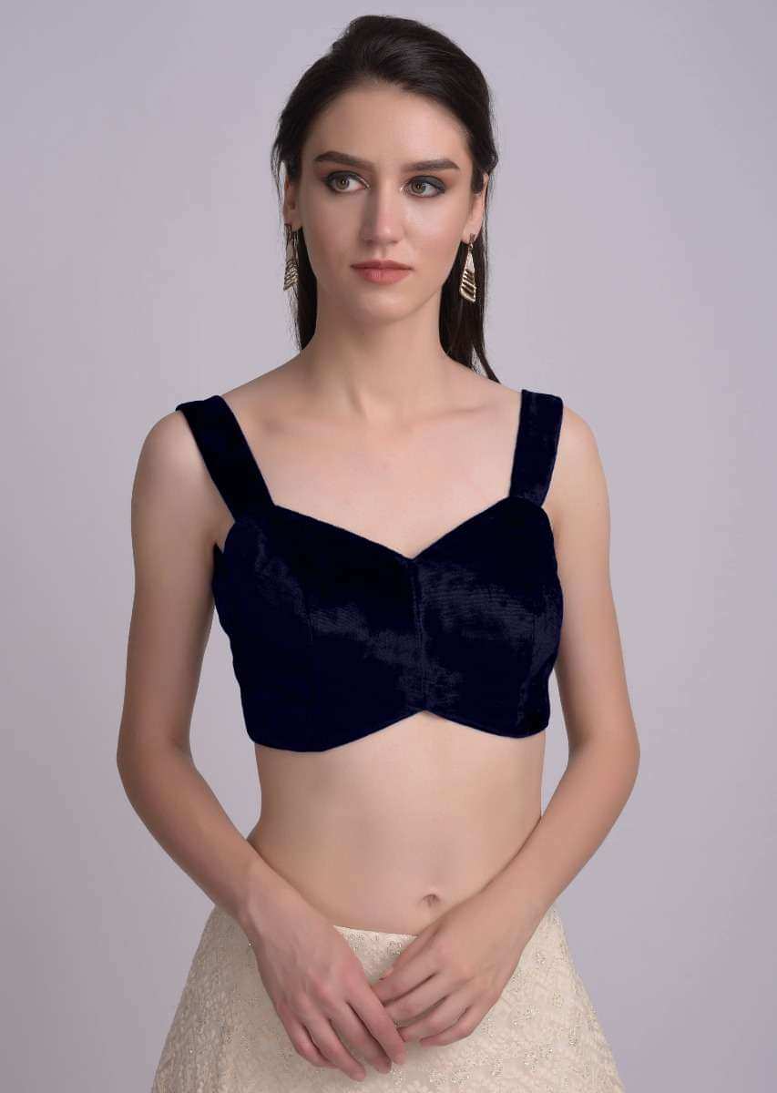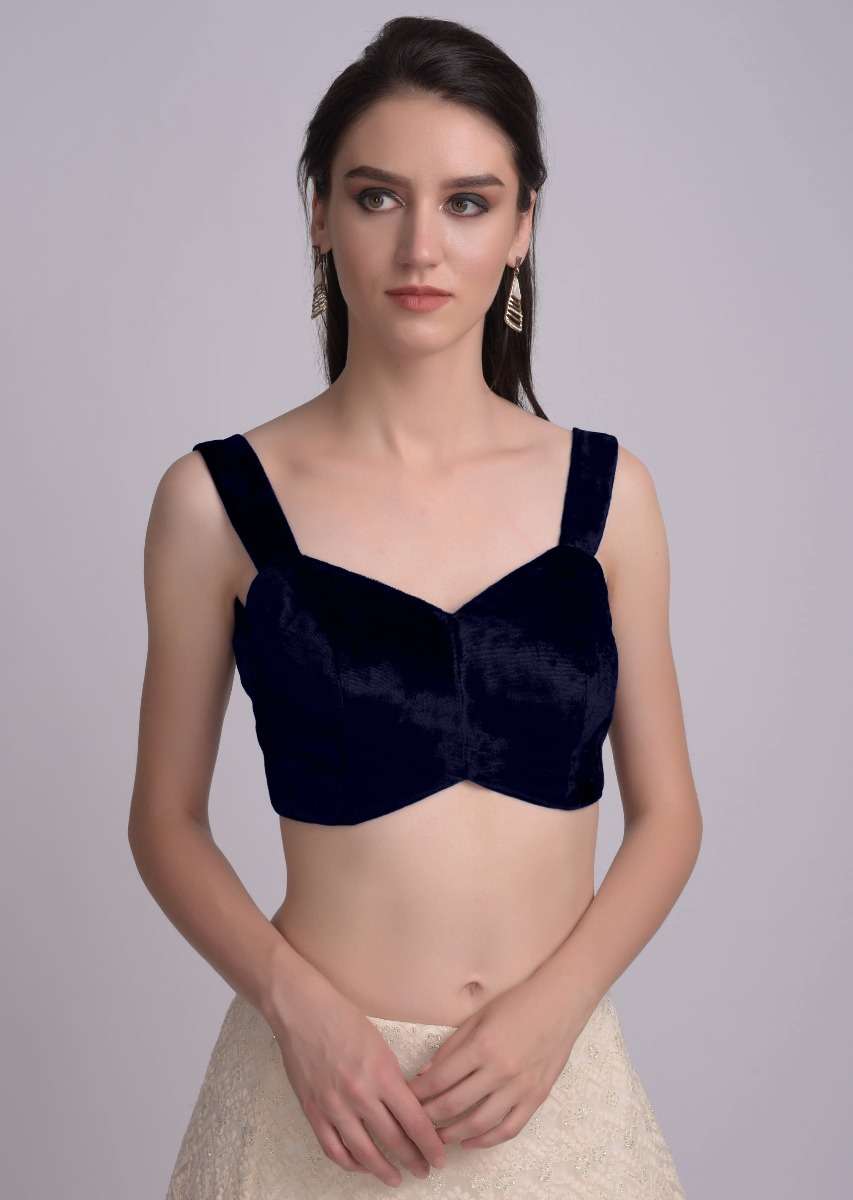 Navy blue Blouse In Velvet With Sweetheart Neckline And Curved Hem