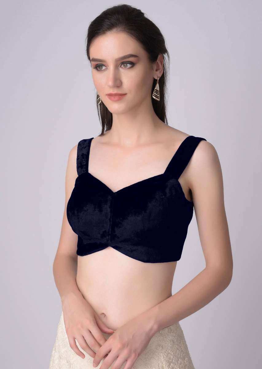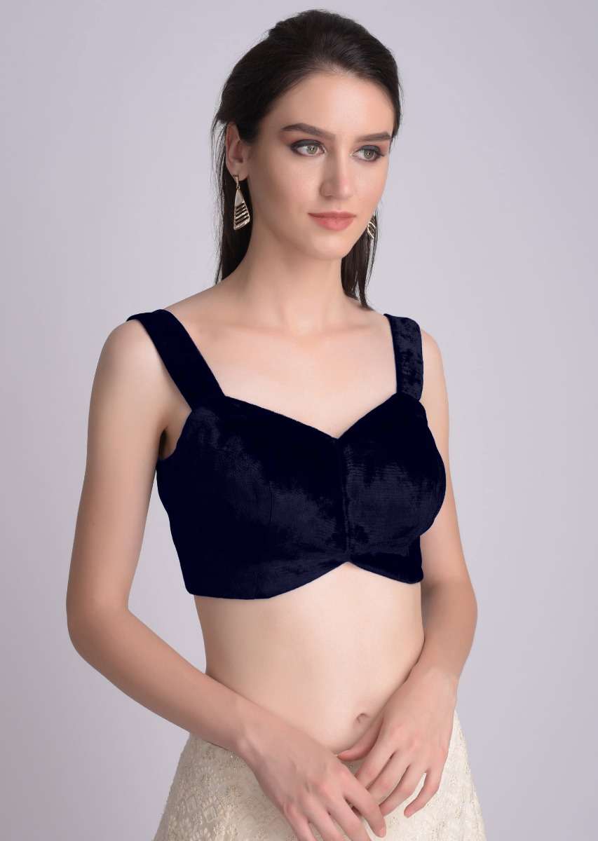 - Navy blue blouse in velvet with sweetheart neckline.