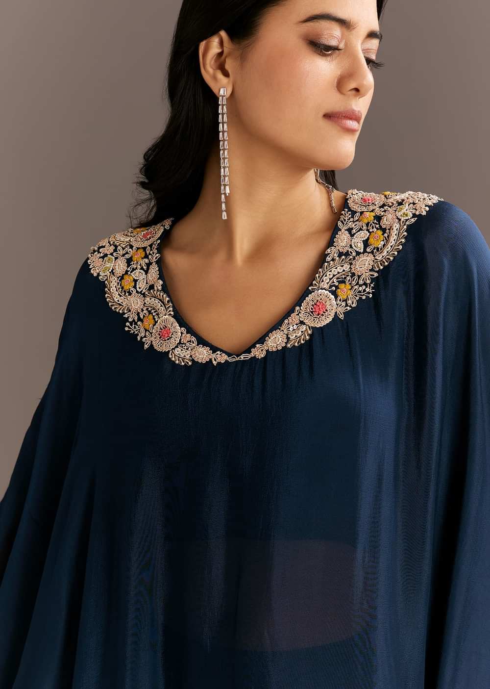 Navy Blue Chinon Cape Style Kurta With Zardosi Neckline