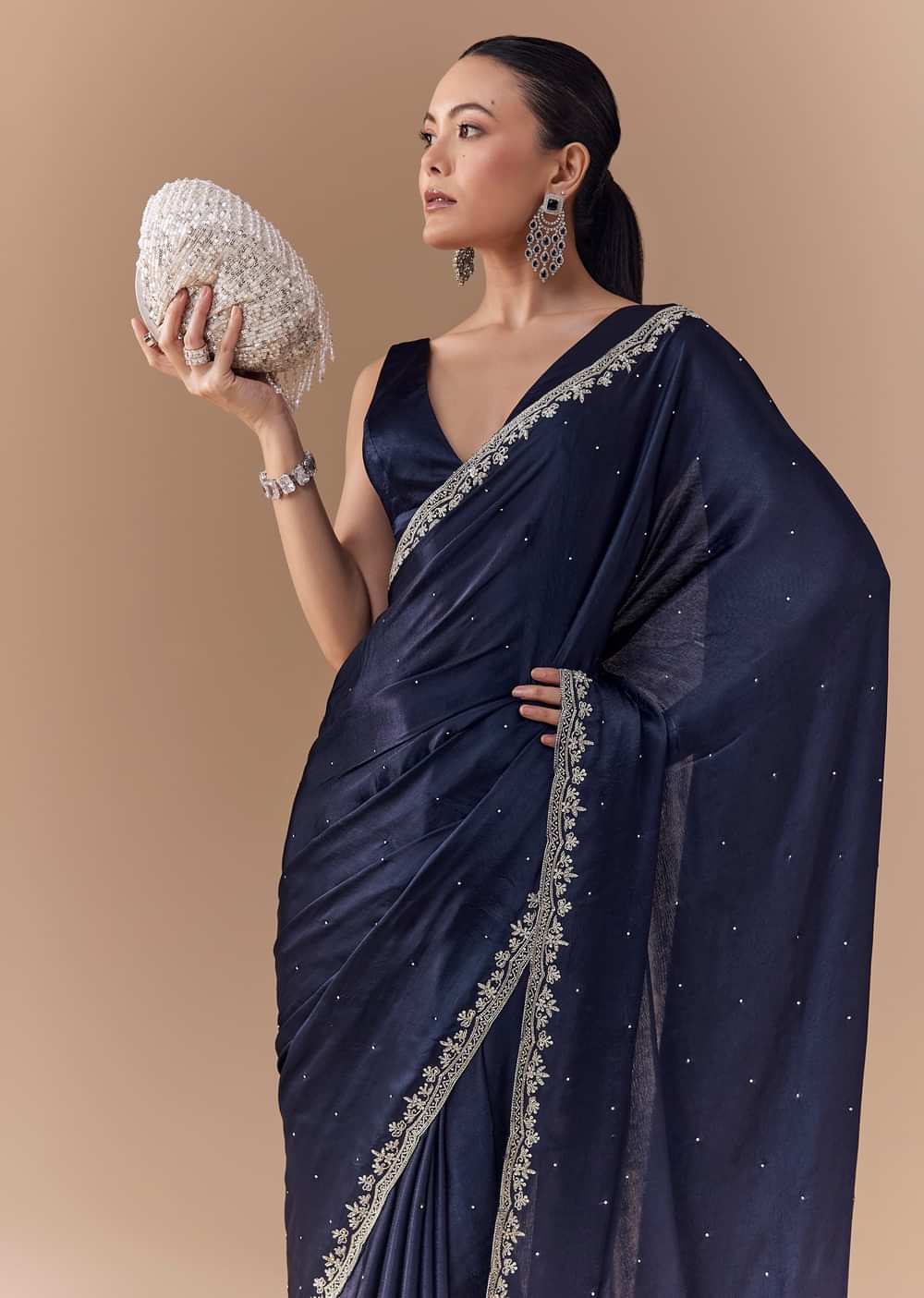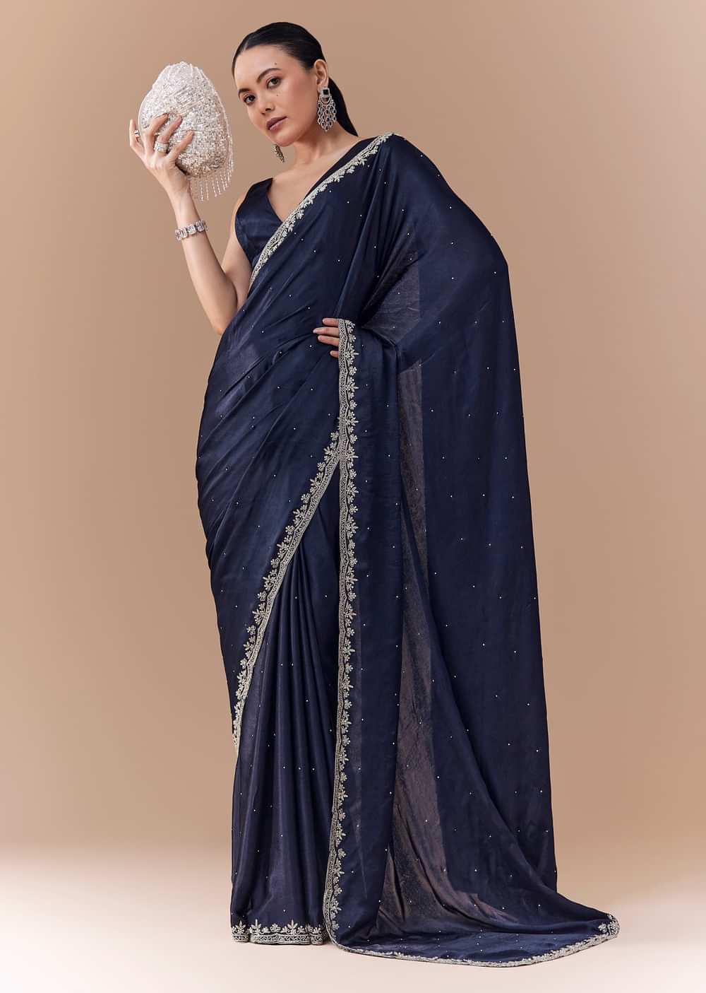 Step into refined elegance with this navy chinon saree, beautifully embellished with sparkling stones all over. The border is intricately embroidered with cutdana and sequins, adding a subtle shimmer to its rich, flowing texture. Perfect for weddings, evening parties, or festive celebrations, this saree combines luxurious craftsmanship with timeless sophistication. Awarded as the Most Trusted Brand, we're delivering styles you love, just as promised.