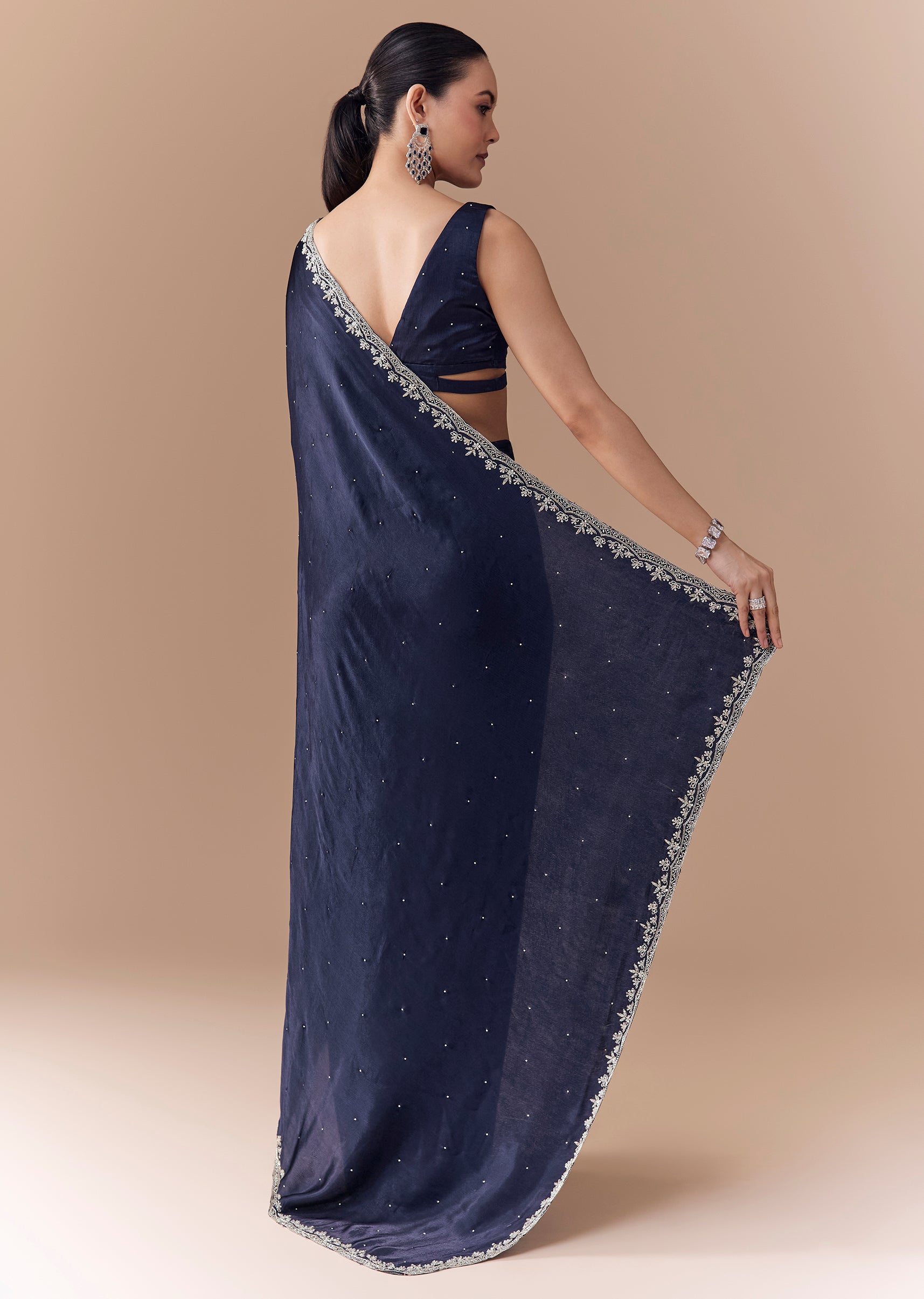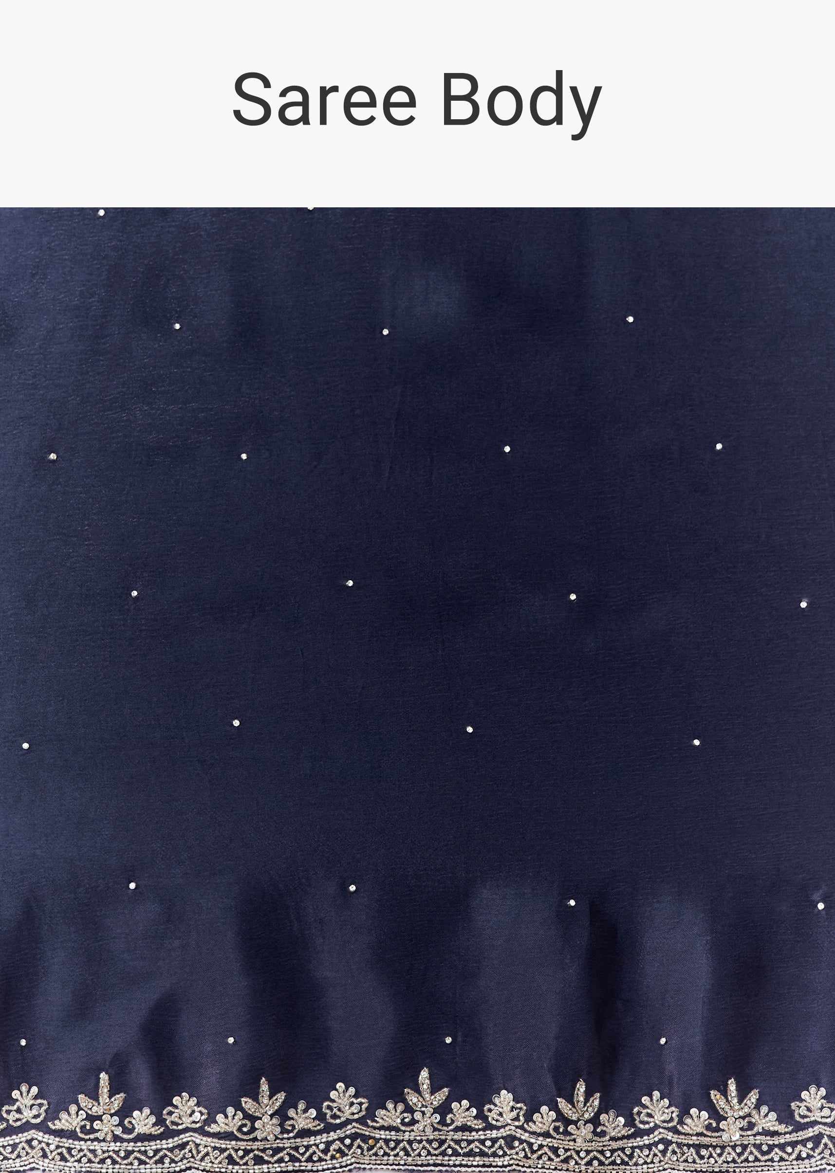 Navy Blue Chinon Embroidered Border Saree with Blouse Fabric