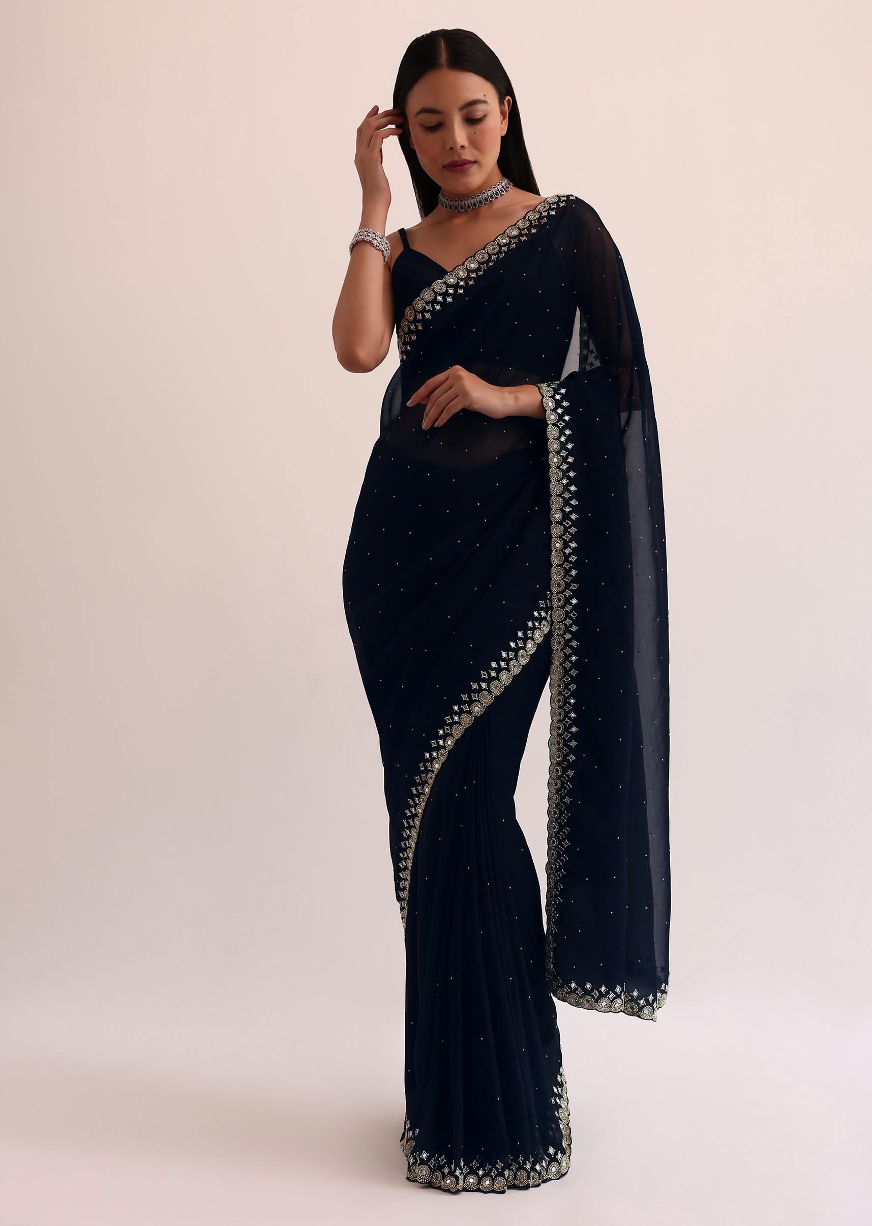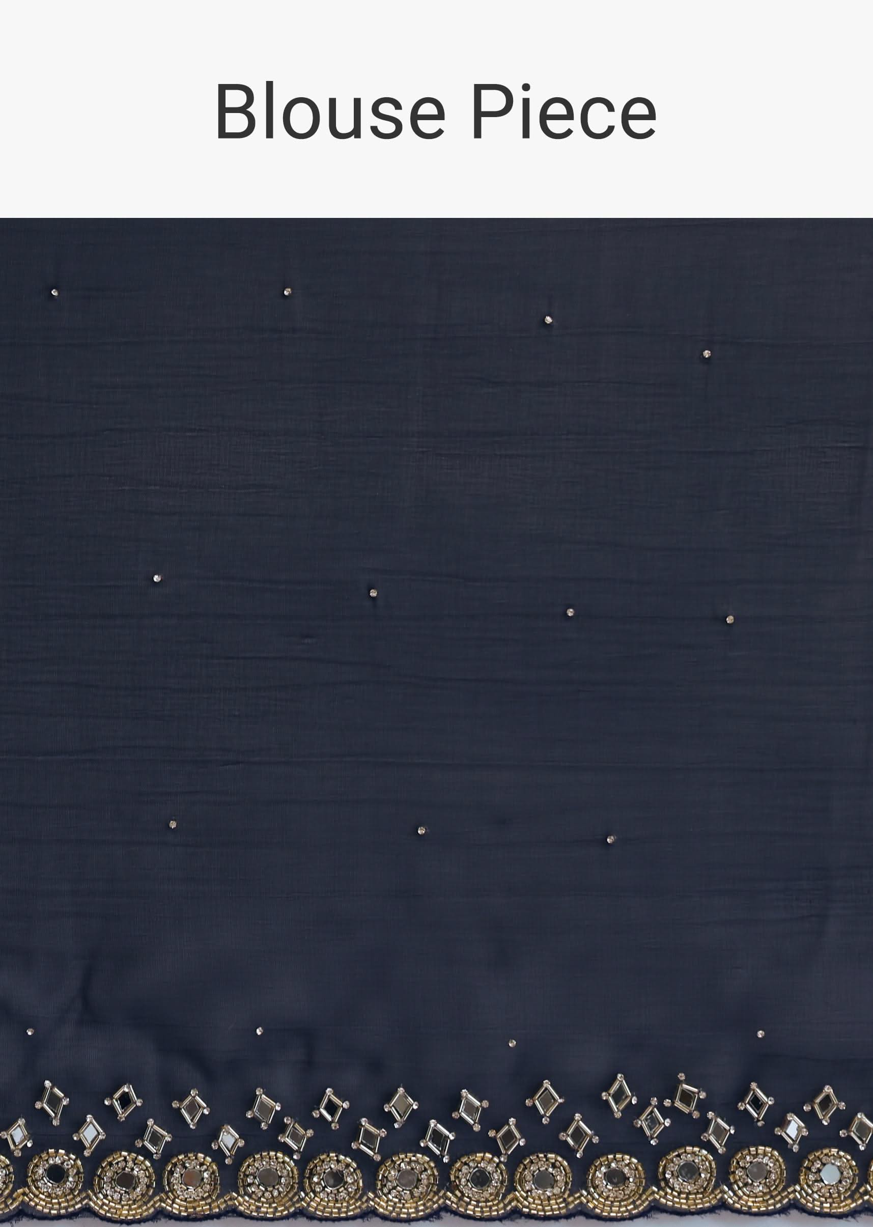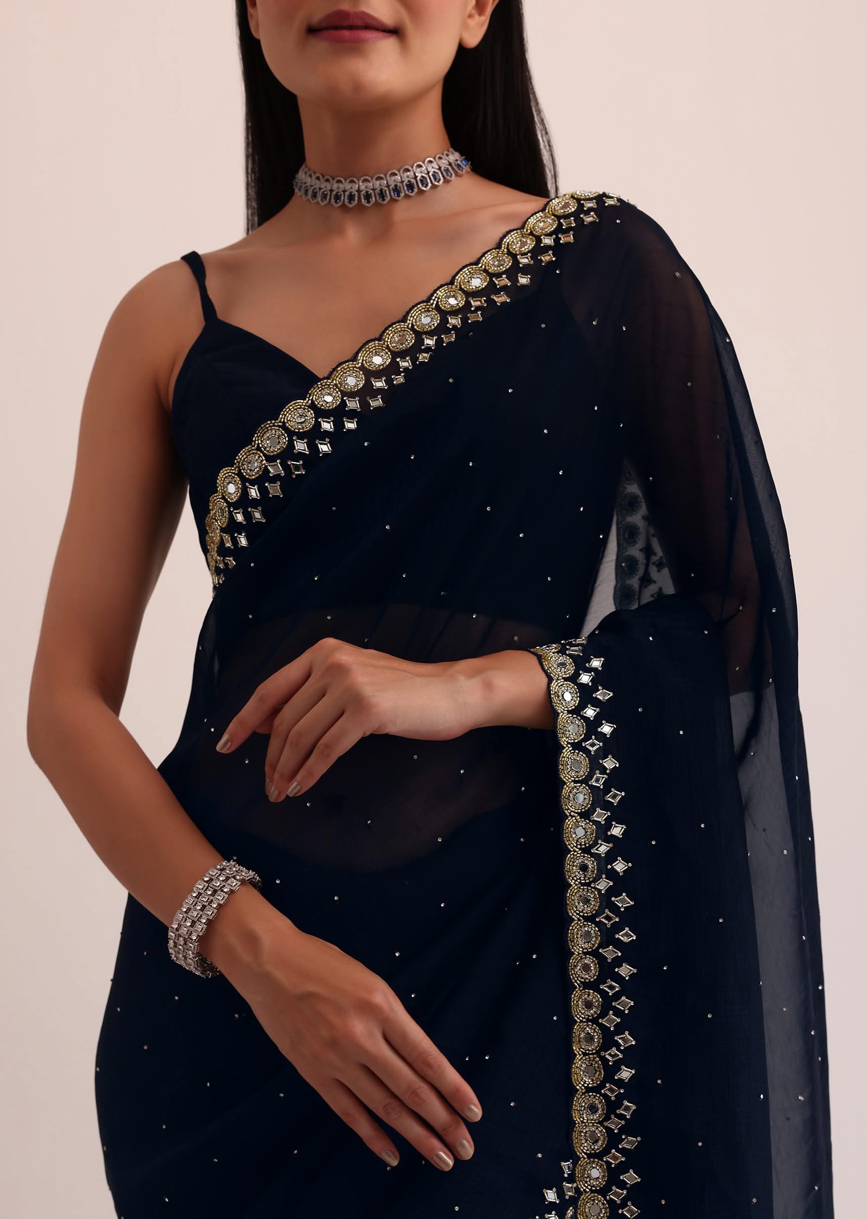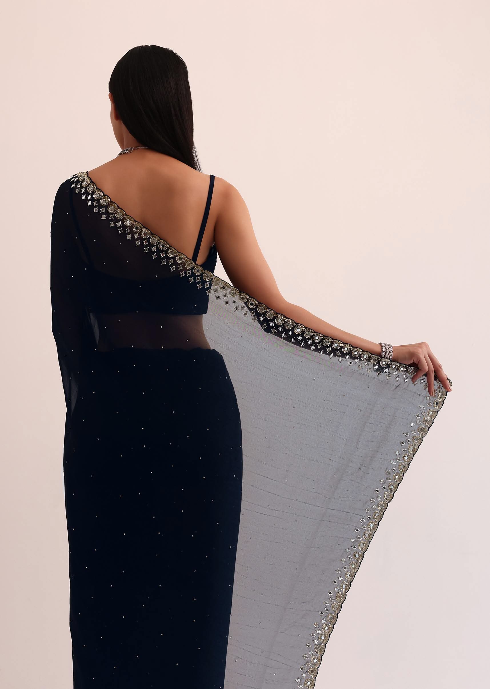 Navy Blue Chinon Saree With Mirror Embroidery And Unstitched Blouse