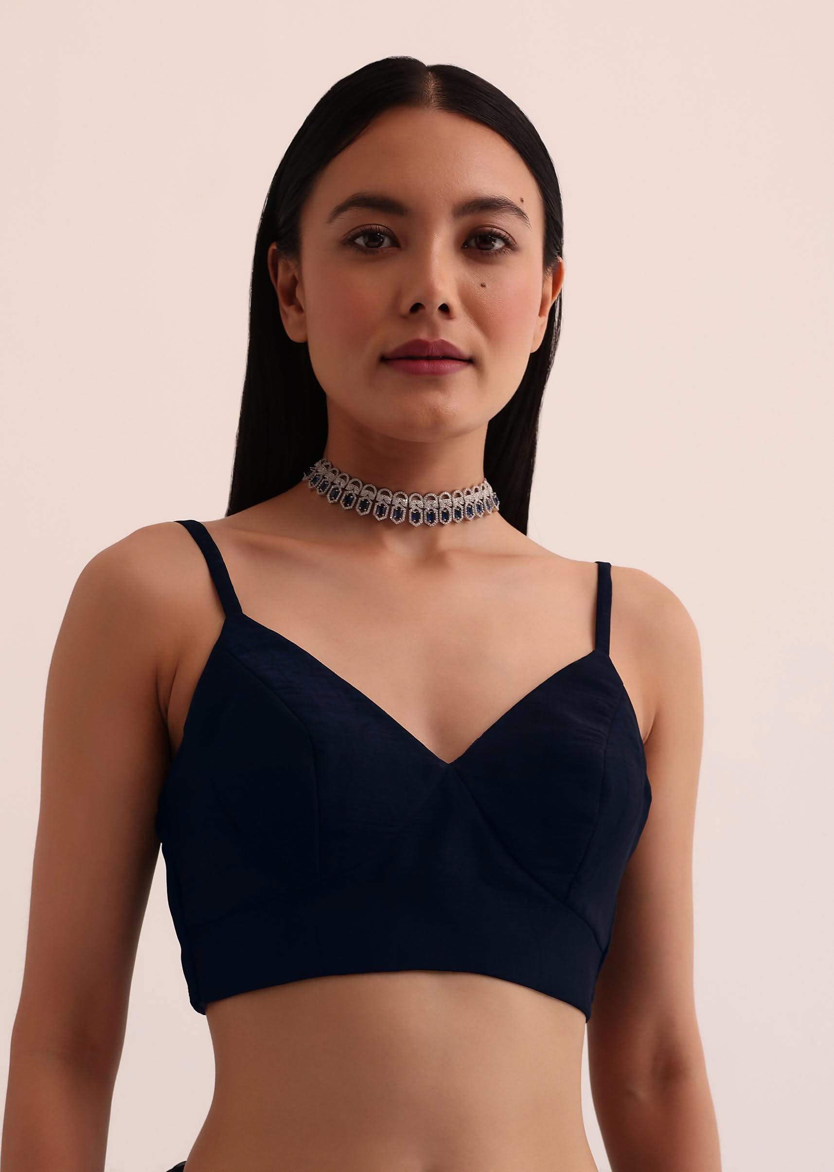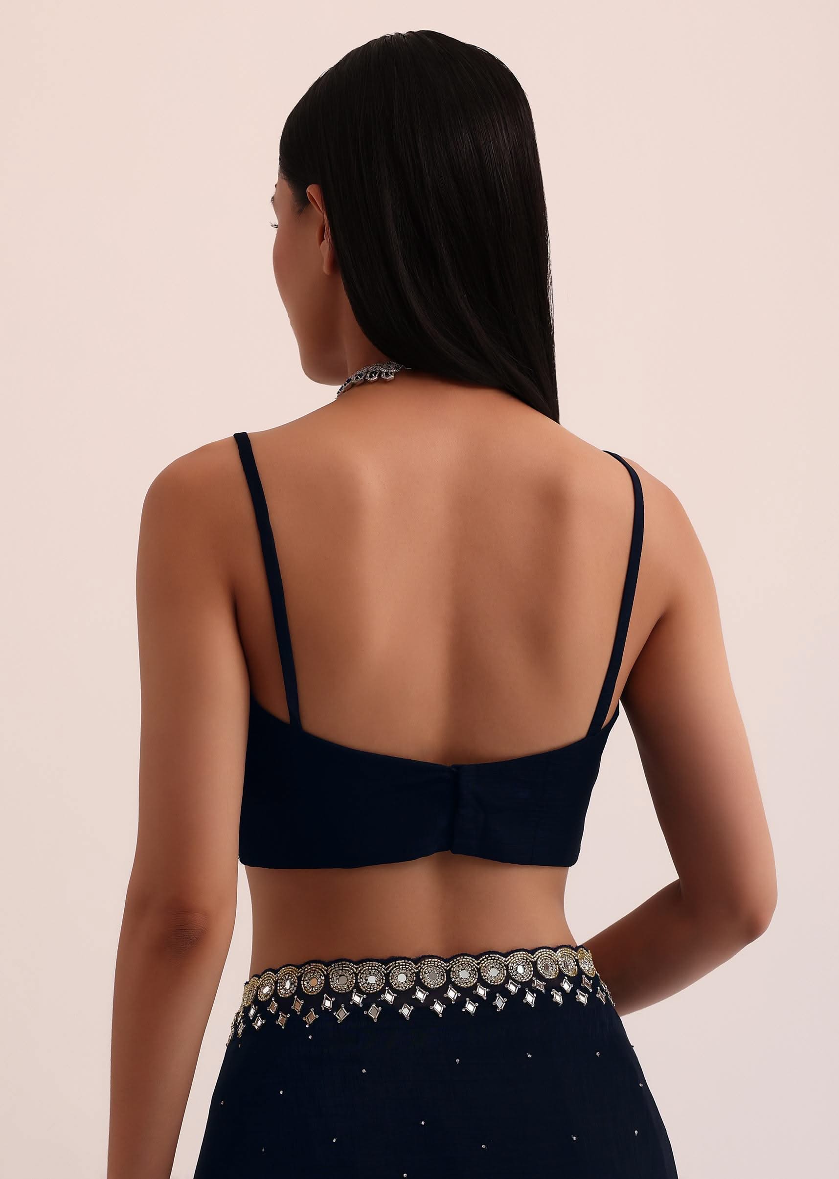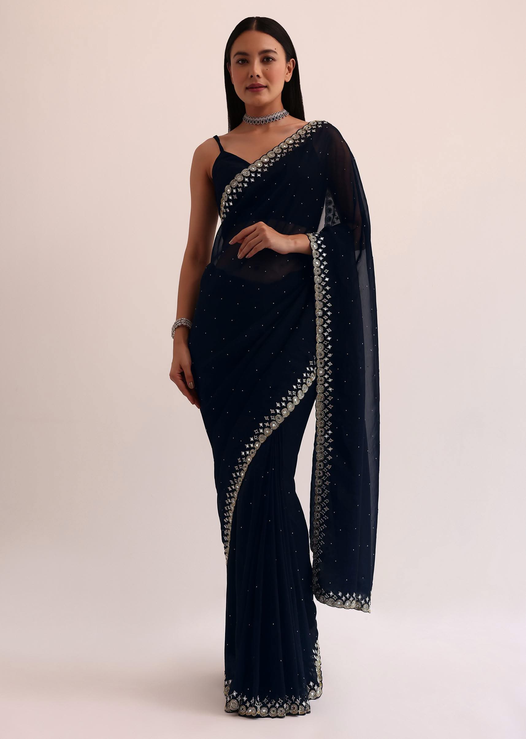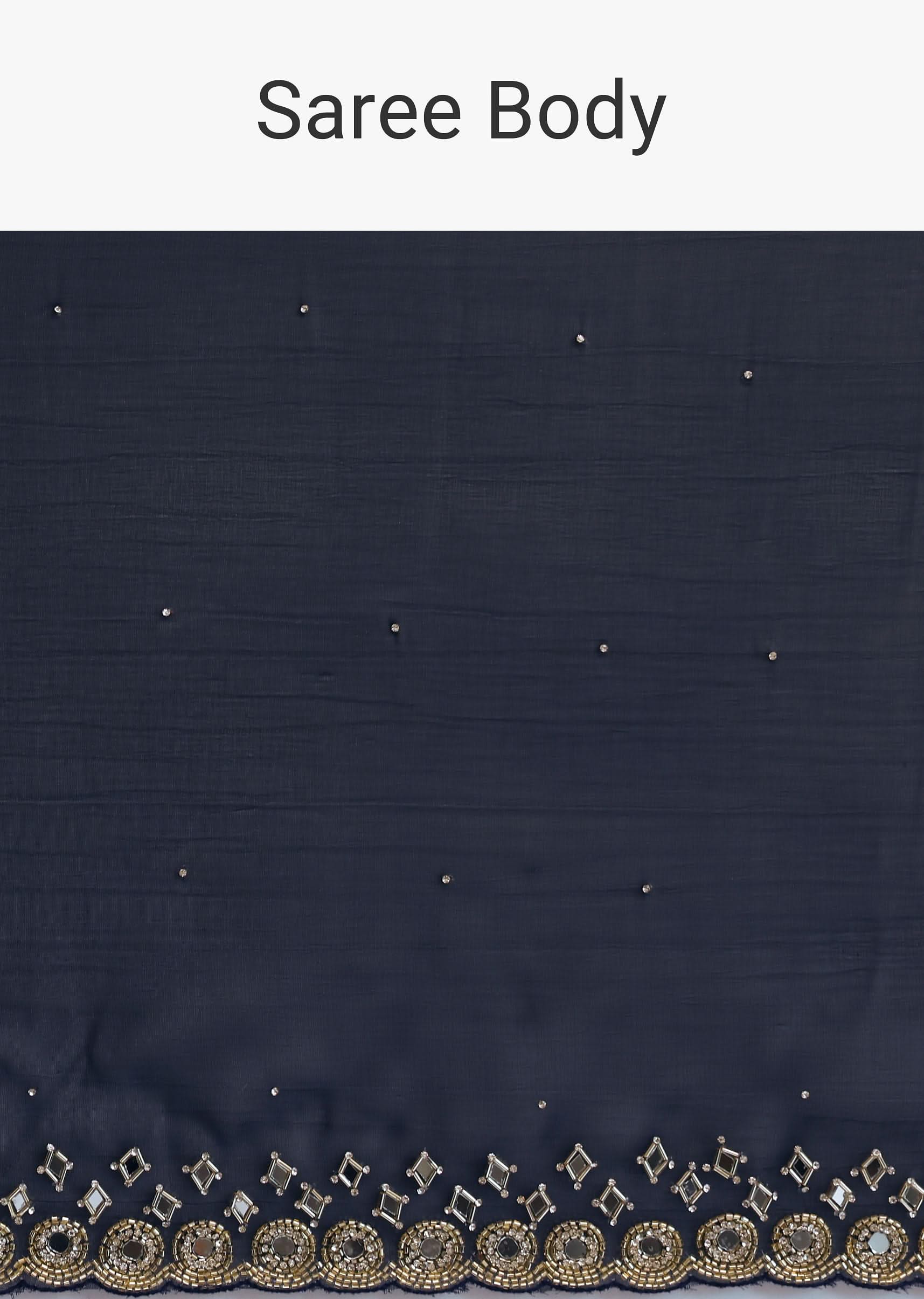 Navy Blue Chinon Saree With Mirror Embroidery And Unstitched Blouse