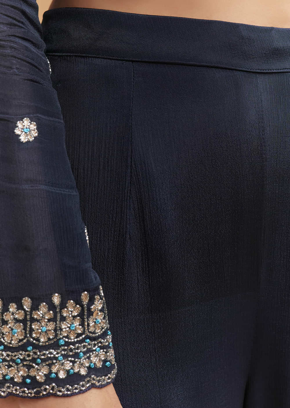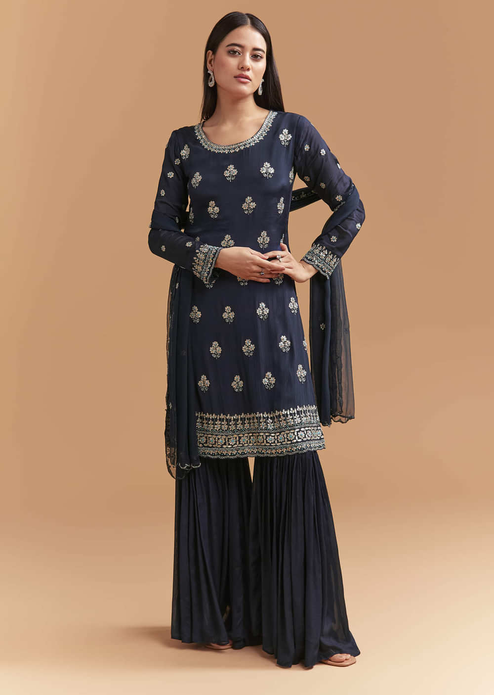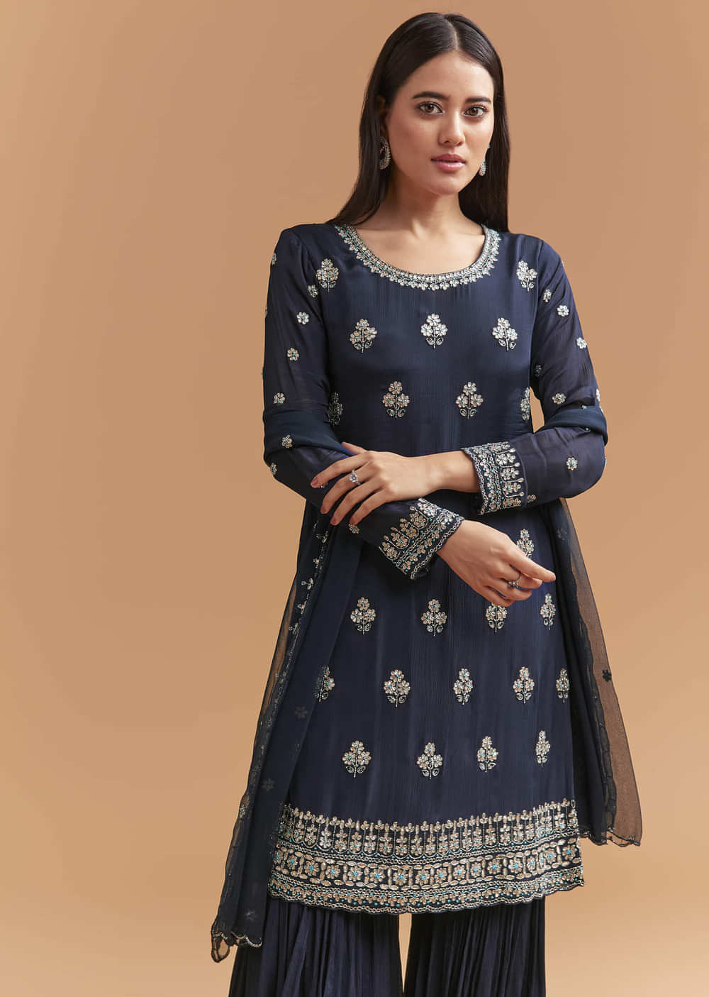 Evening-strong and graceful, this navy blue chinon sharara suit balances rich colour with a light, fluid fall. The kurta is finished with focused cutdana embroidery for crisp highlights in motion.... More Product Details