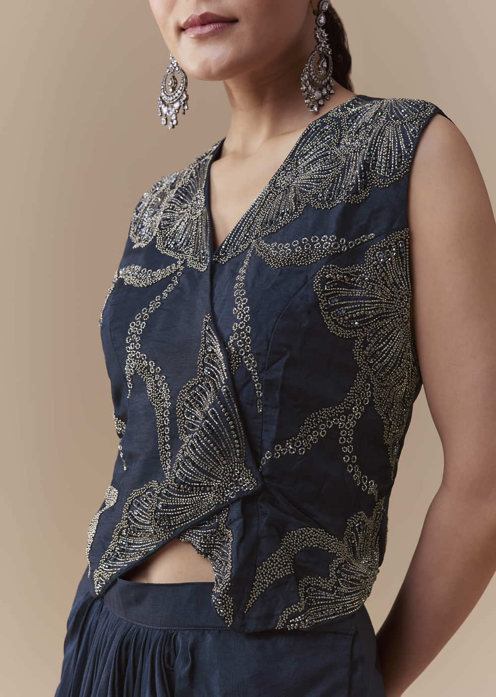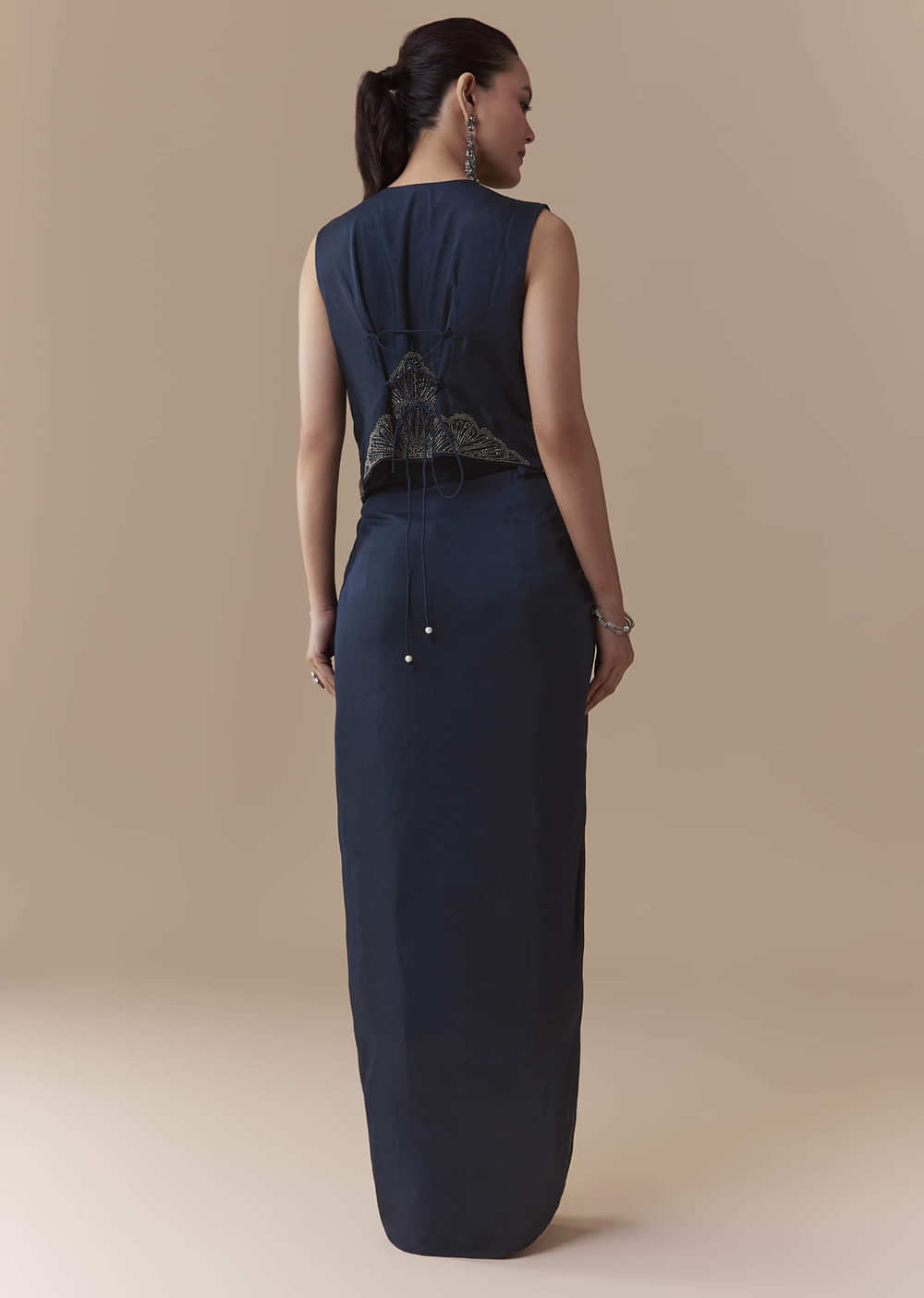 Navy Blue Crop Top and Silk Skirt Set with Cutdana Work