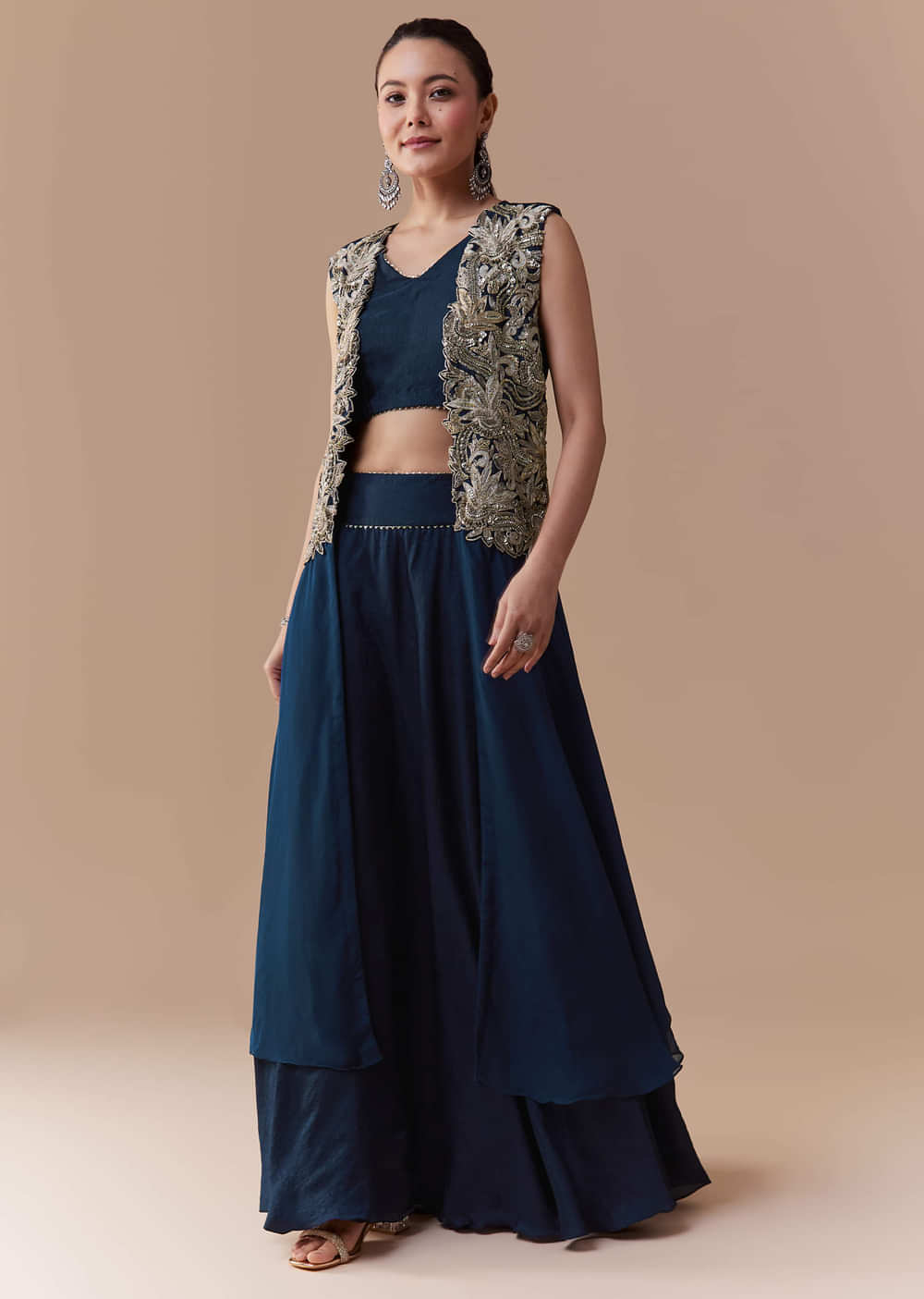 Step into refined elegance with this navy blue silk crop top and skirt set, paired with a stunning jacket adorned with intricate zari, sequin, and bead work. The luxurious silk fabric drapes beautifully, while the embellished jacket adds a touch of opulence and festive charm. Perfect for weddings, receptions, or evening events, this ensemble effortlessly combines tradition with contemporary sophistication. Awarded as the Most Trusted Brand, we're delivering styles you love, just as promised.