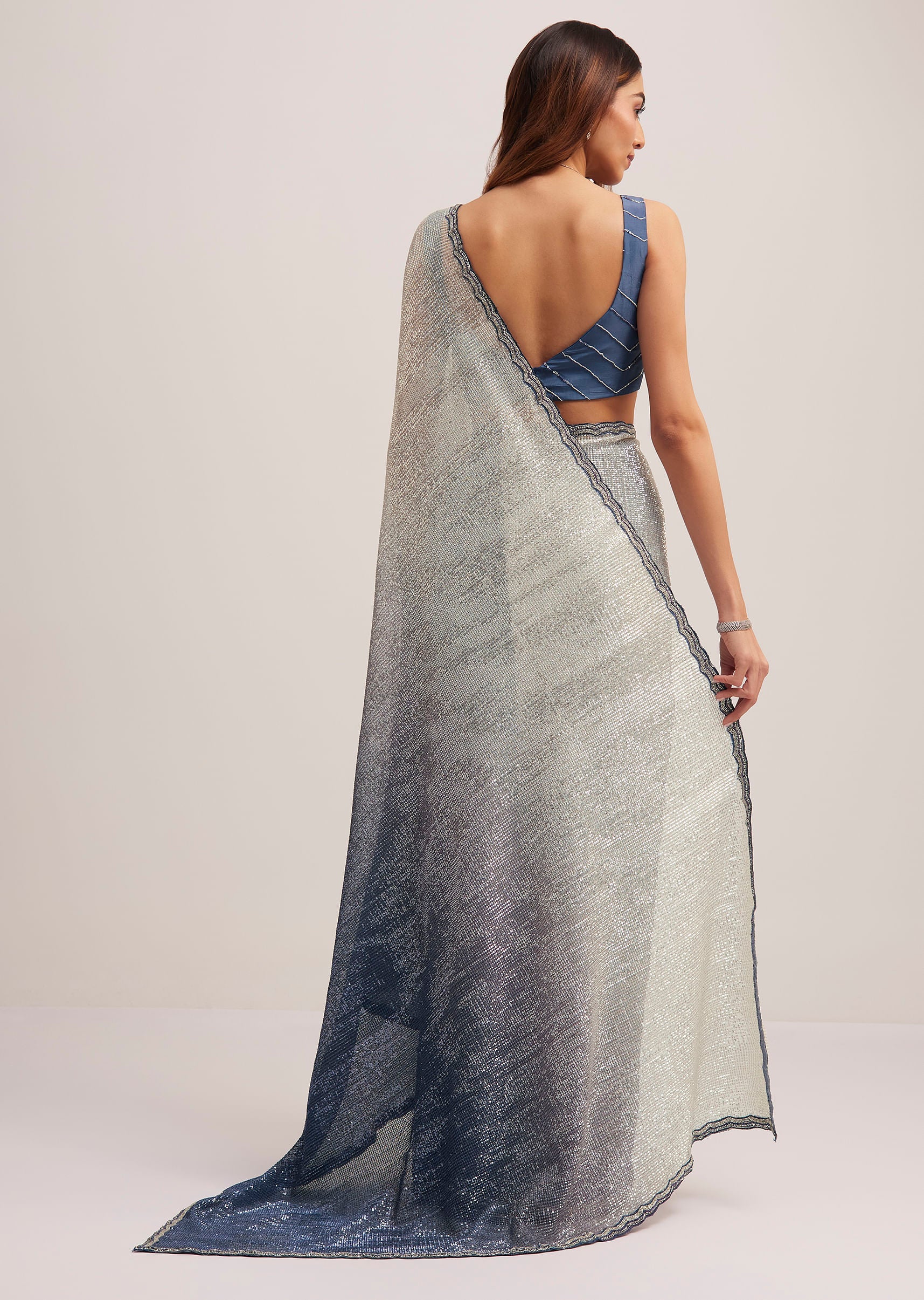 Navy Blue Dual Shaded Sequins Saree With Scalloped Border