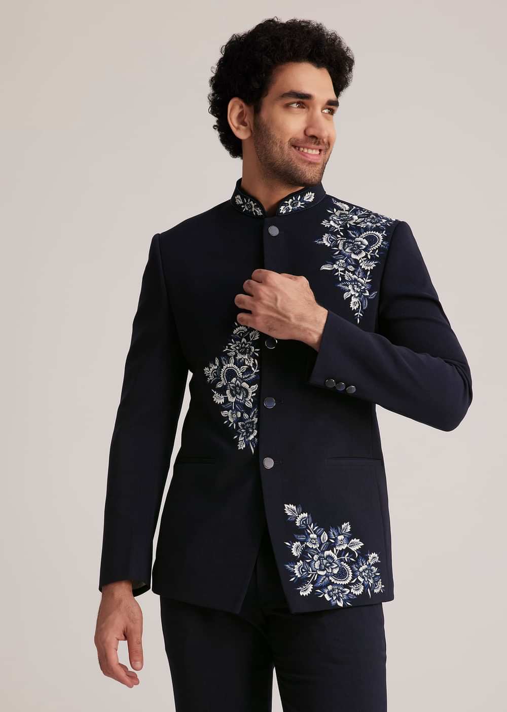 - Step into refined sophistication with this navy blue bandhgala suit, adorned with intricate floral embroidery for a touch of regal elegance.