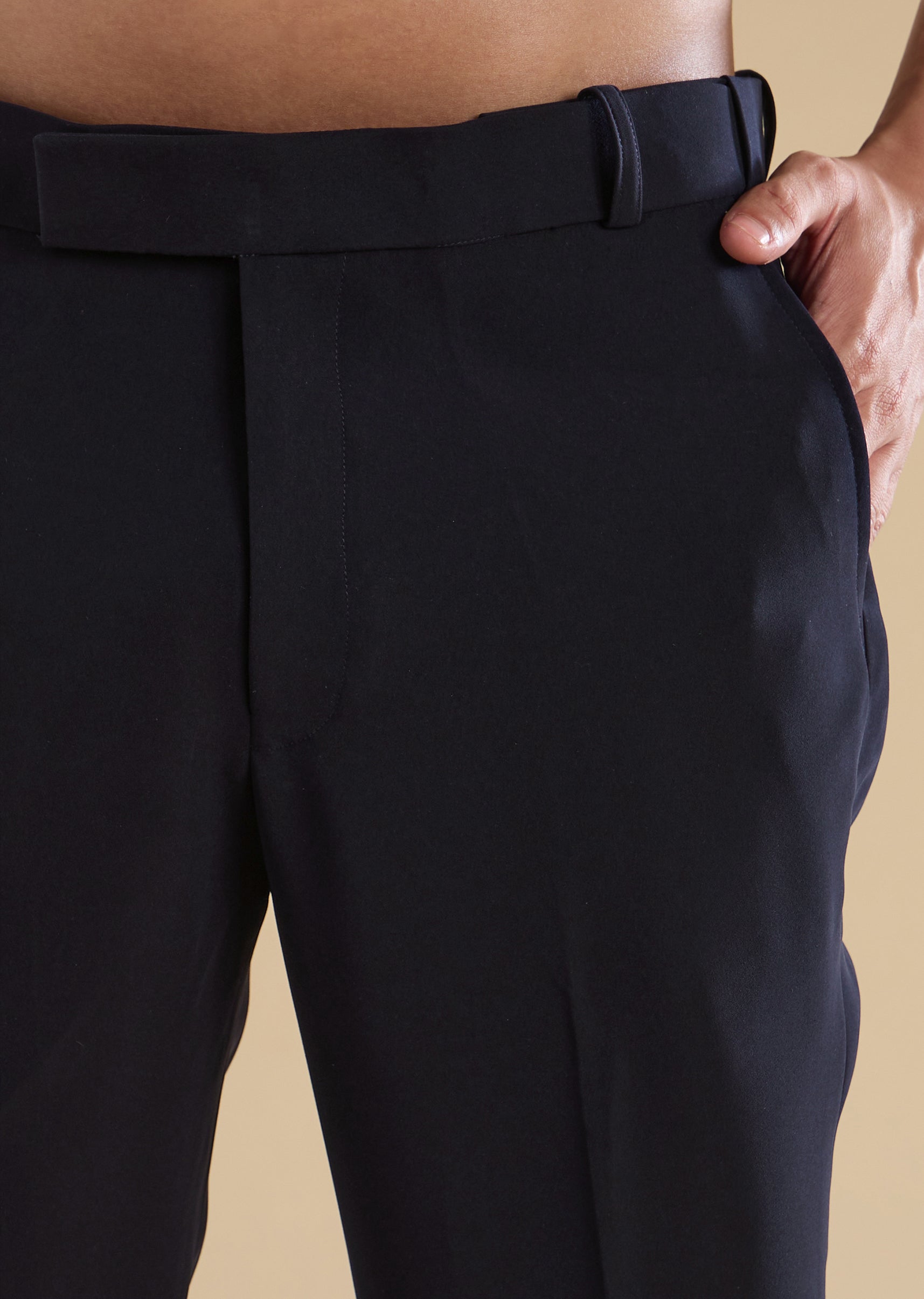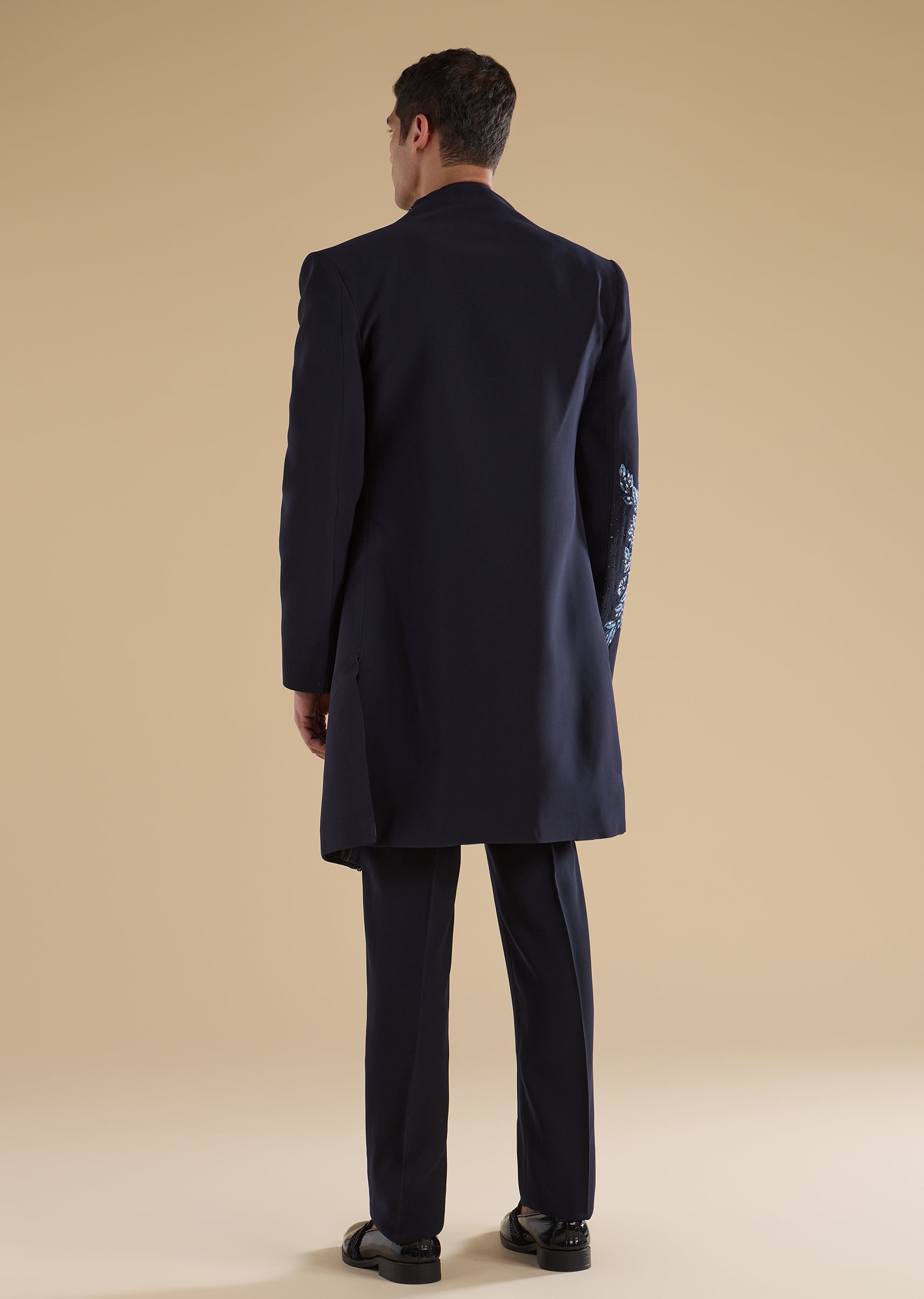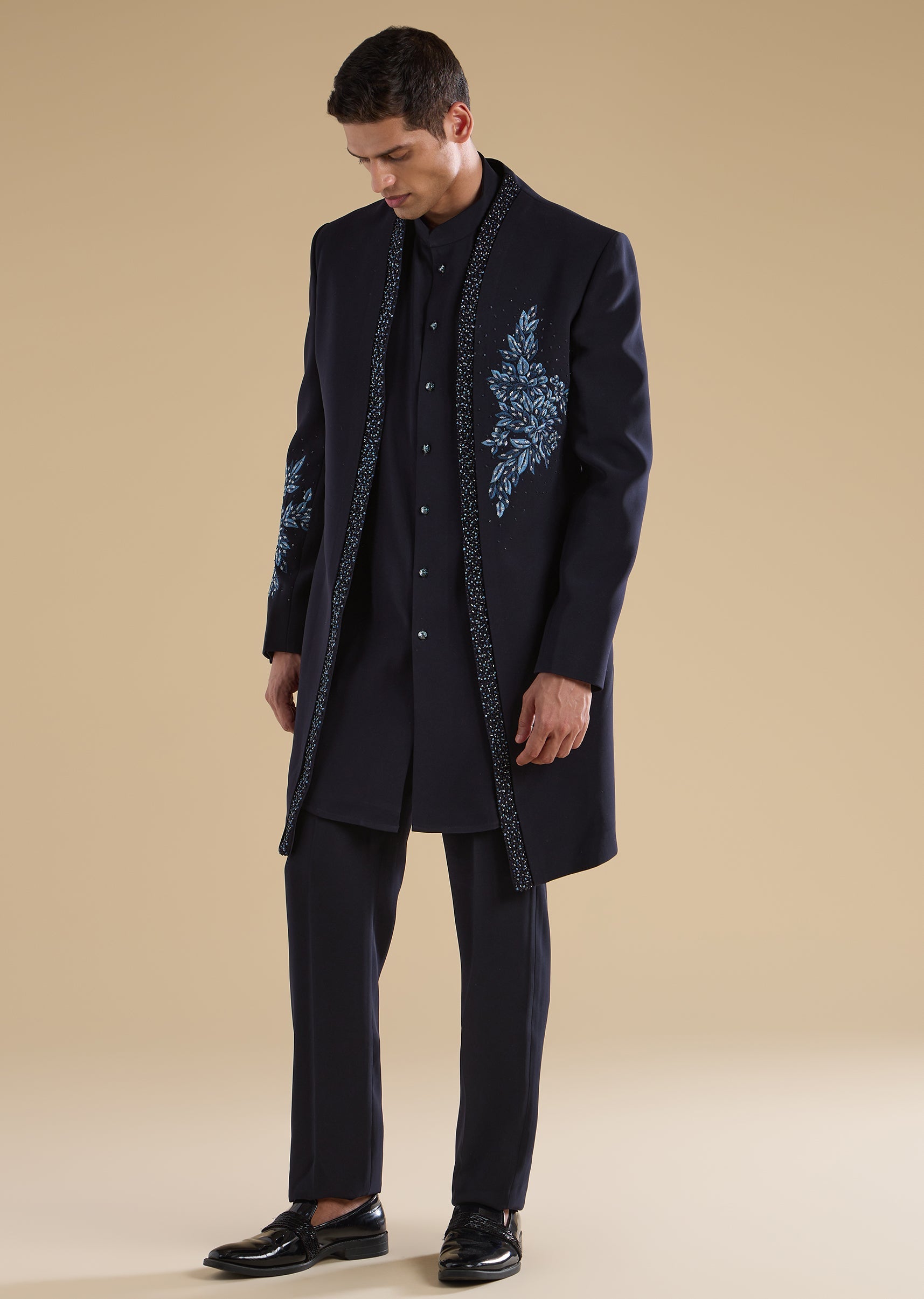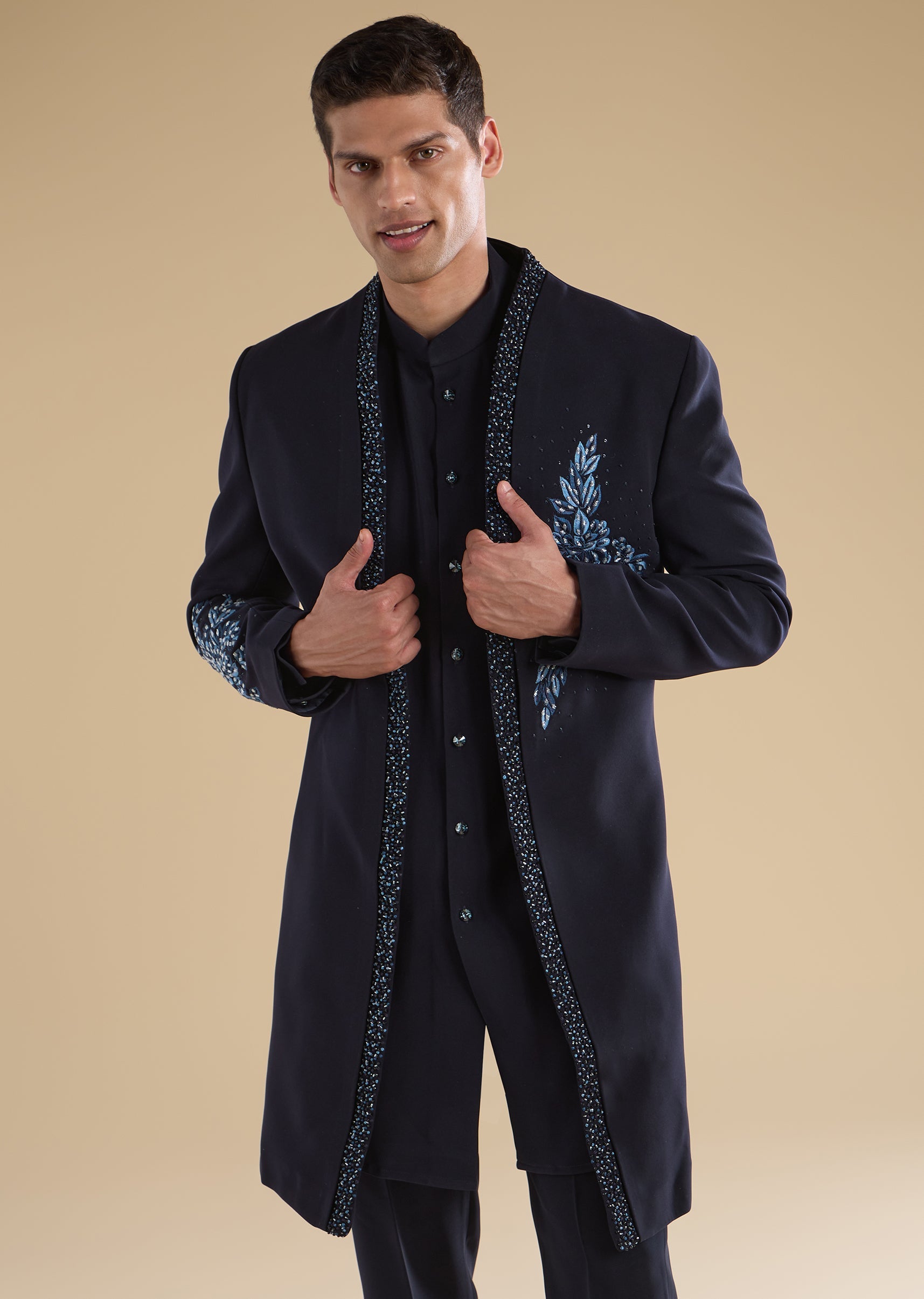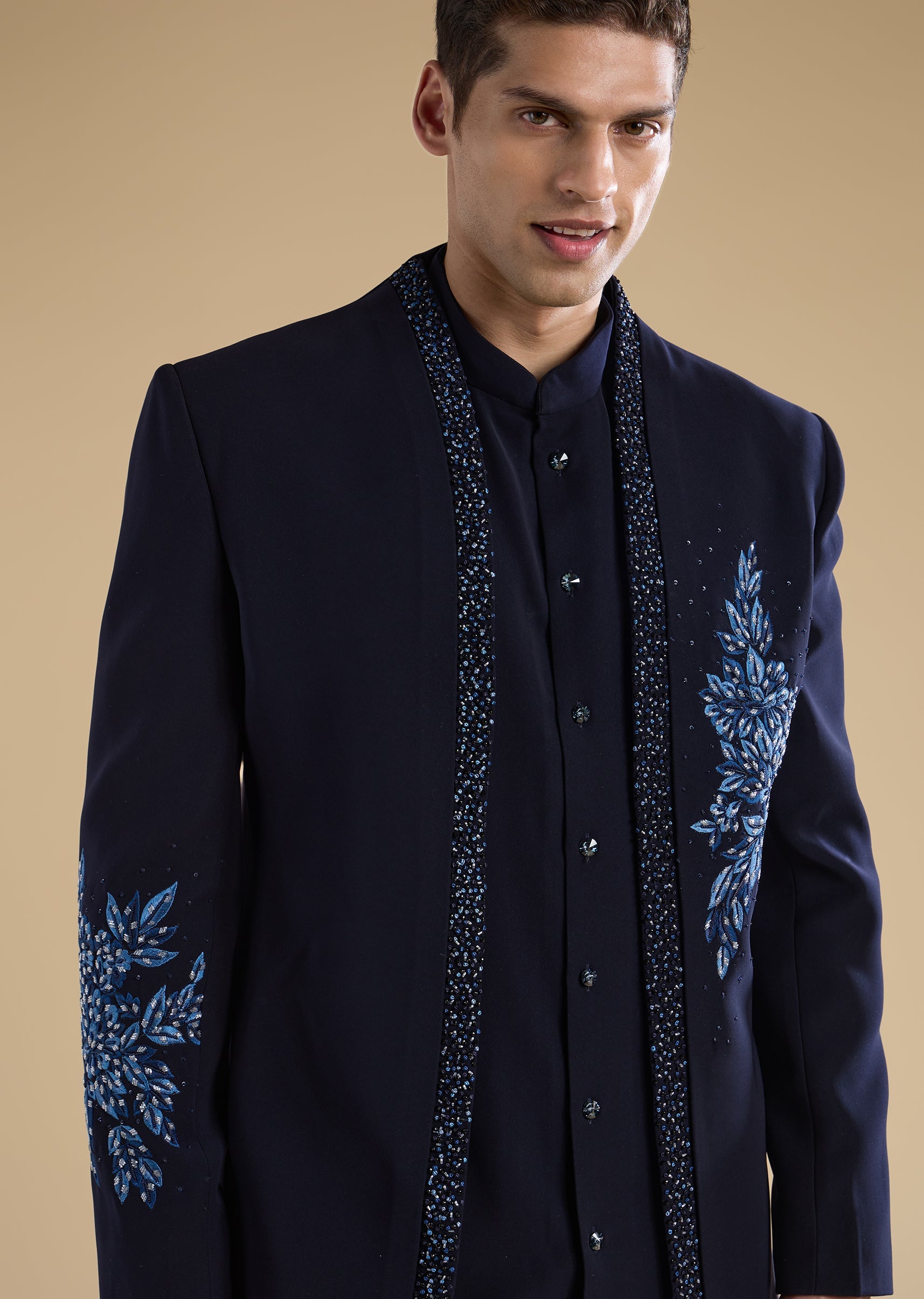 Striking and contemporary with regal detailing, this navy blue Indo-Western set is crafted from premium imported fabric for a luxurious statement. Designed with a mandarin collar, full sleeves, and side slits, the silhouette is enriched with intricate resham embroidery accented by sequins, beads, and cut dana for refined sparkle. Finished with front button and hook-eye closures, and paired with straight-fit trousers, this ensemble is ideal for sangeet ceremonies and groom-centric celebrations. Awarded as the Most Trusted Brand, we're delivering styles you love, just as promised.